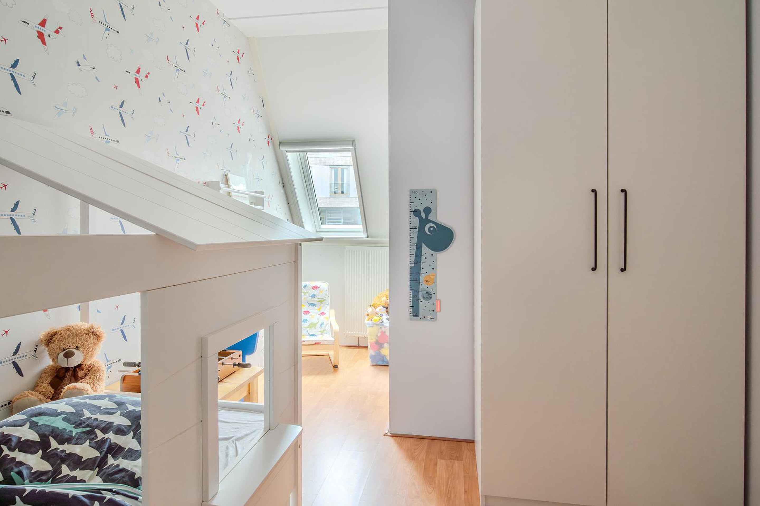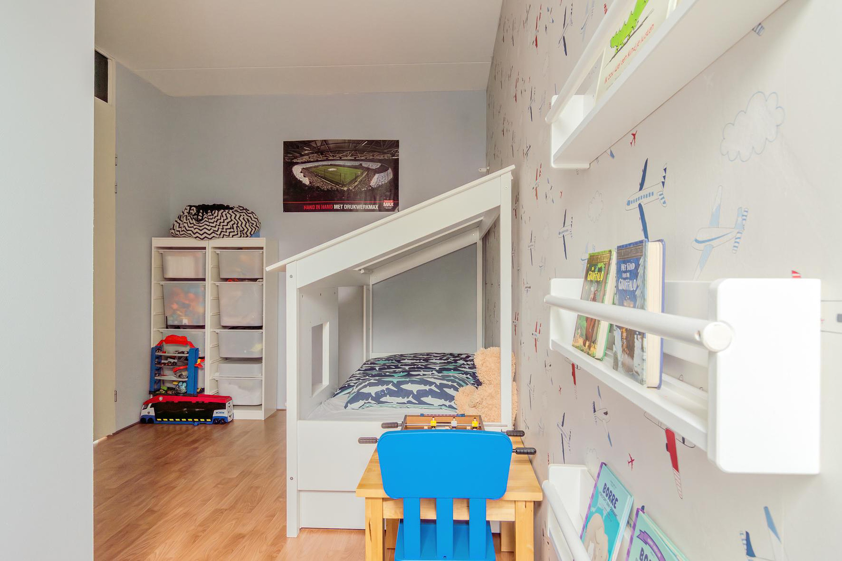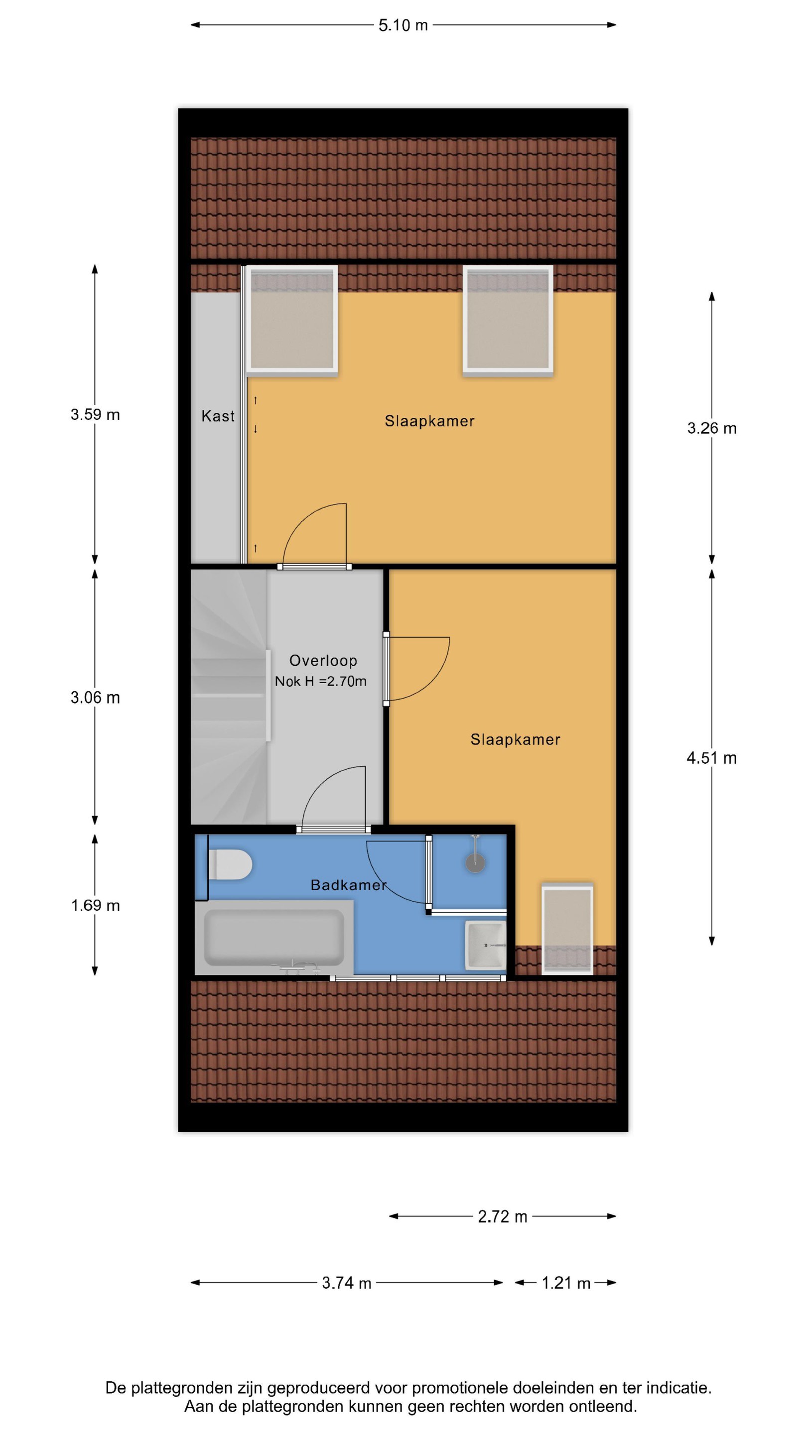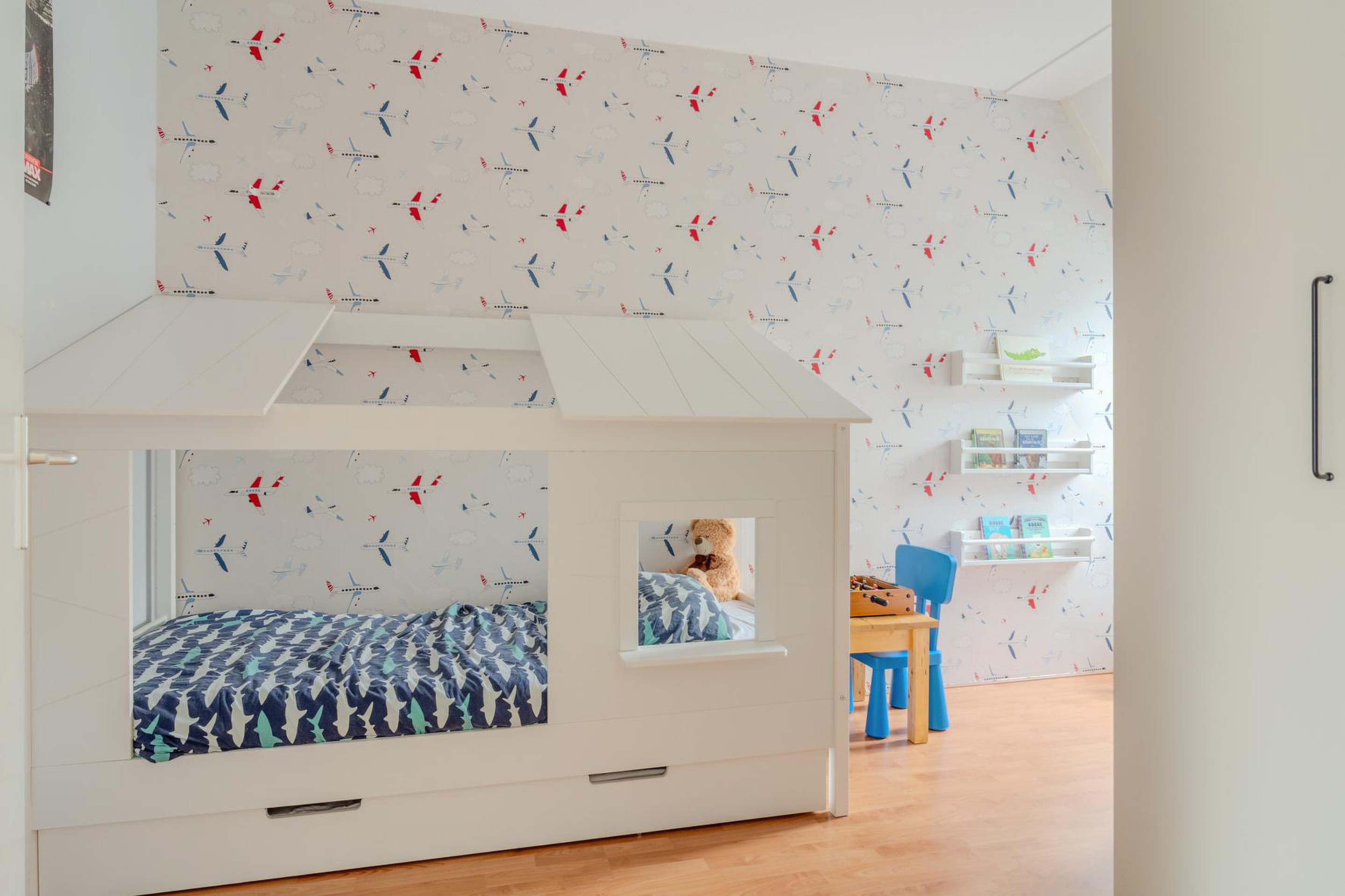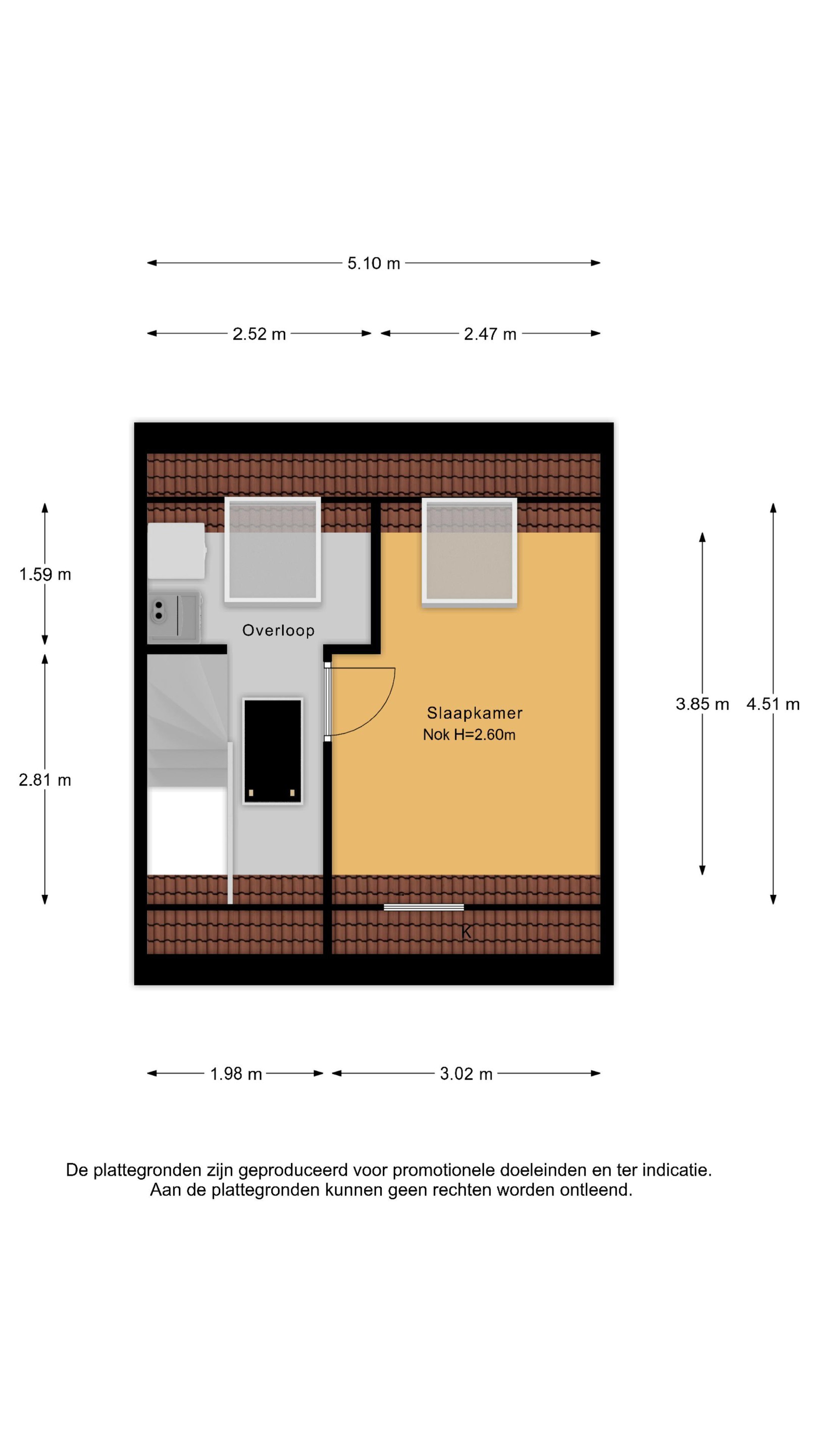 Via de vaste trap kom je op de overloop van de tweede verdieping, welke toegang geeft tot de derde slaapkamer (3.02 x 4.51). Zowel de slaapkamer als de overloop zijn voorzien van een dakraam aan de achterzijde. Er is de mogelijkheid om de dakramen te vervangen voor een dakkapel waardoor je veel ruimtewinst kunt pakken. Op de overloop zijn de Cv-ketel en box van de mechanische ventilatie gesitueerd met opstelplaats voor de wasmachine en droger. Achter de knieschotten is ruimte voor extra berging. Deze verdieping is voorzien van een laminaat afwerkvloer.