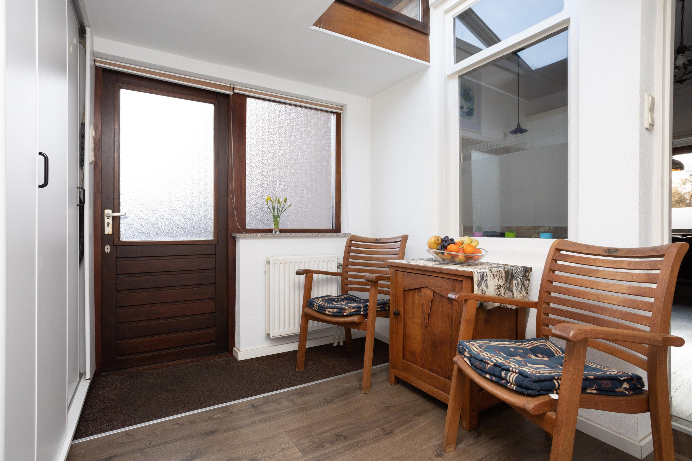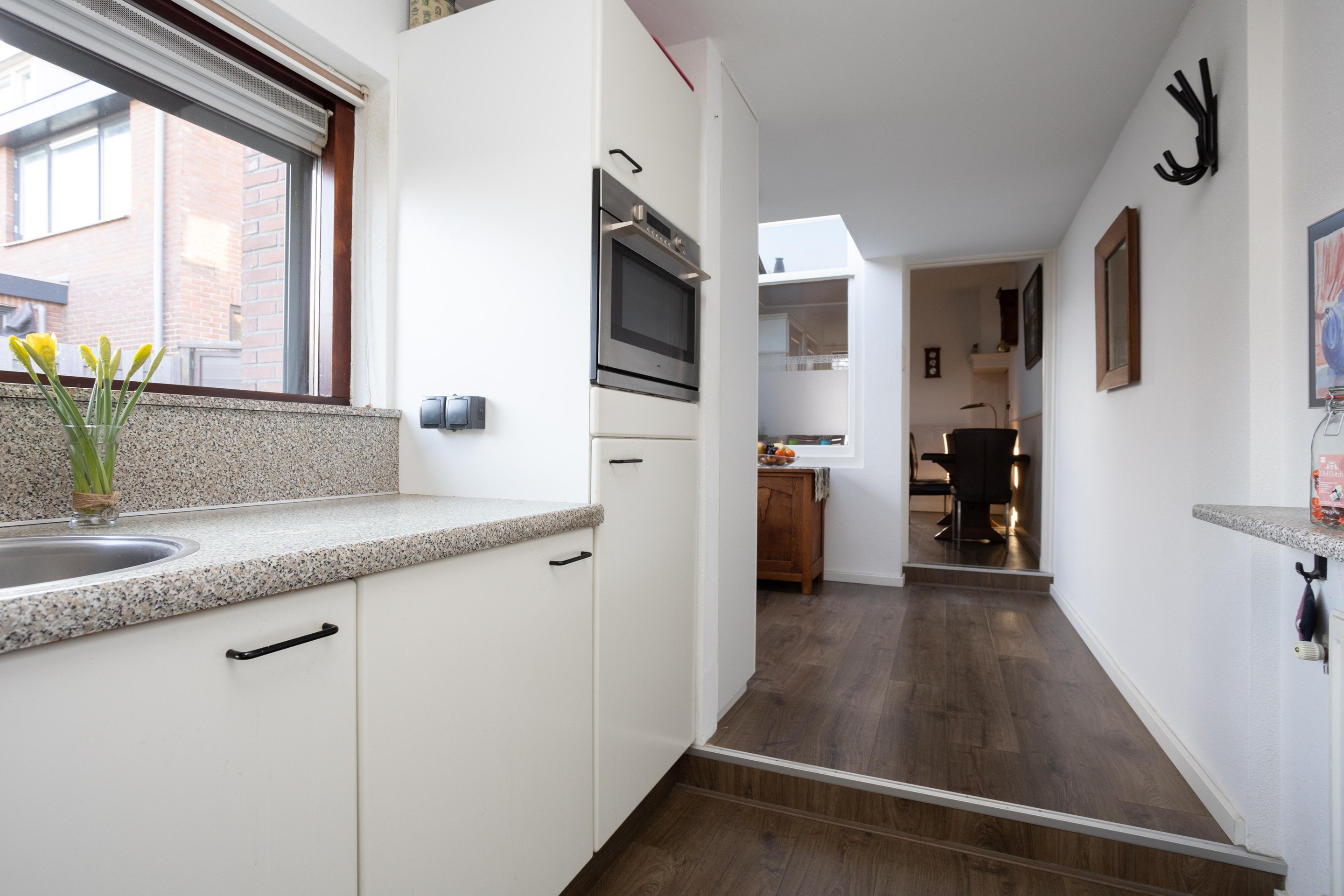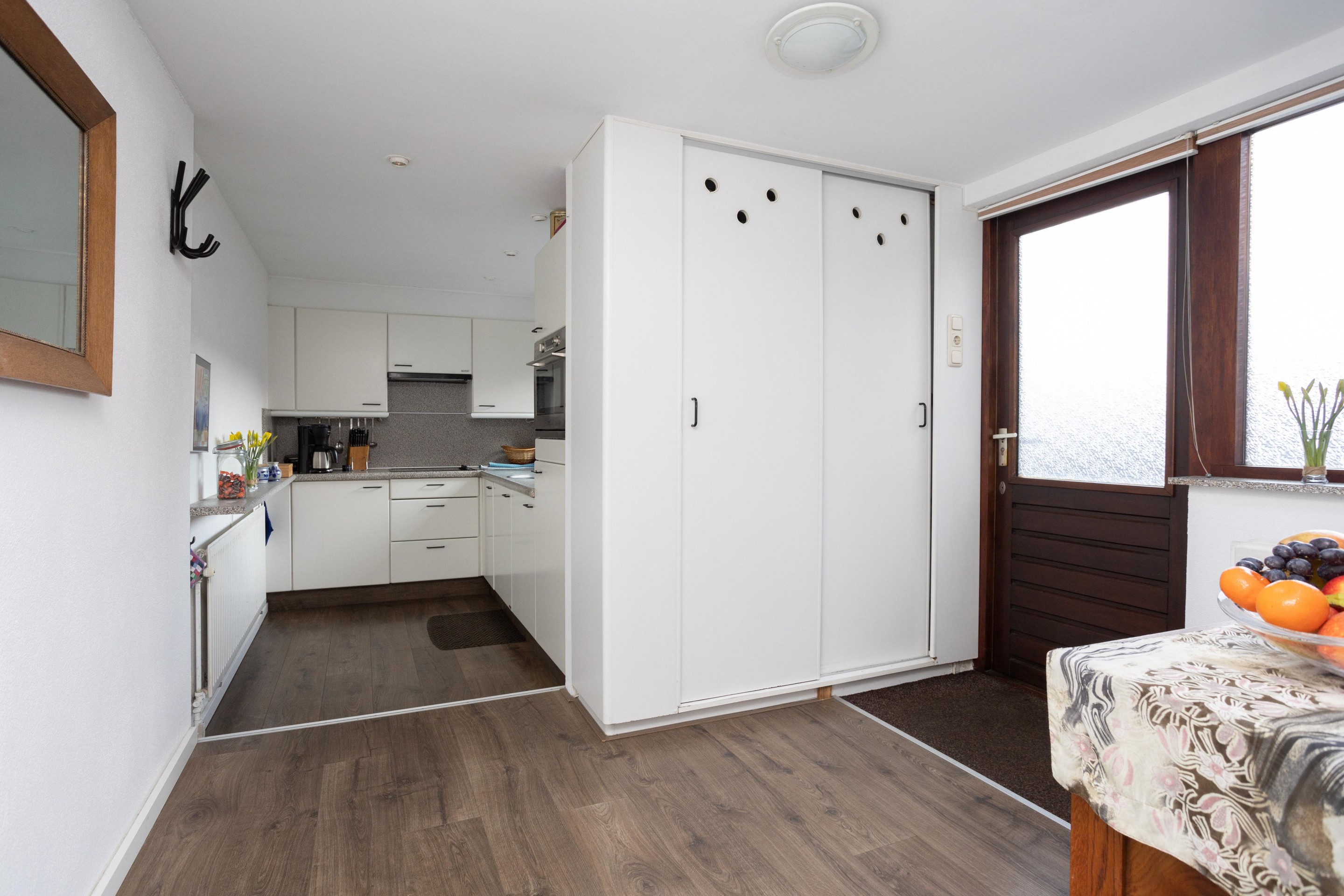 Royale entree aan de achterzijde van de woning. Aan de achterzijde van de woning is de keuken gesitueerd. De keuken is voorzien van een keramische kookplaat, vriezer, koelkast en een oven. In de keuken is ook de aansluiting van de wasmachine. Als we dan terug gaan naar het entree komen we aan op de plek waar van oorsprong de keuken stond, dit is nu een fijne ruimte om te verblijven met ruimte voor het plaatsen van de eettafel. Aan de voorzijde is de woonkamer, deze is over de breedte van de woning en beschikt over grote raampartijen met rolluiken. Tot slot op deze verdieping de badkamer, deze is voorzien van een ligbad, toilet, wastafel en een design-radiator.