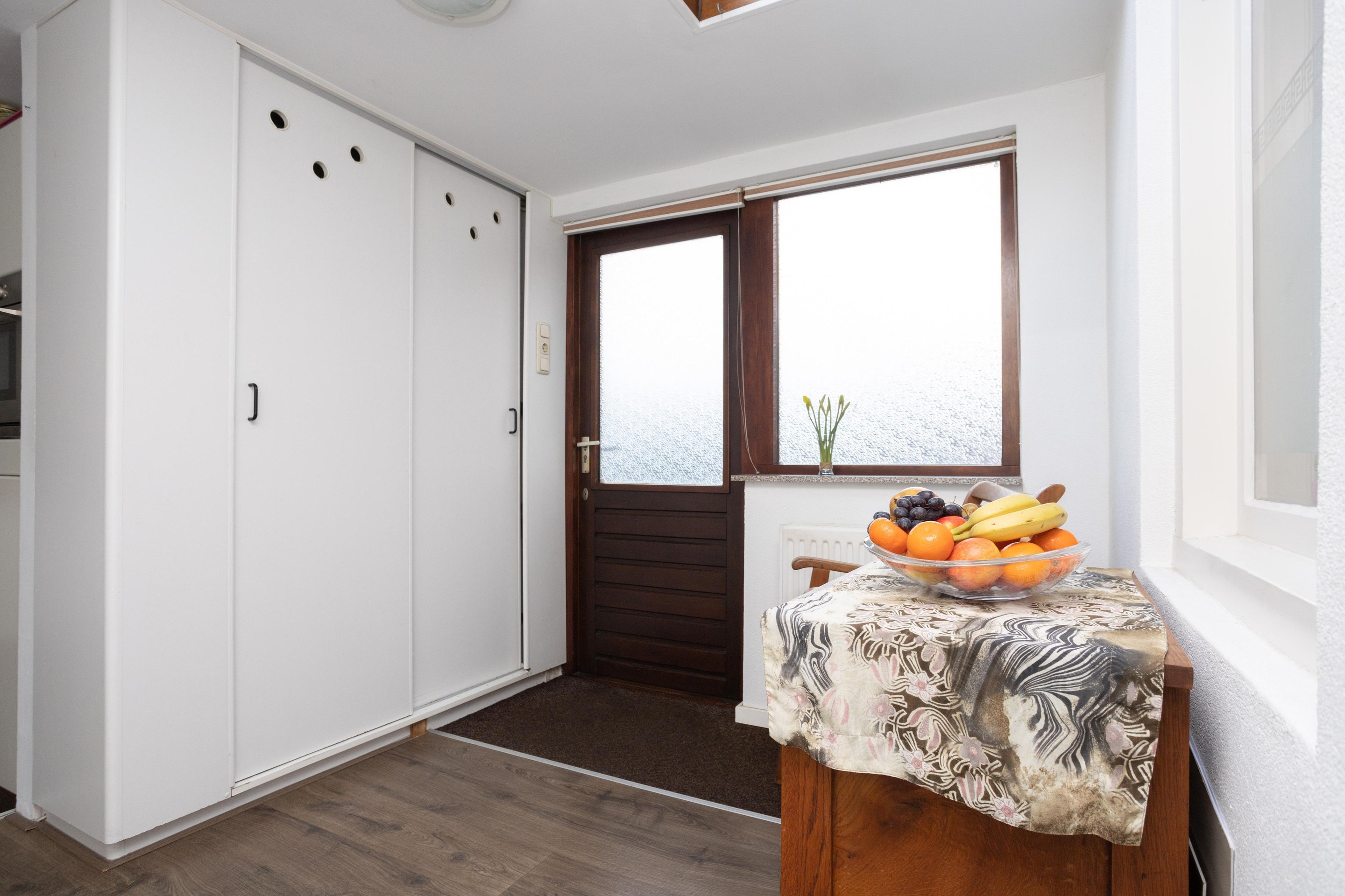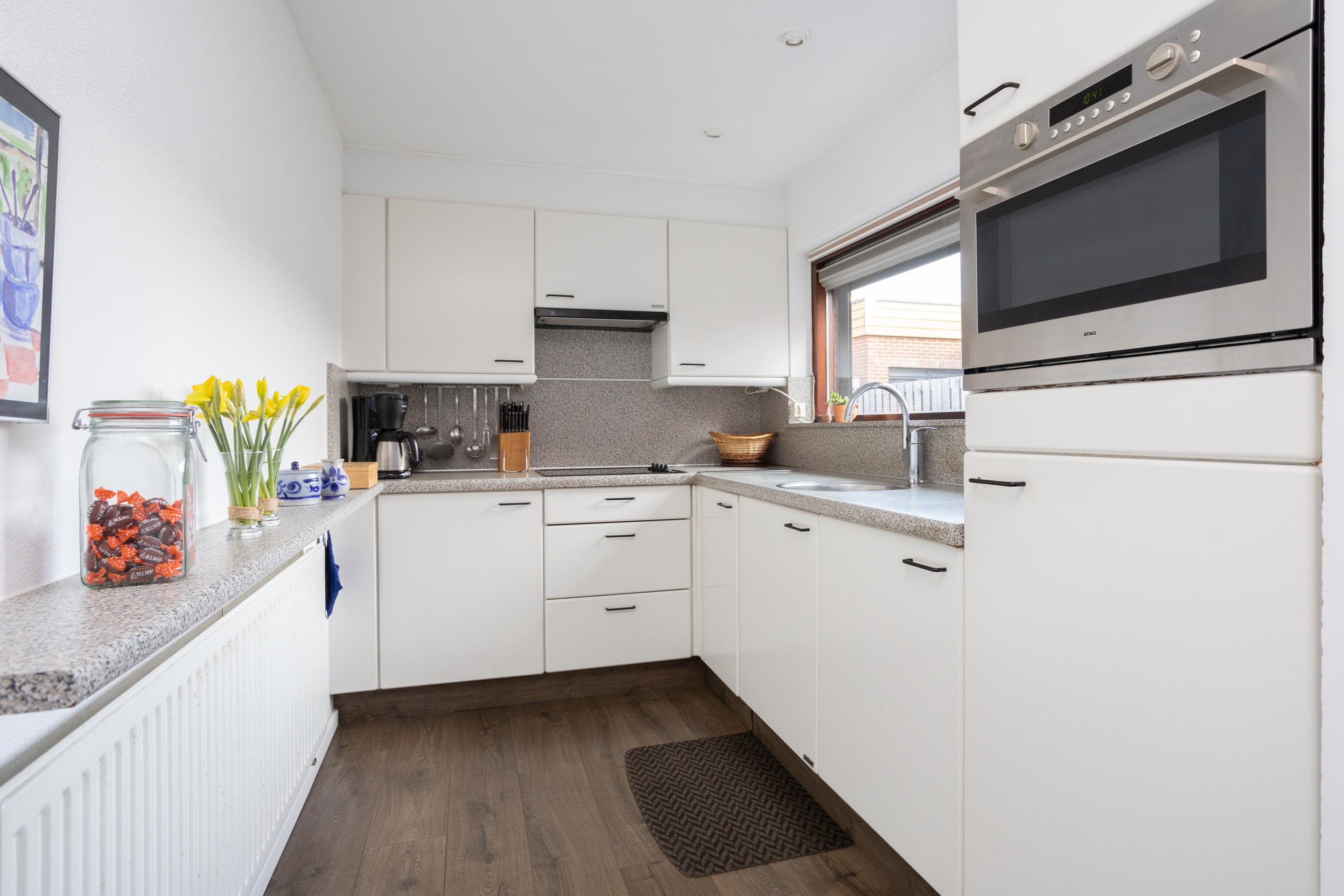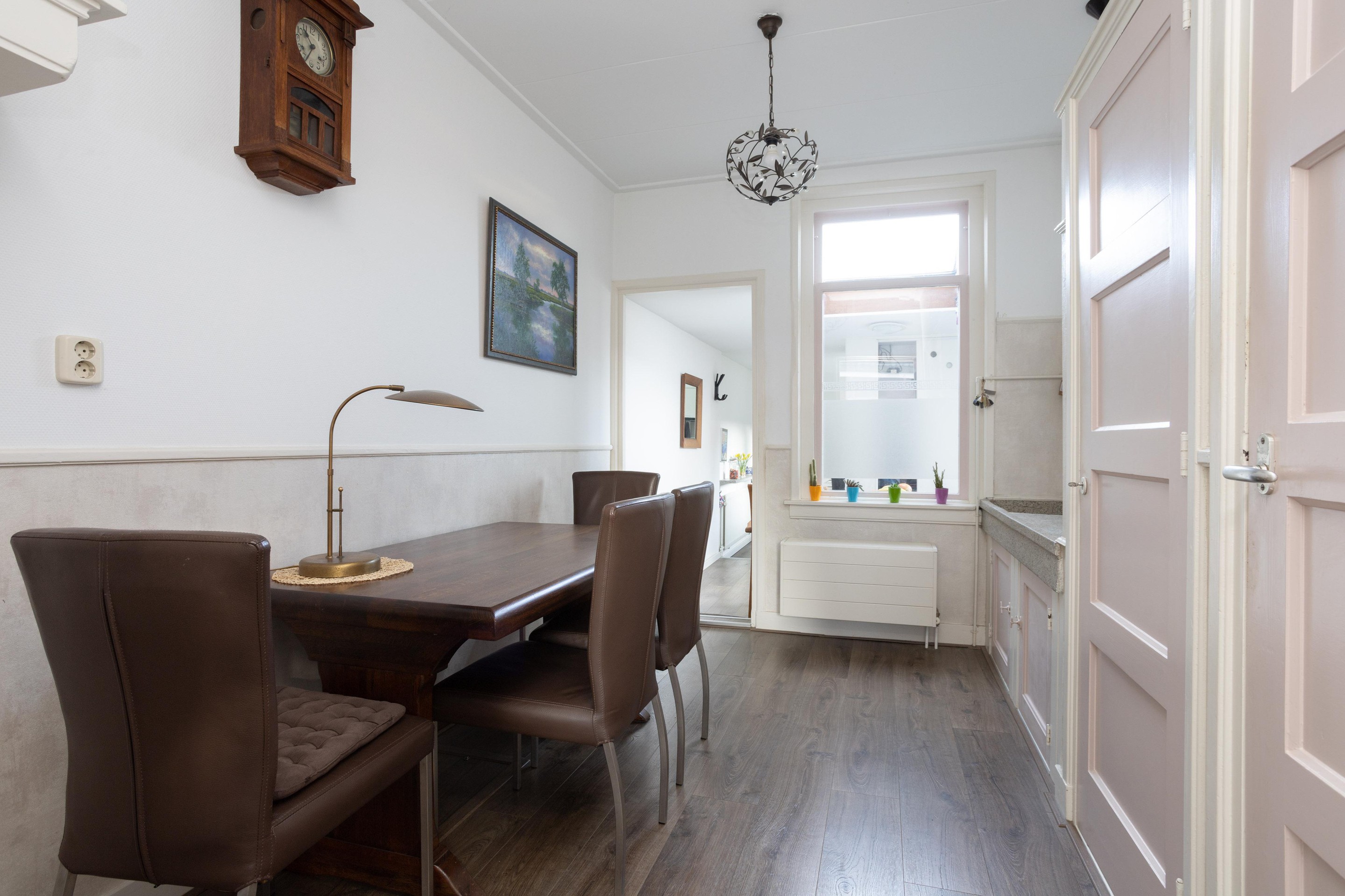Royale entree aan de achterzijde van de woning. Aan de achterzijde van de woning is de keuken gesitueerd. De keuken is voorzien van een keramische kookplaat, vriezer, koelkast en een oven. In de keuken is ook de aansluiting van de wasmachine. Als we dan terug gaan naar het entree komen we aan op de plek waar van oorsprong de keuken stond, dit is nu een fijne ruimte om te verblijven met ruimte voor het plaatsen van de eettafel. Aan de voorzijde is de woonkamer, deze is over de breedte van de woning en beschikt over grote raampartijen met rolluiken. Tot slot op deze verdieping de badkamer, deze is voorzien van een ligbad, toilet, wastafel en een design-radiator.