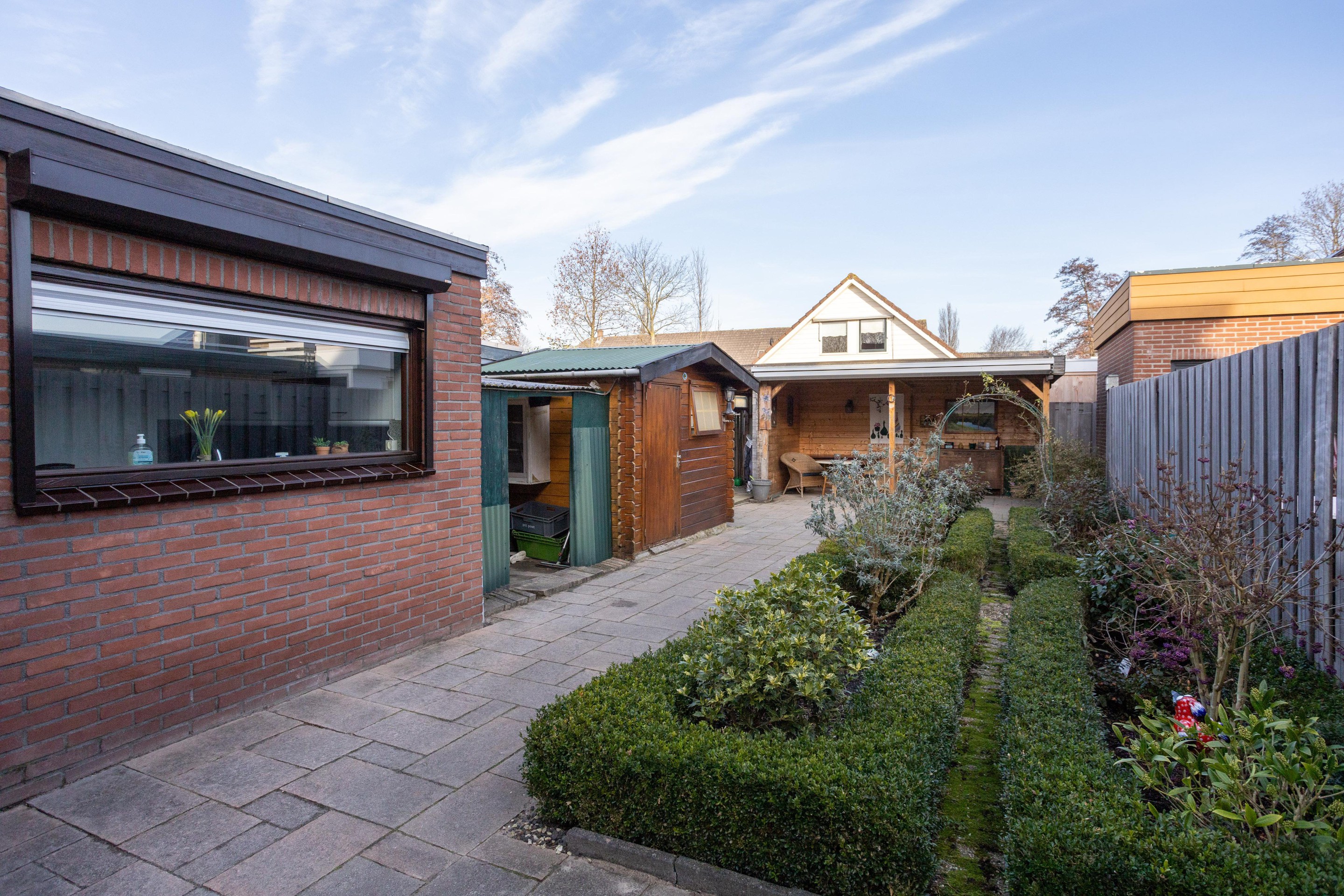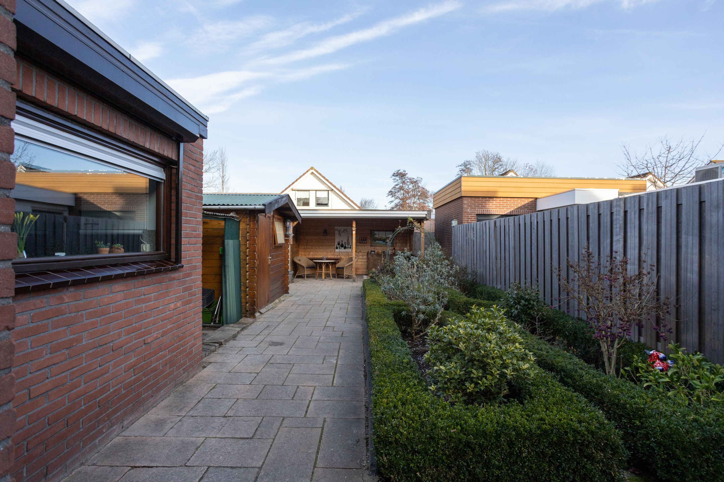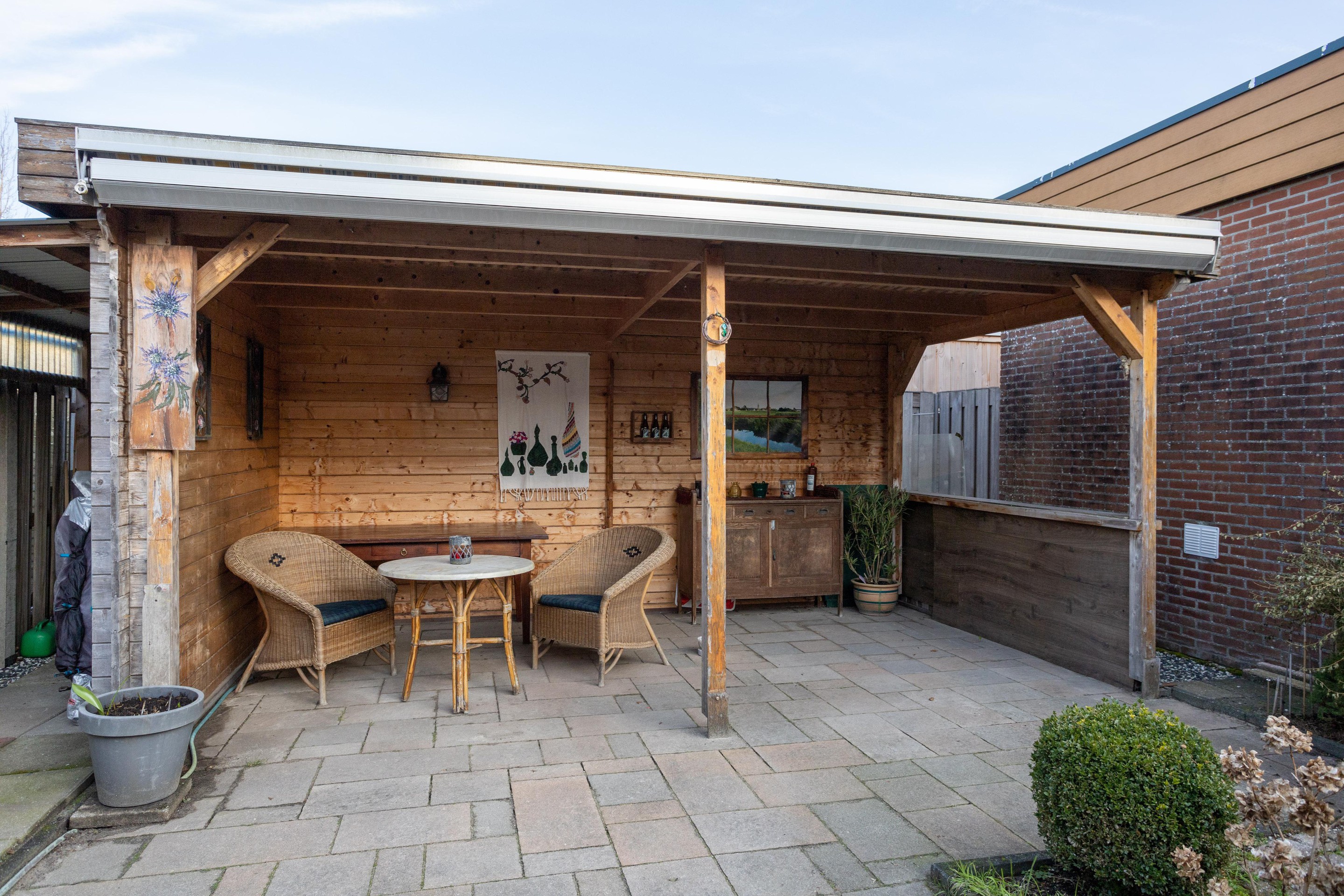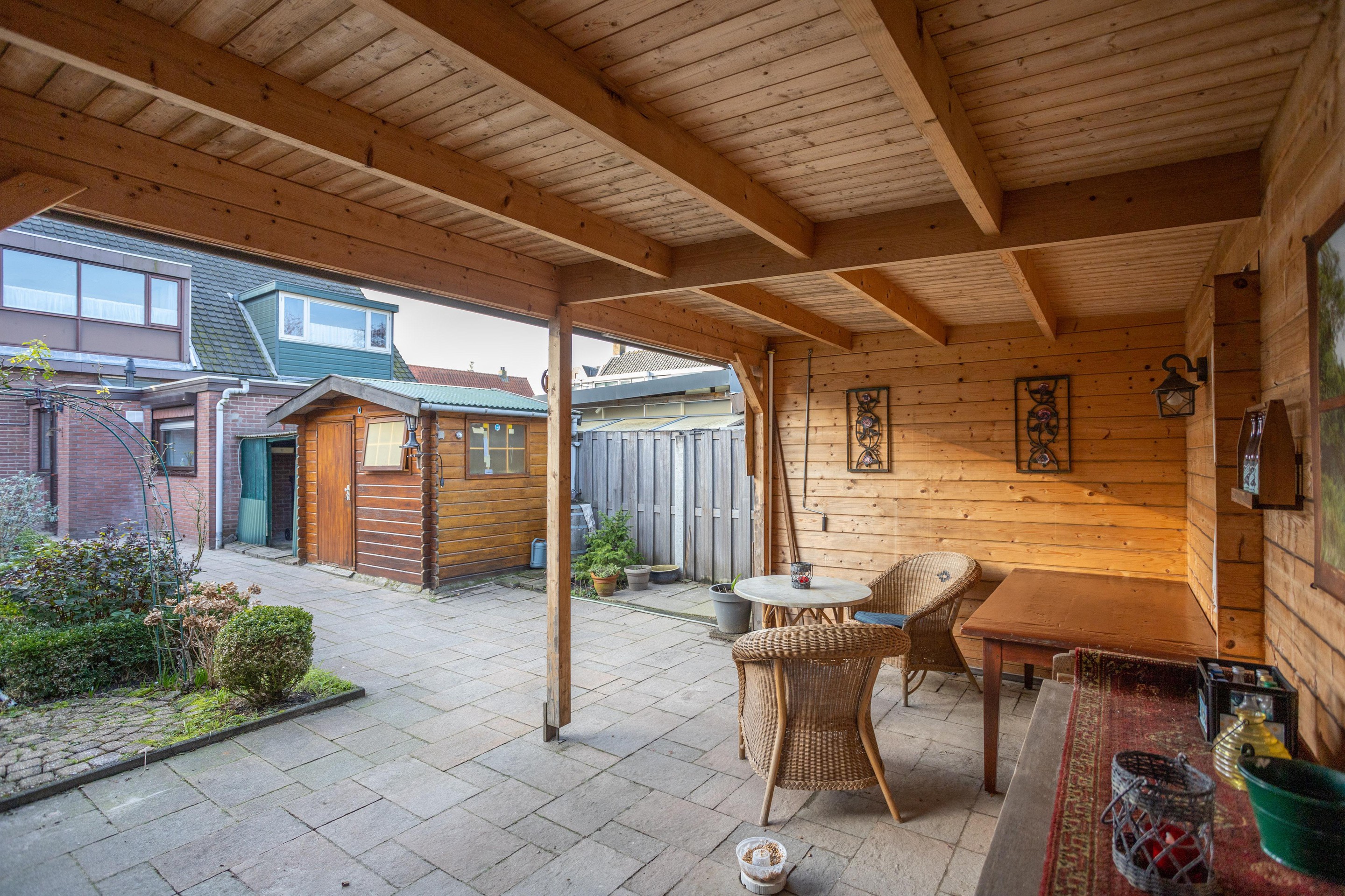 Wat is dit een heerlijke ruime tuin. Heel ruim van opzet en fijn dat er naast het tuinhuis een houten overkapping aanwezig is.