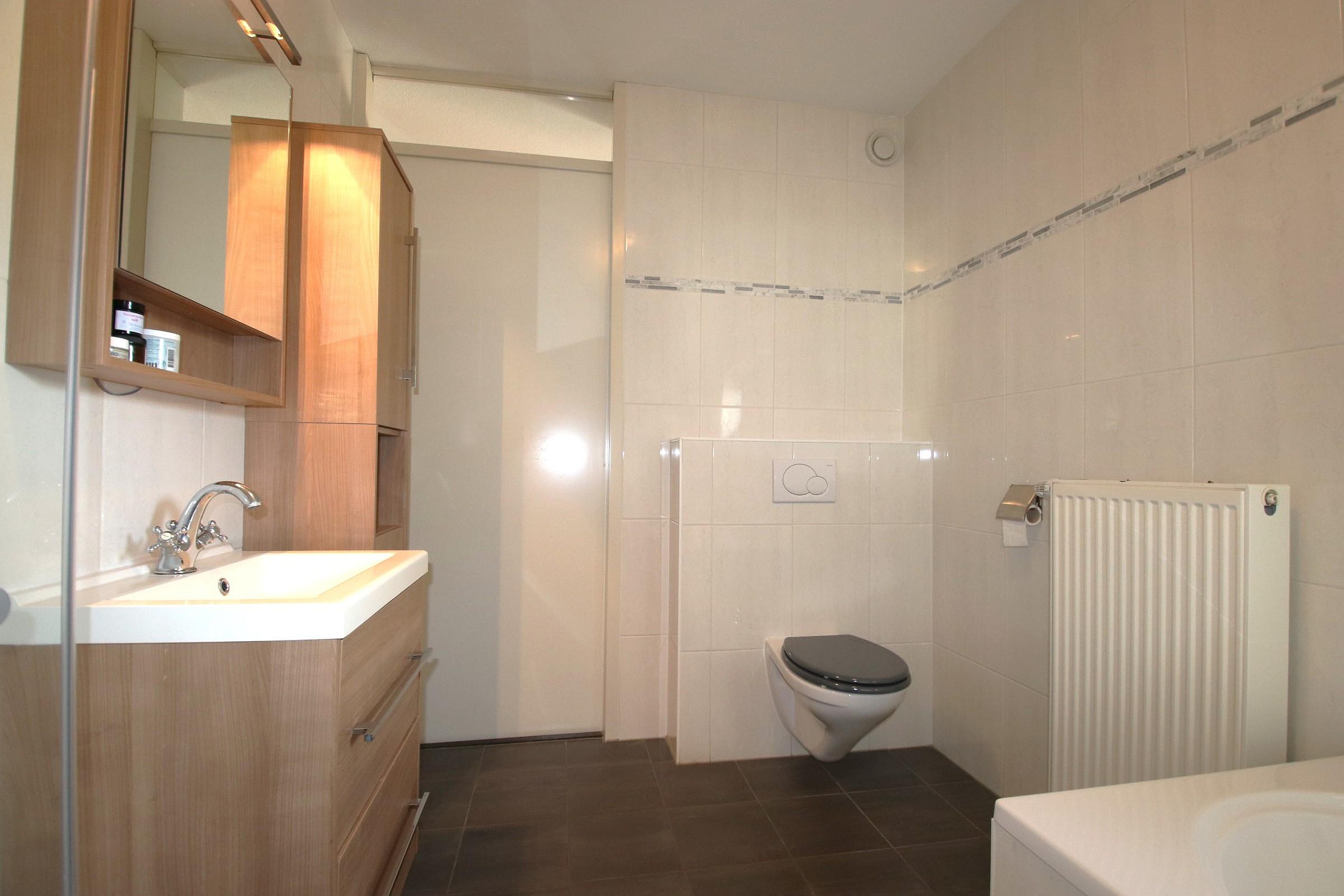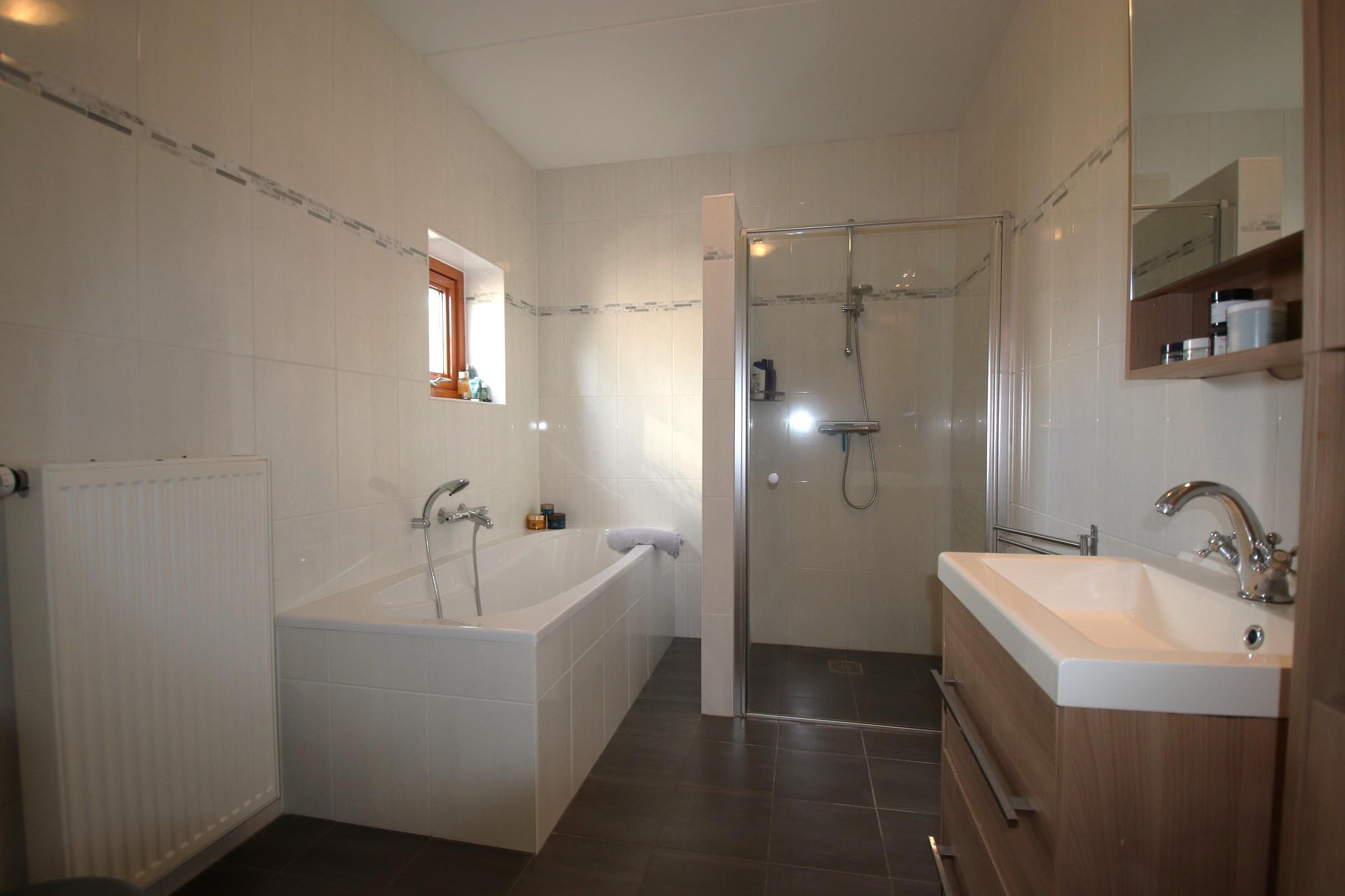 ruime overloop met ruimte voor extra kast/ kastenwand of werkbureau, 2 slaapkamers met Franse Balkons - van 2 slaapkamers aan voorzijde is 1 geheel royale ouderslaapkamer gemaakt, door wand terug te plaatsen zijn er weer 3 slaapkamers, waar vroeg in het voorjaar ( voorzijde / Franse balkons ) al in de zon gezeten kan worden, complete badkamer voorzien van ligbad, douchehoek met glazen deur, wastafelmeubel, 2e hangend toilet en ventilatieraampje.
