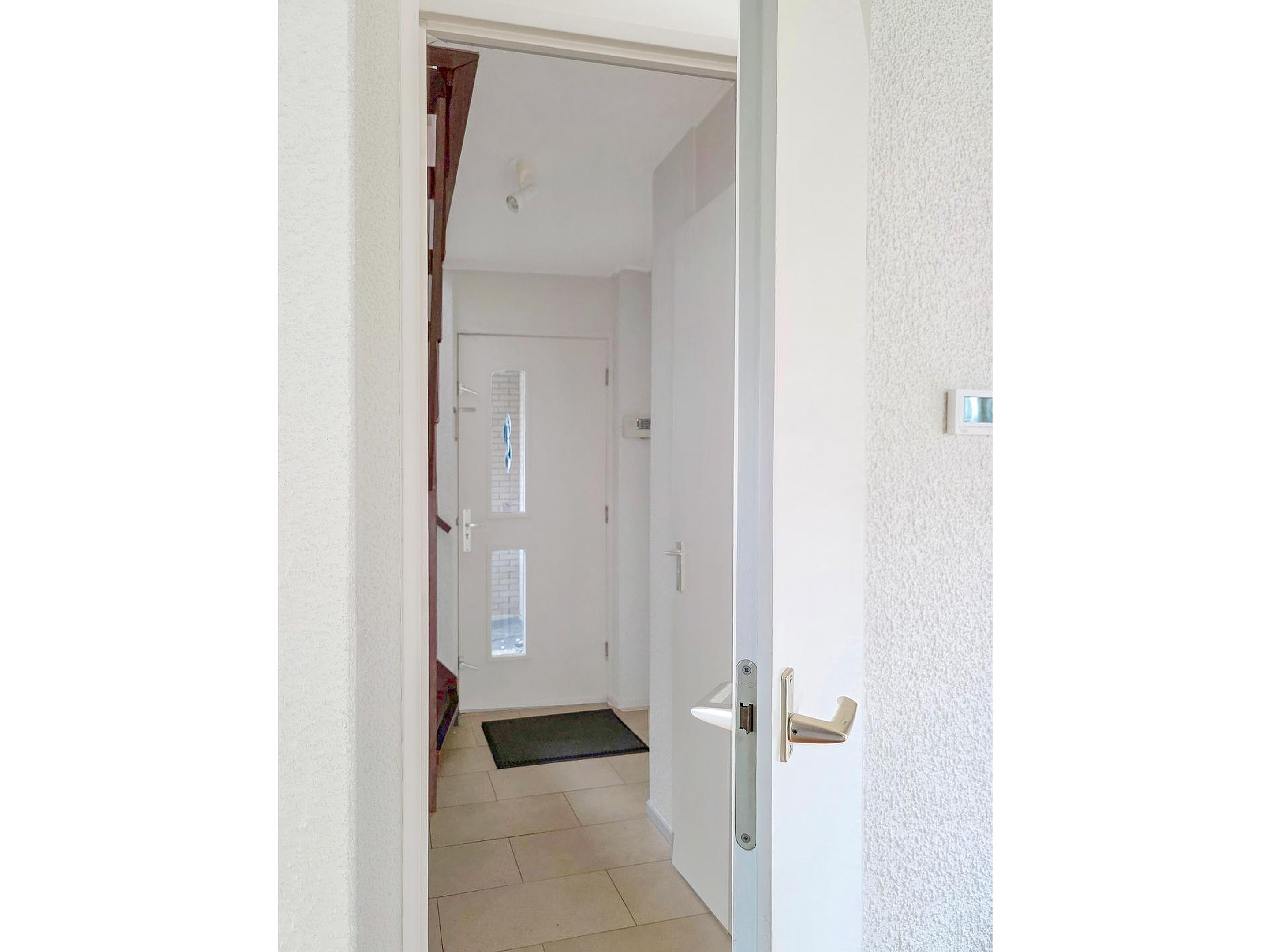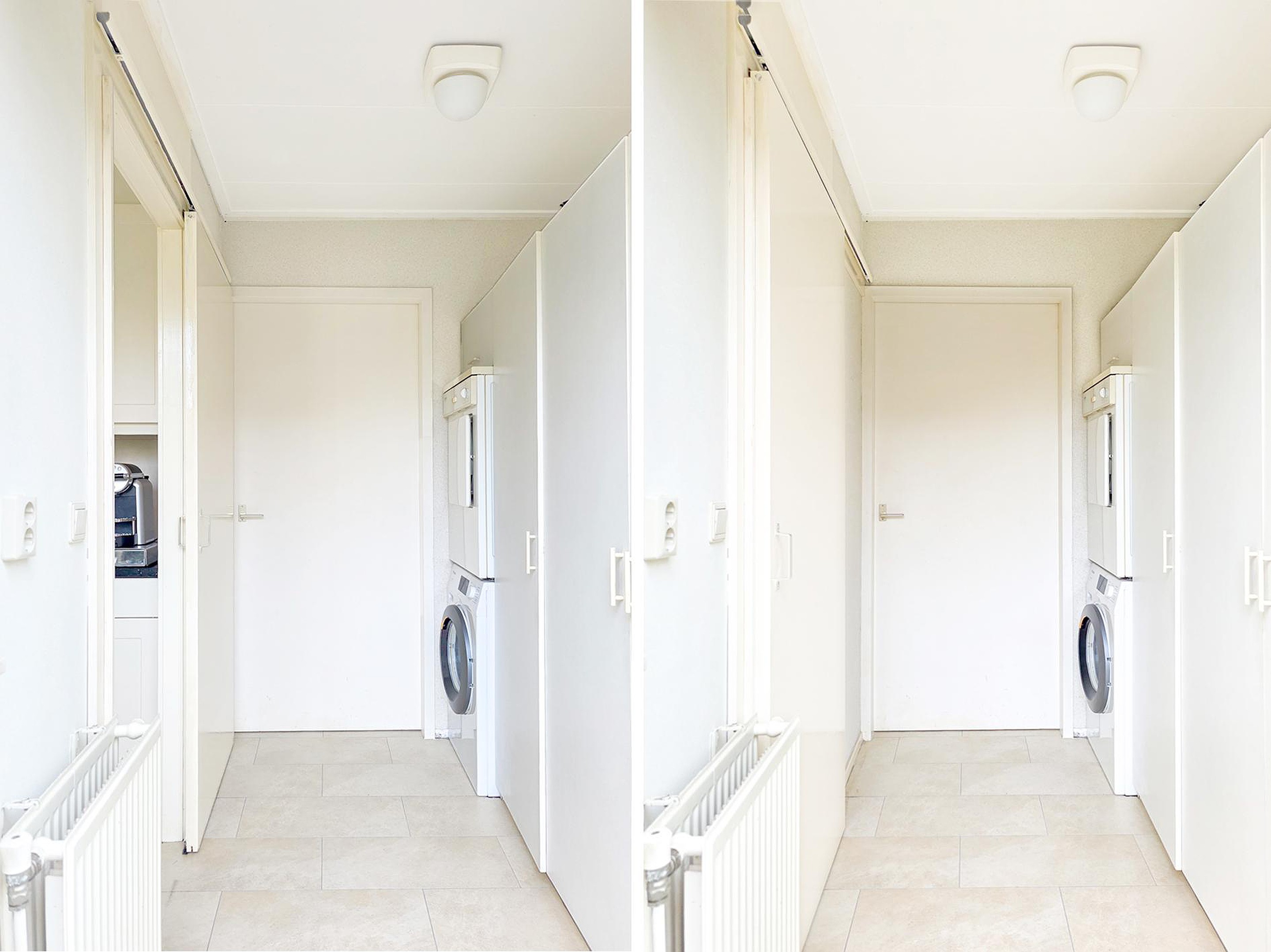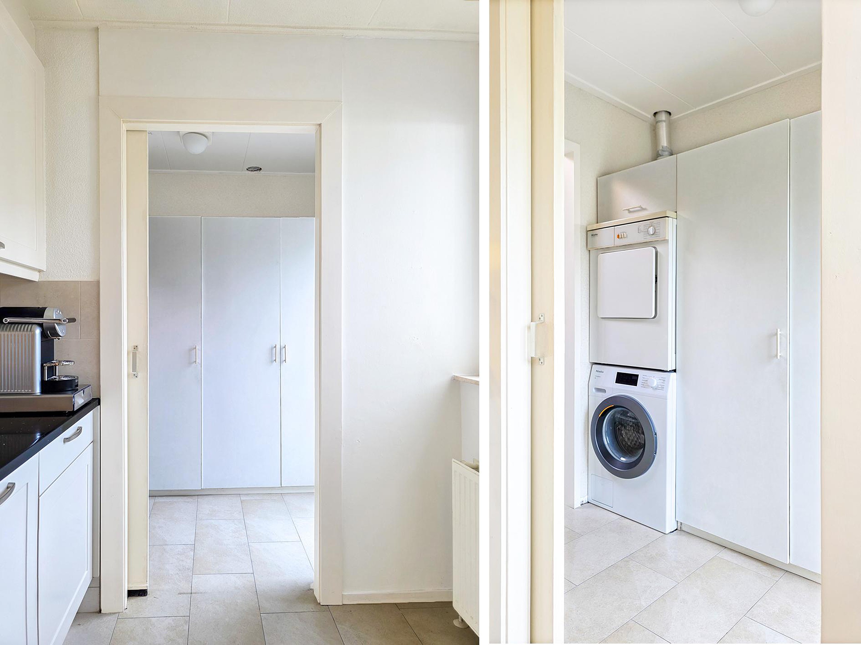 Toegang tot de bijkeuken met kastenwand en wasmachine- en drogeraansluiting.