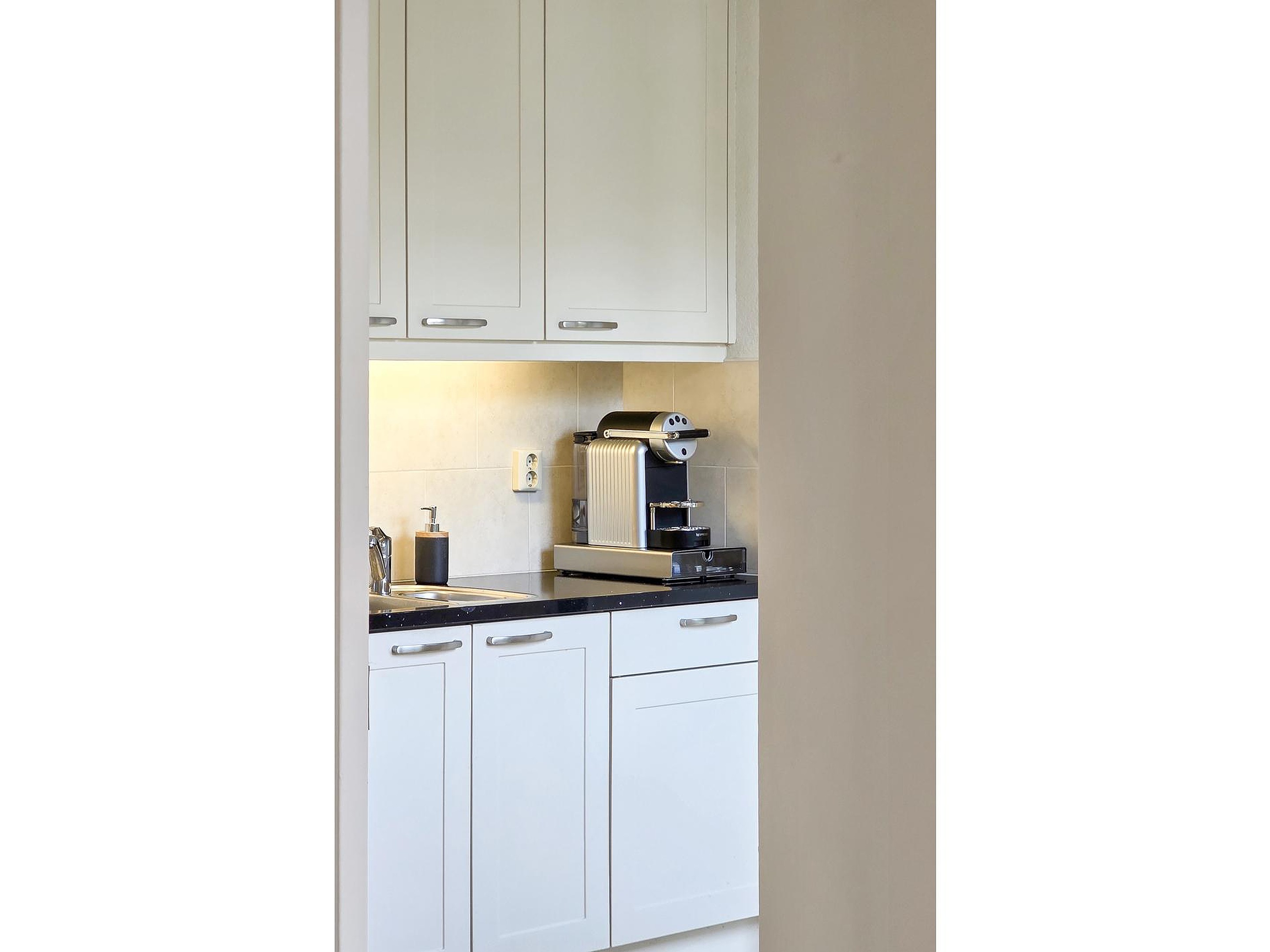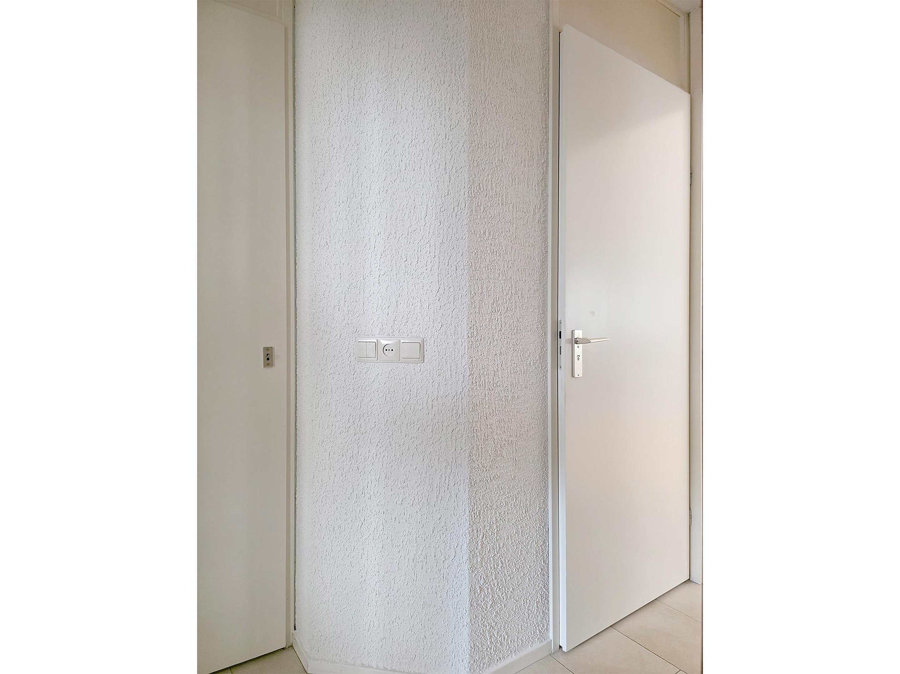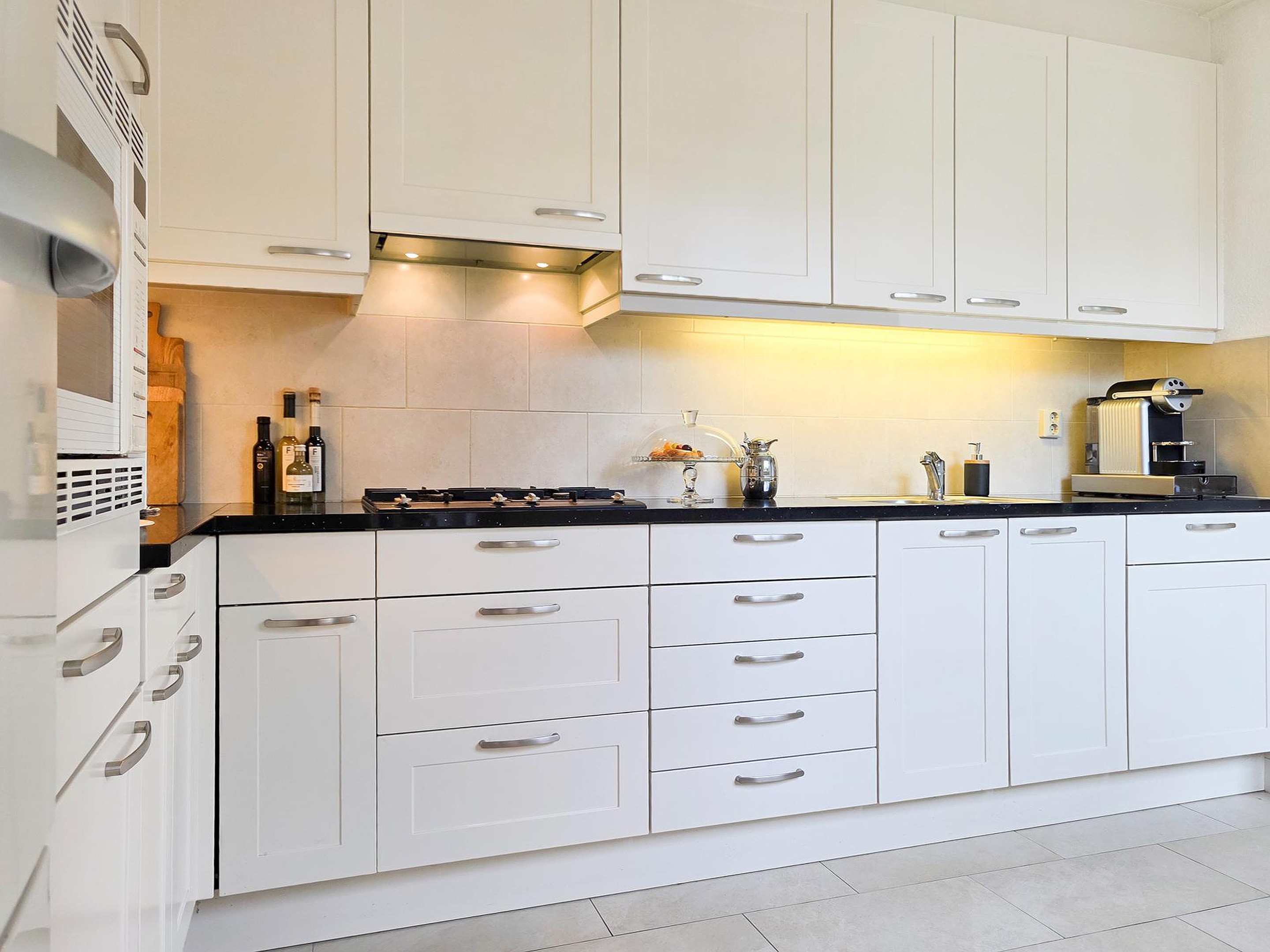 Toegang tot de bijkeuken met kastenwand en wasmachine- en drogeraansluiting.
