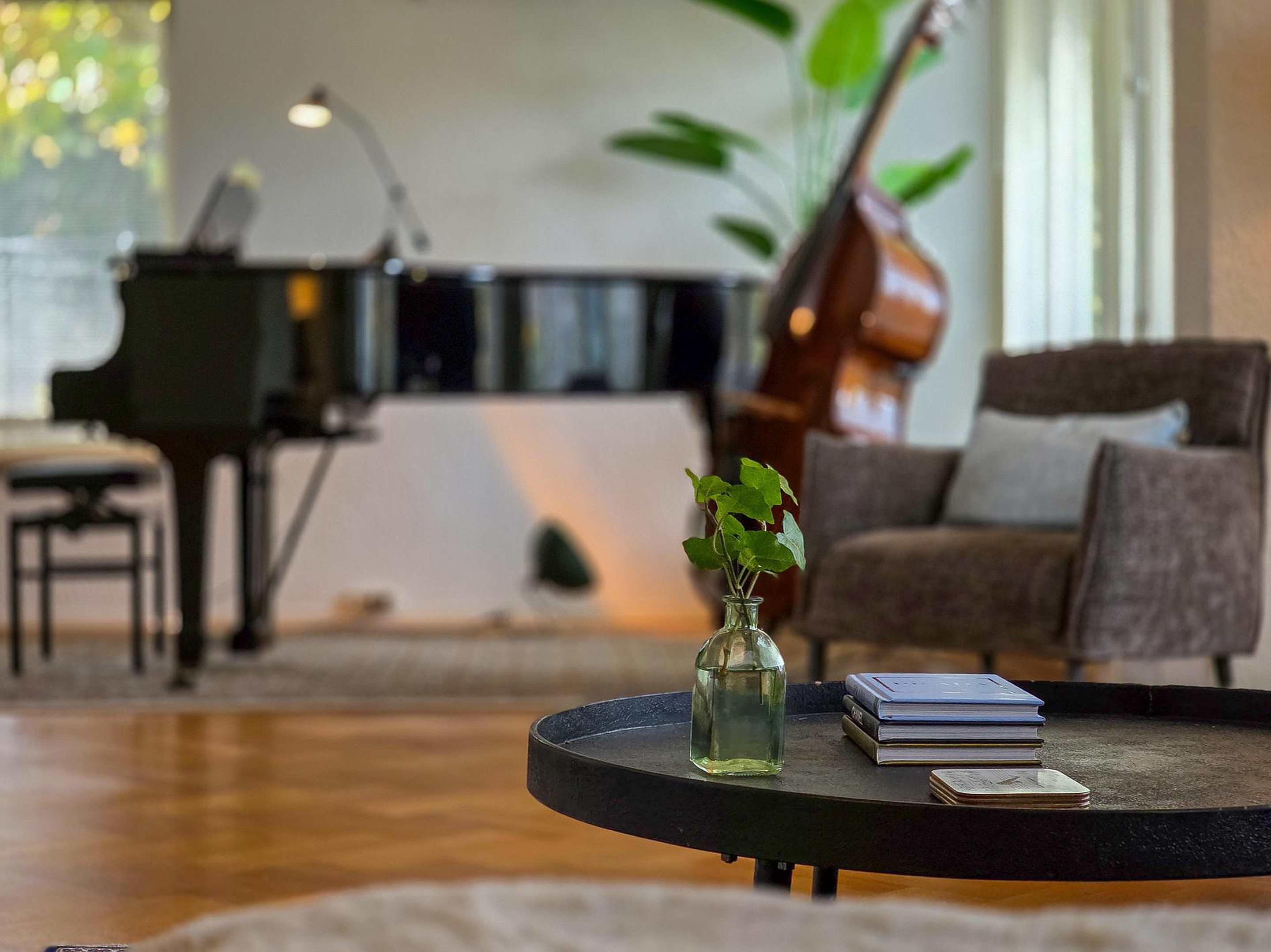 Hobbykamer en toegang tot de half open keuken met inbouwapparatuur.