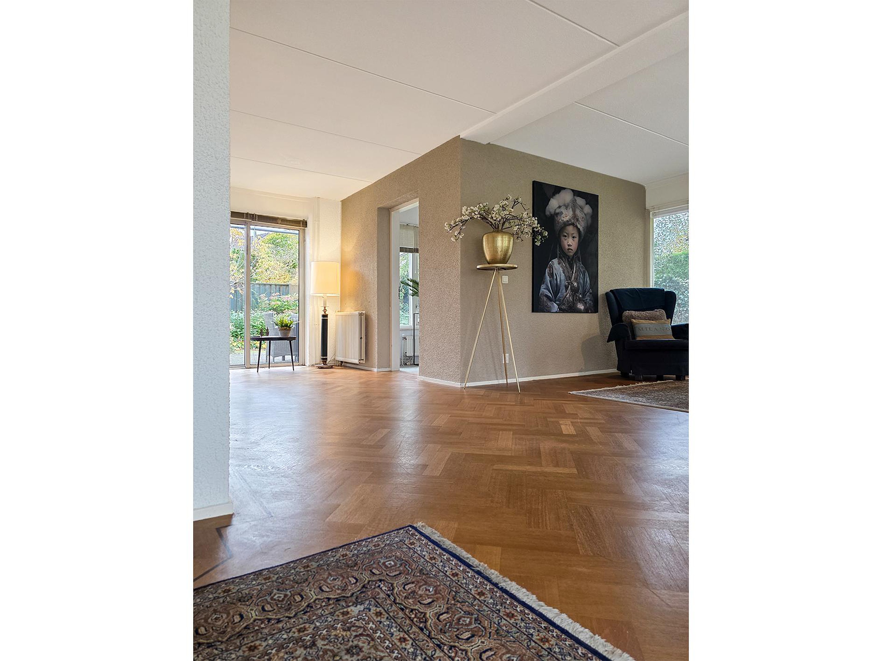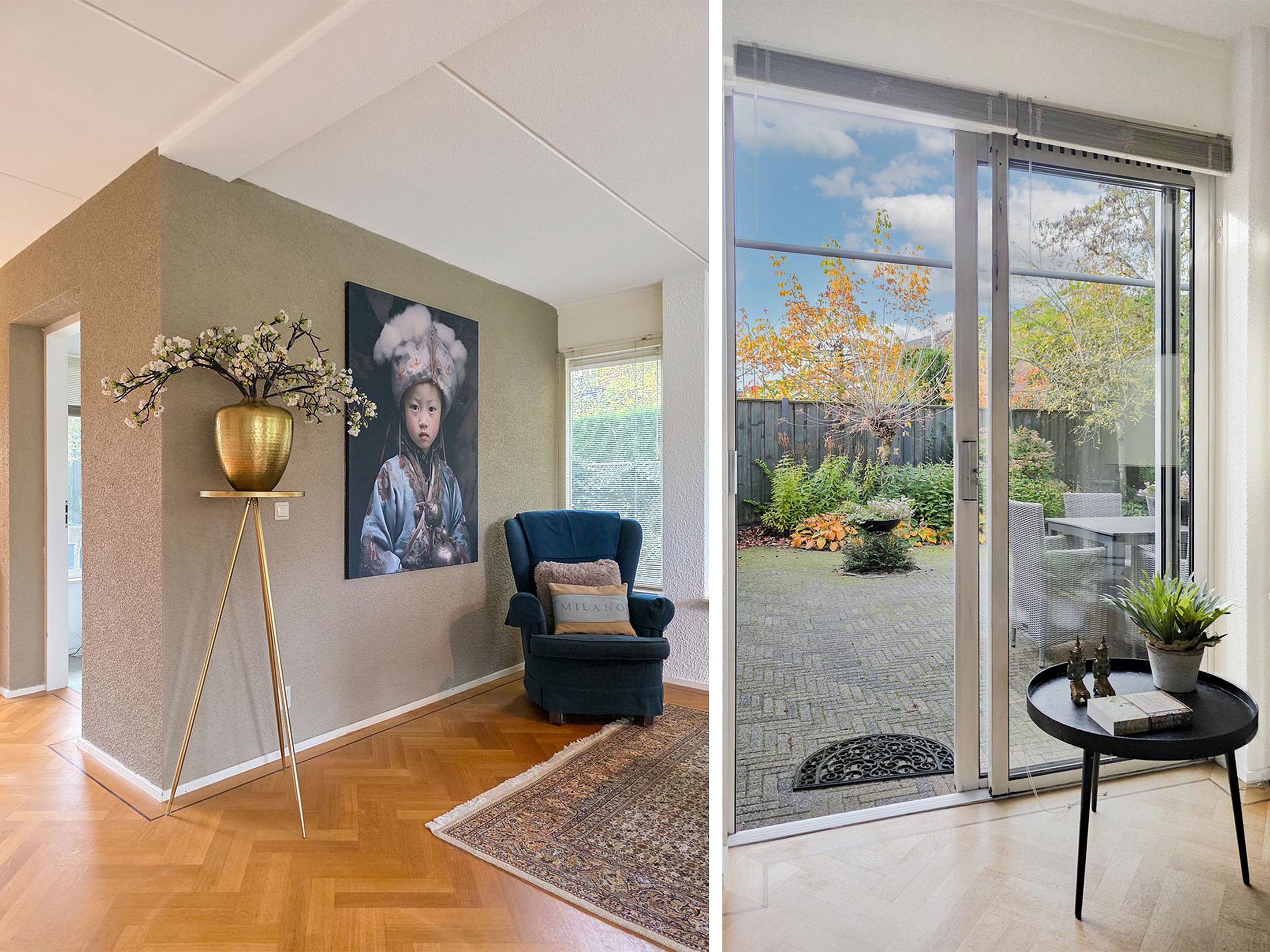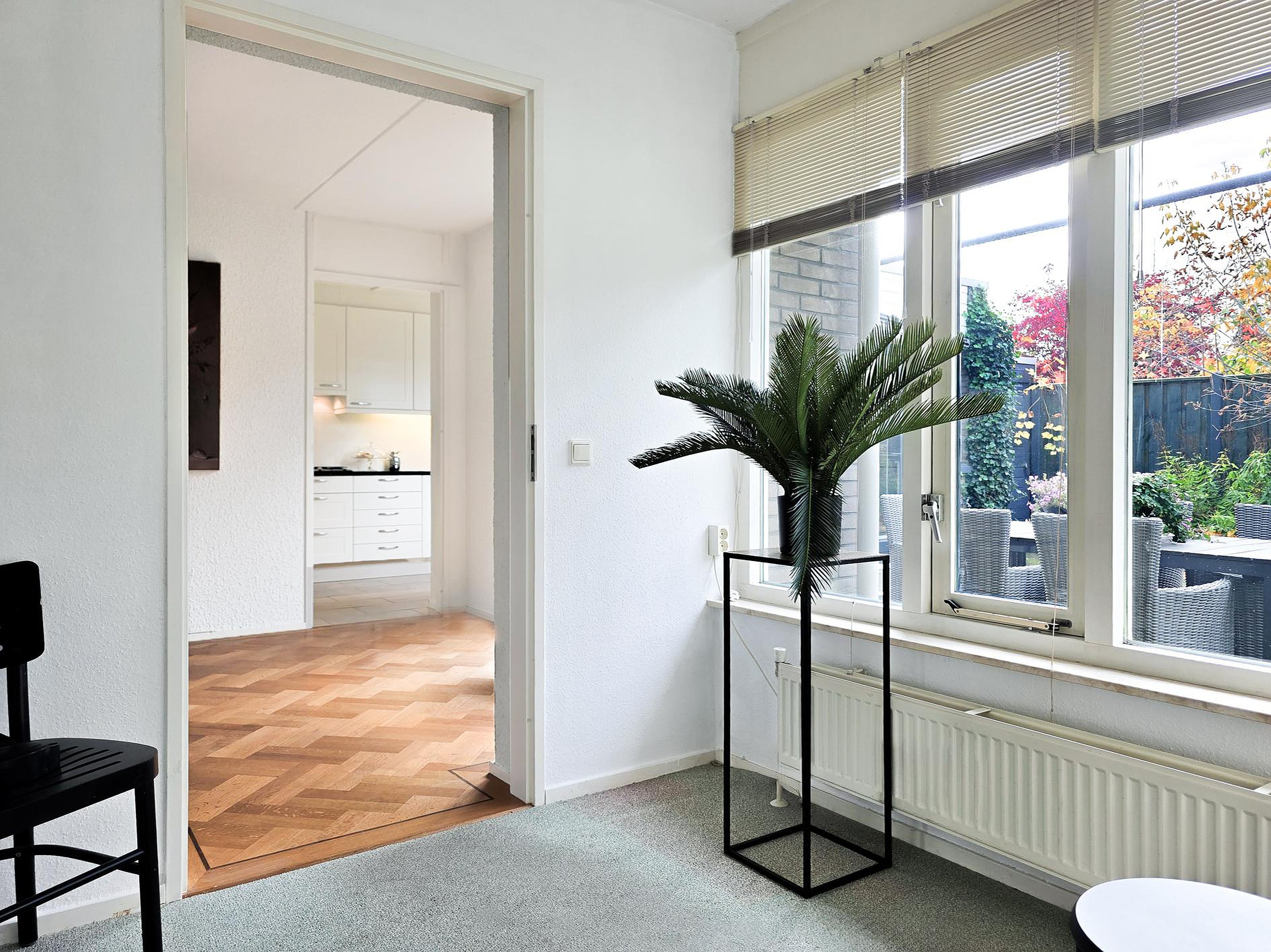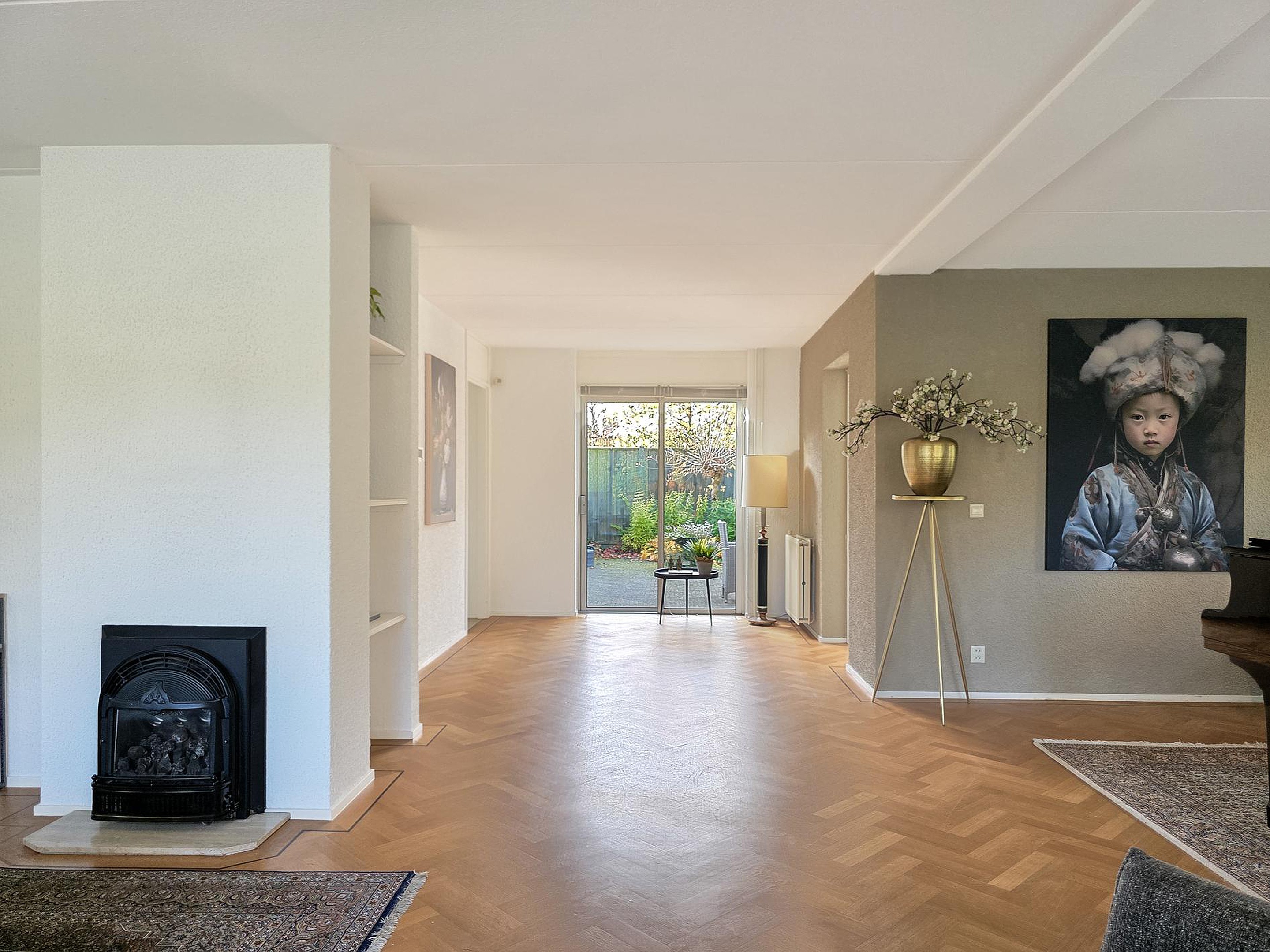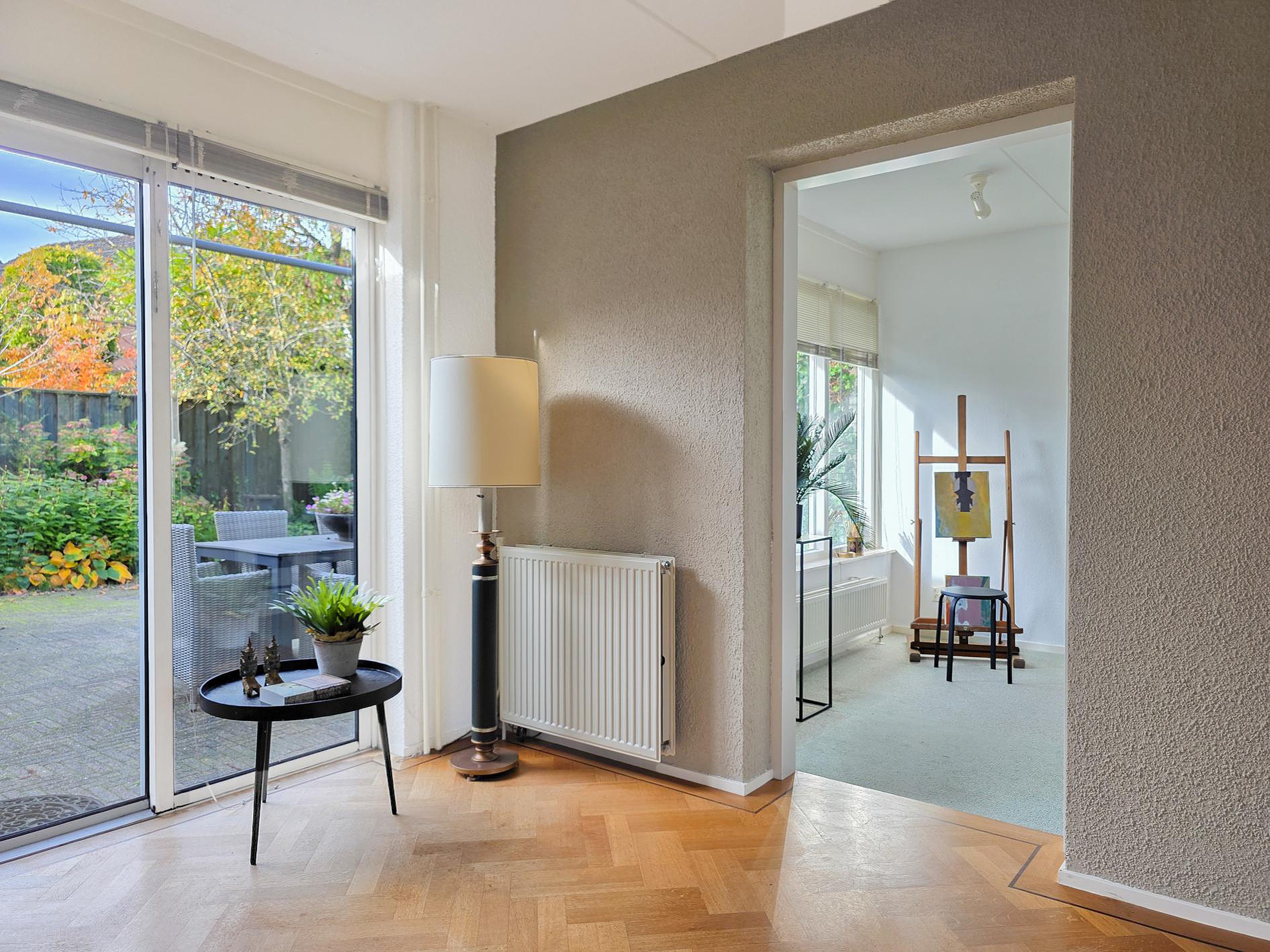 De woonkamer heeft een schuifpui naar de tuin.