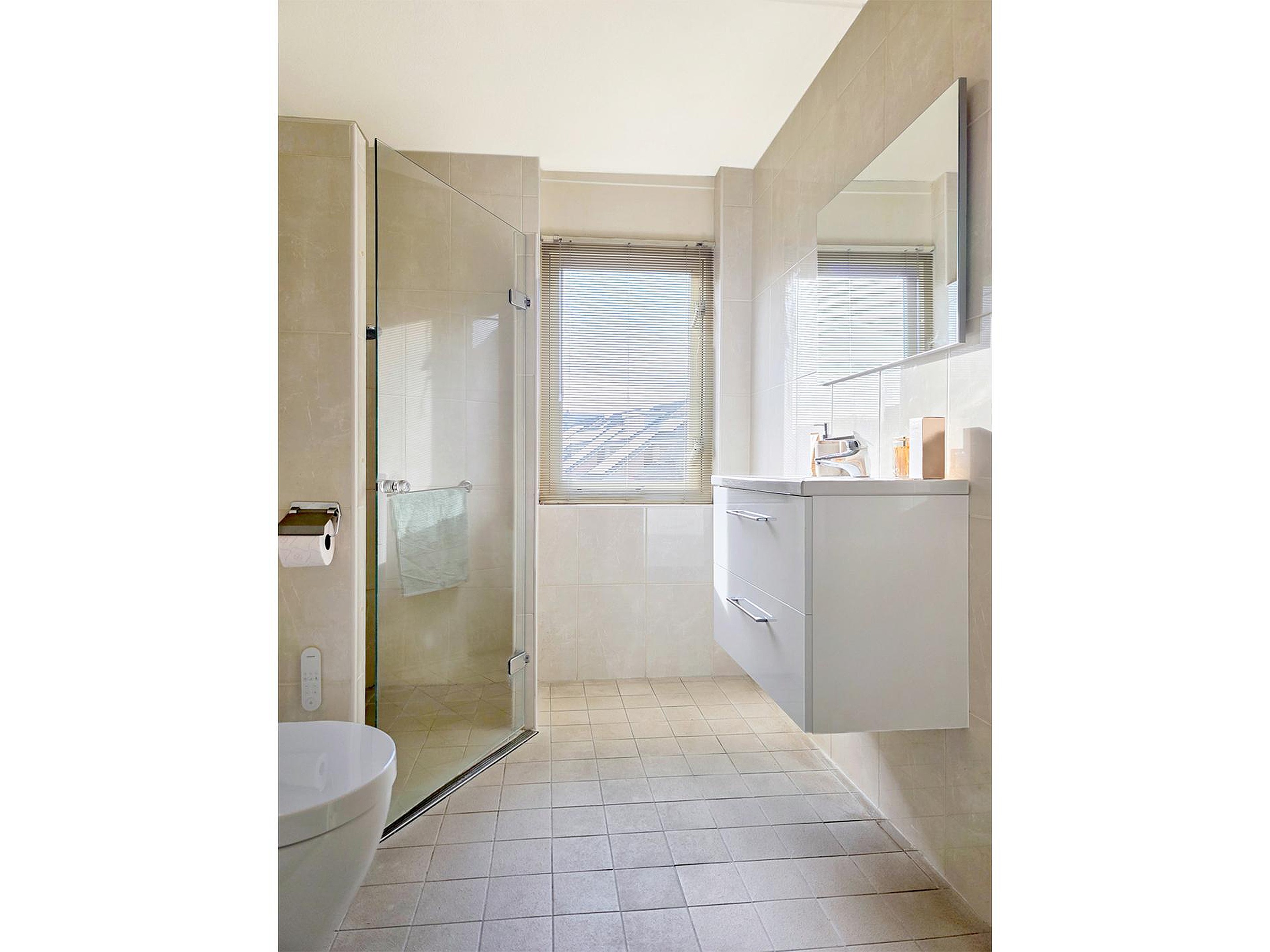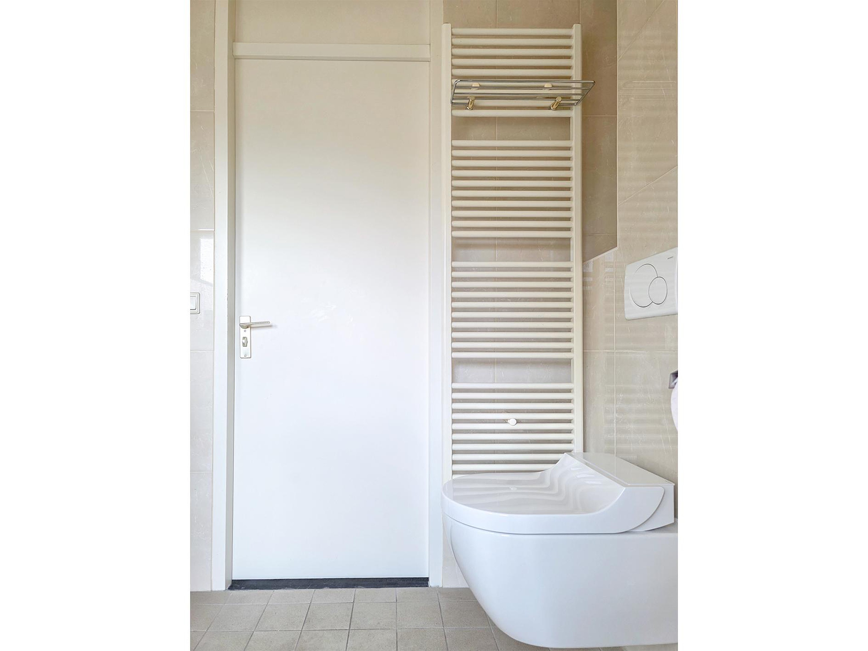 De badkamer heeft een inloopdouche, wastafelmeubel, wandcloset en designradiator.