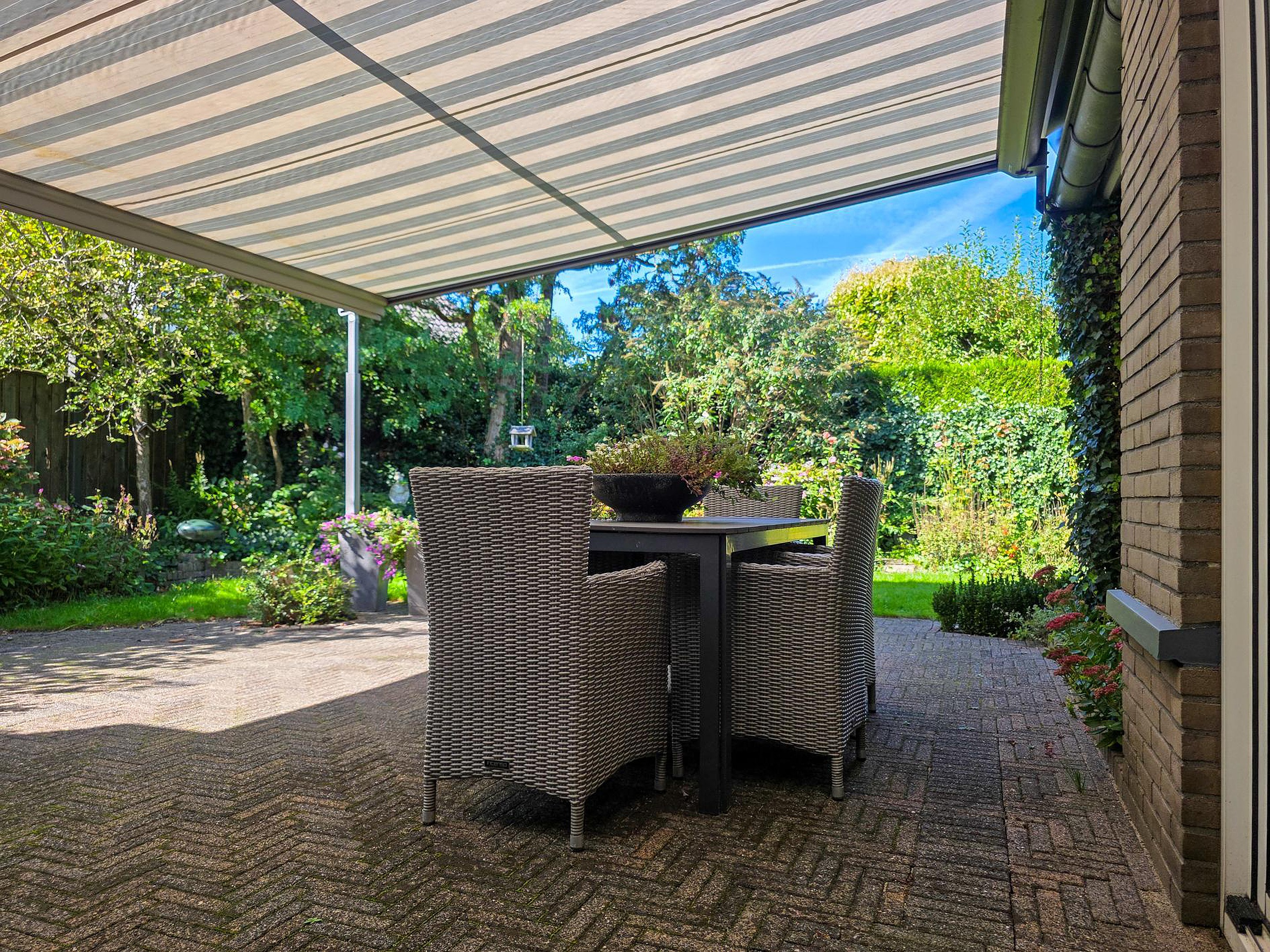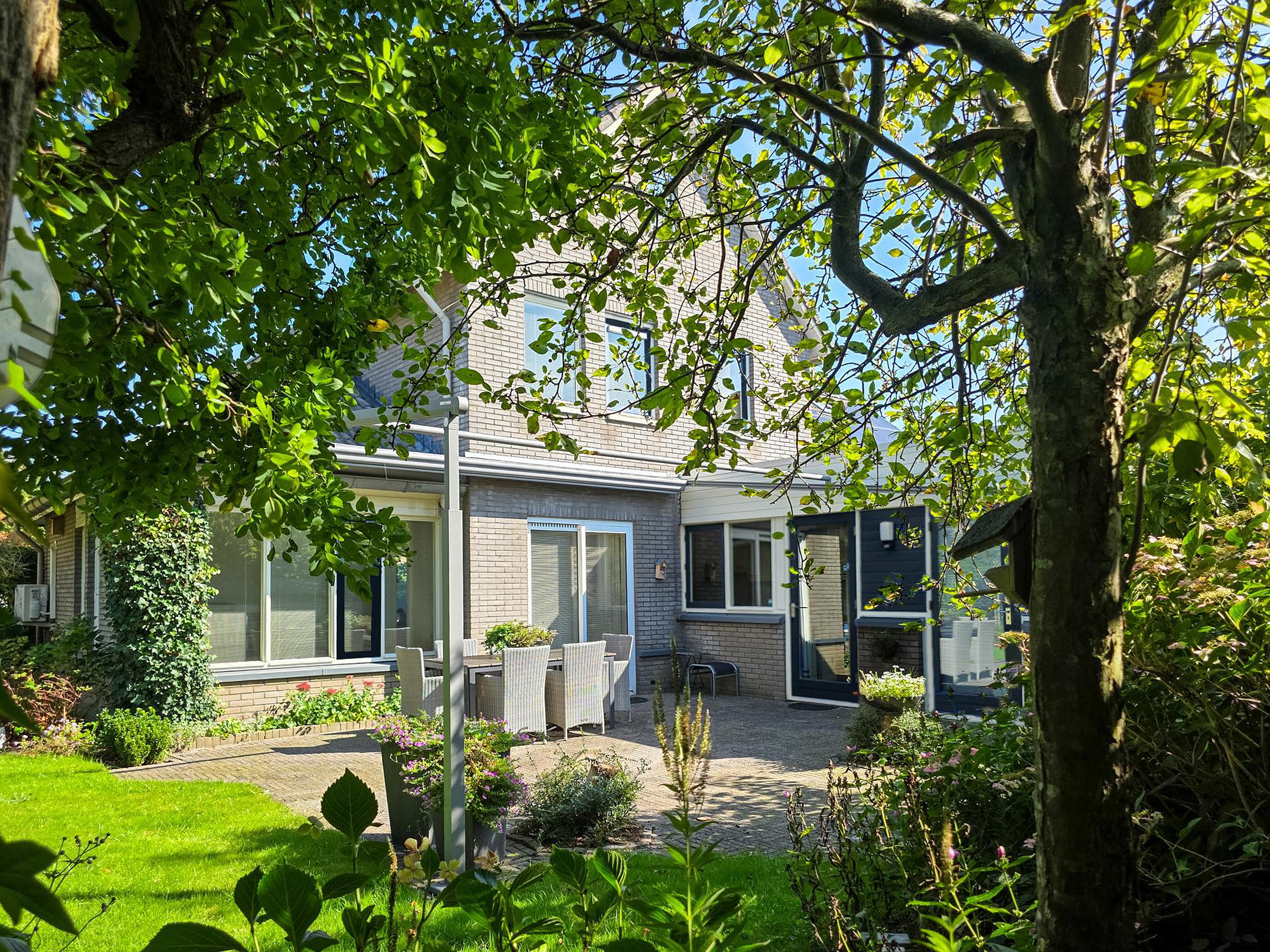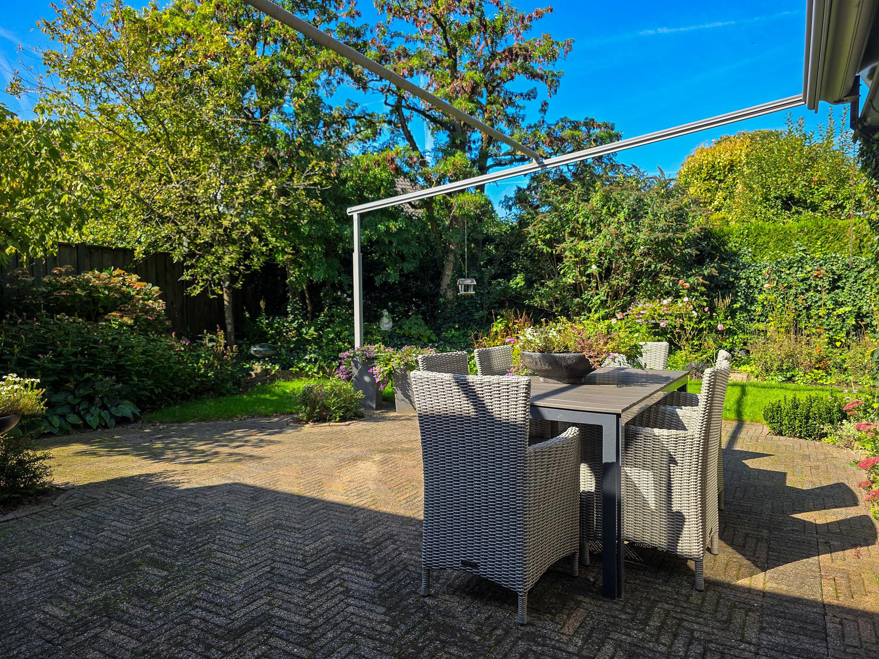 Buiten genieten kan hier in volle glorie. De woning beschikt over een diepe voor-, zij- en achtertuin. Ruim, groen en met privacy.