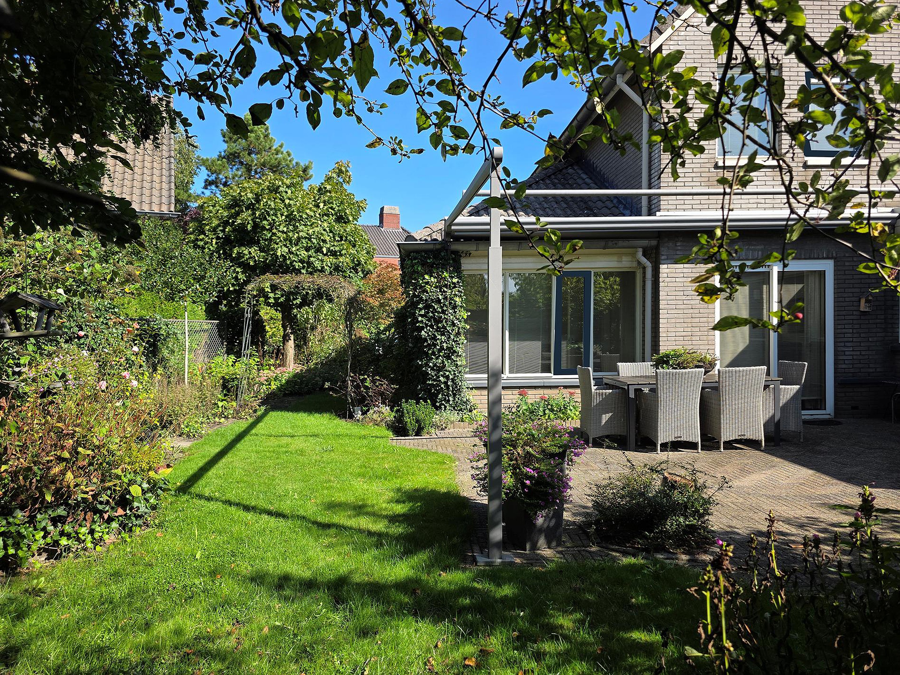 De ruime groene zij- en achtertuin biedt veel privacy en is gelegen op het zuidwesten.