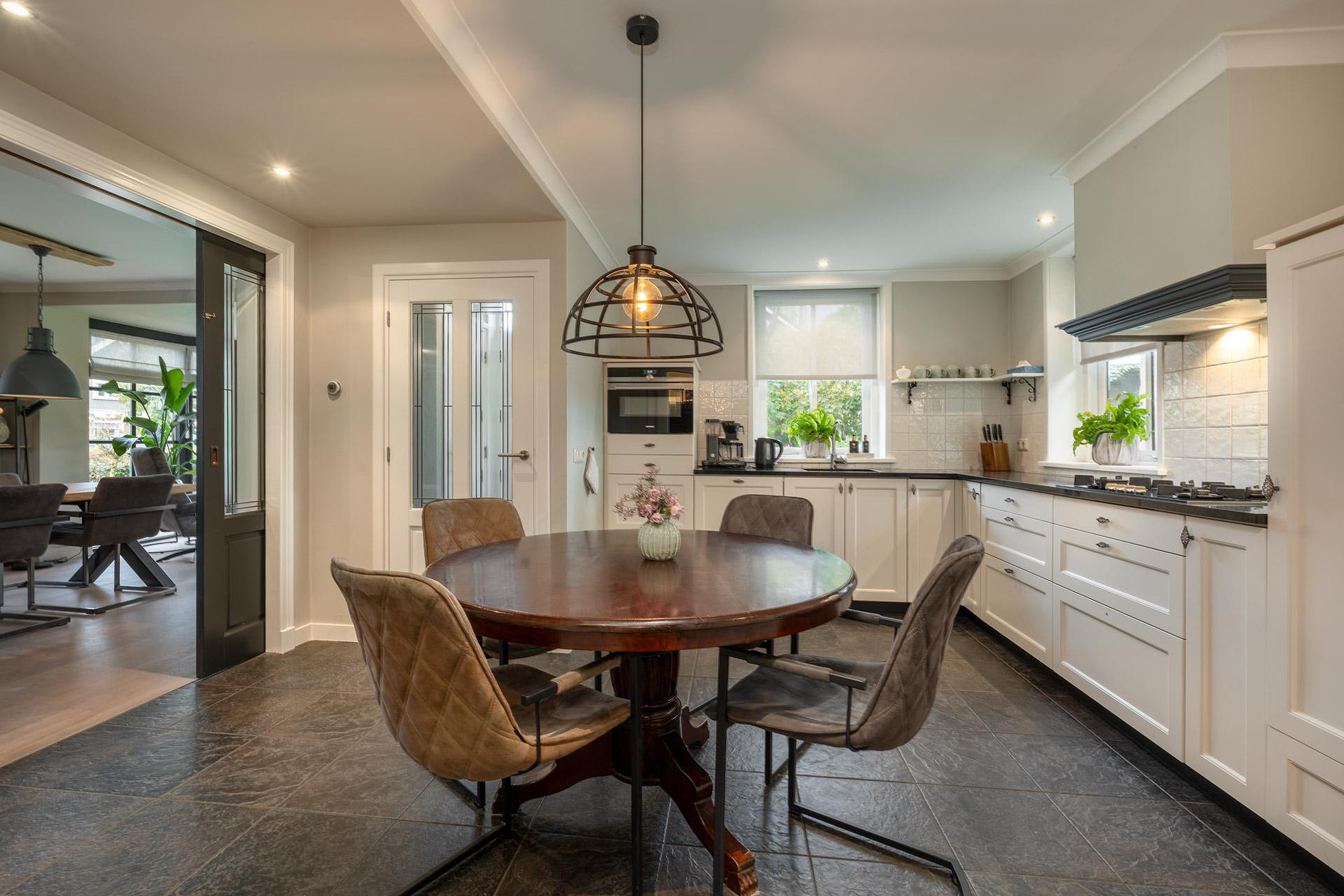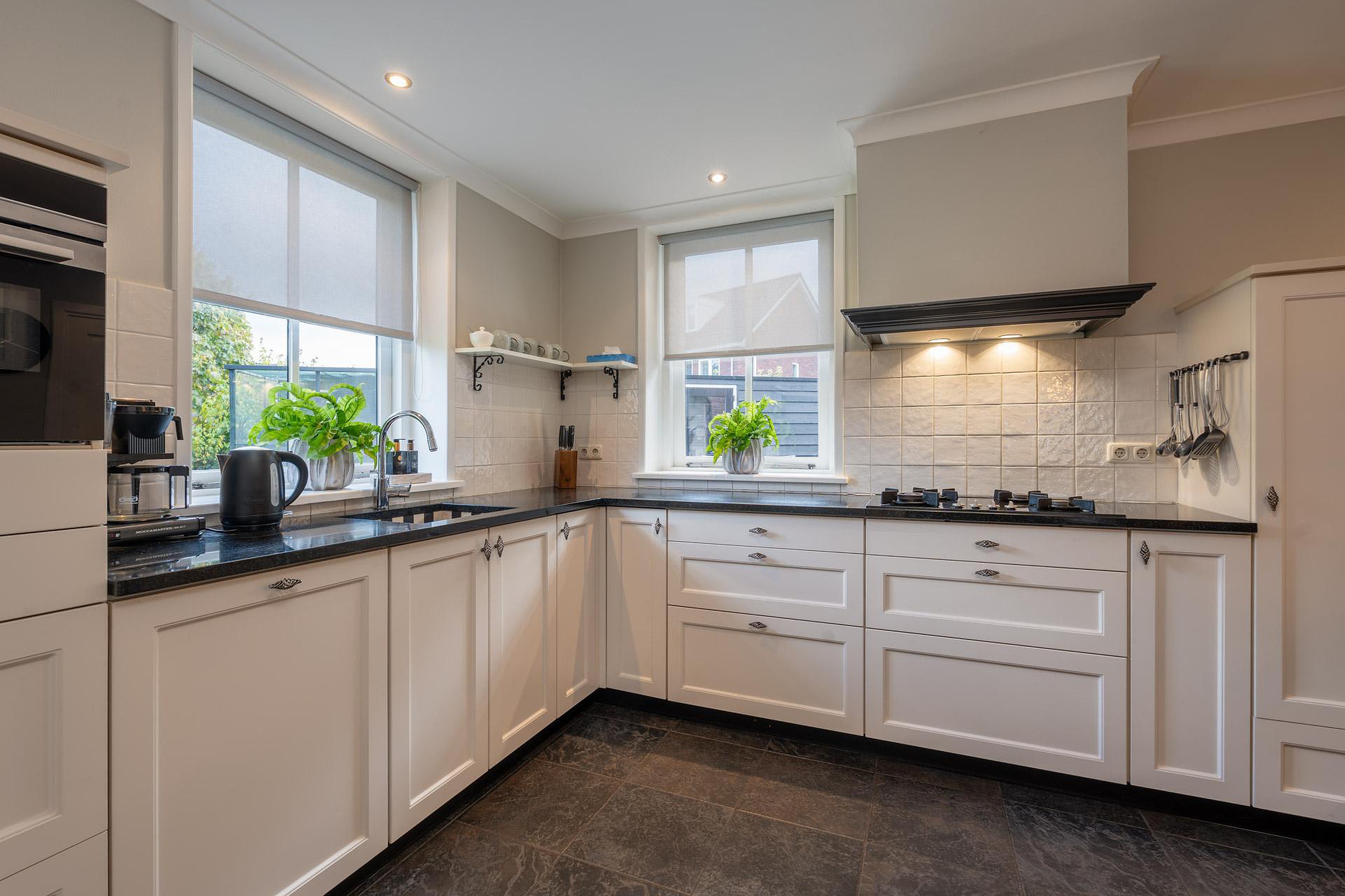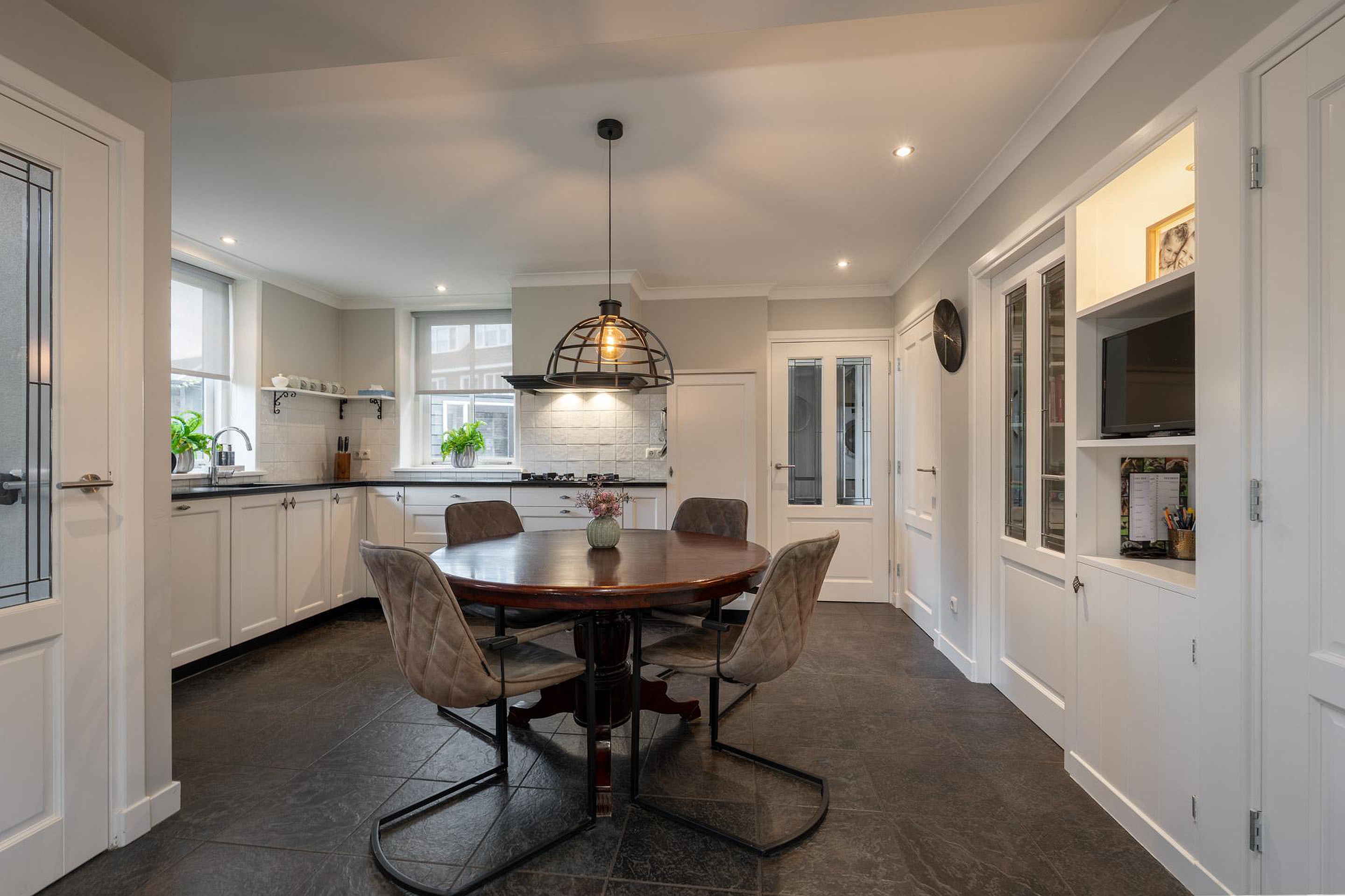 Entree met trapopgang en toegang tot de keuken en tuin. De dichte keuken is voorzien van o.a. gaskookplaat, combimagnetron, koelkast, vaatwasser, afzuigkap en close-in boiler, en beschikt daarnaast over vloerverwarming. De keuken biedt toegang tot de woonkamer met sfeervolle erker en prettig lichtinval. Daarnaast is de begane grond voorzien van een bijkeuken met trapkast, een praktisch kantoor/hobbykamer, een wasruimte en een modern toilet.