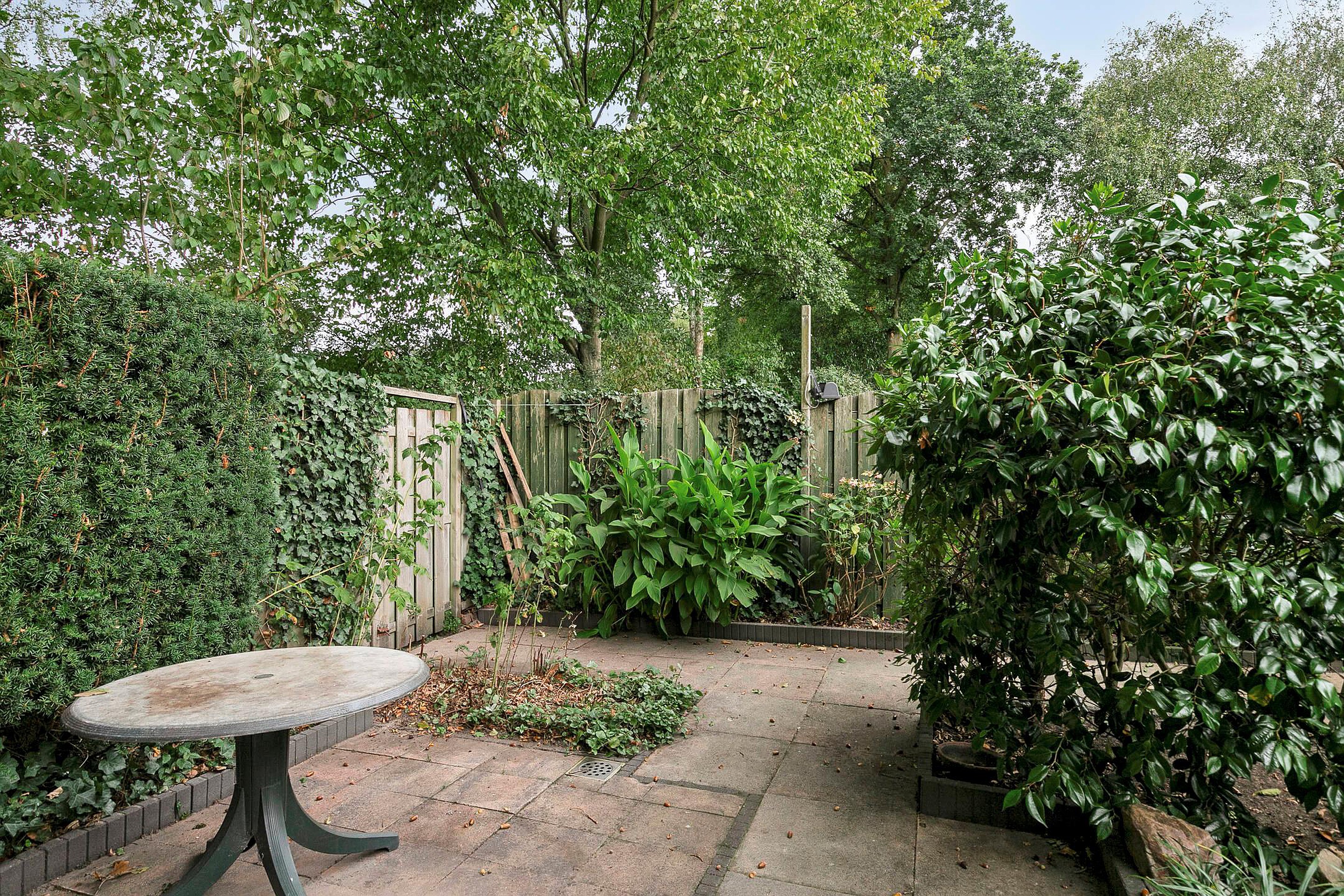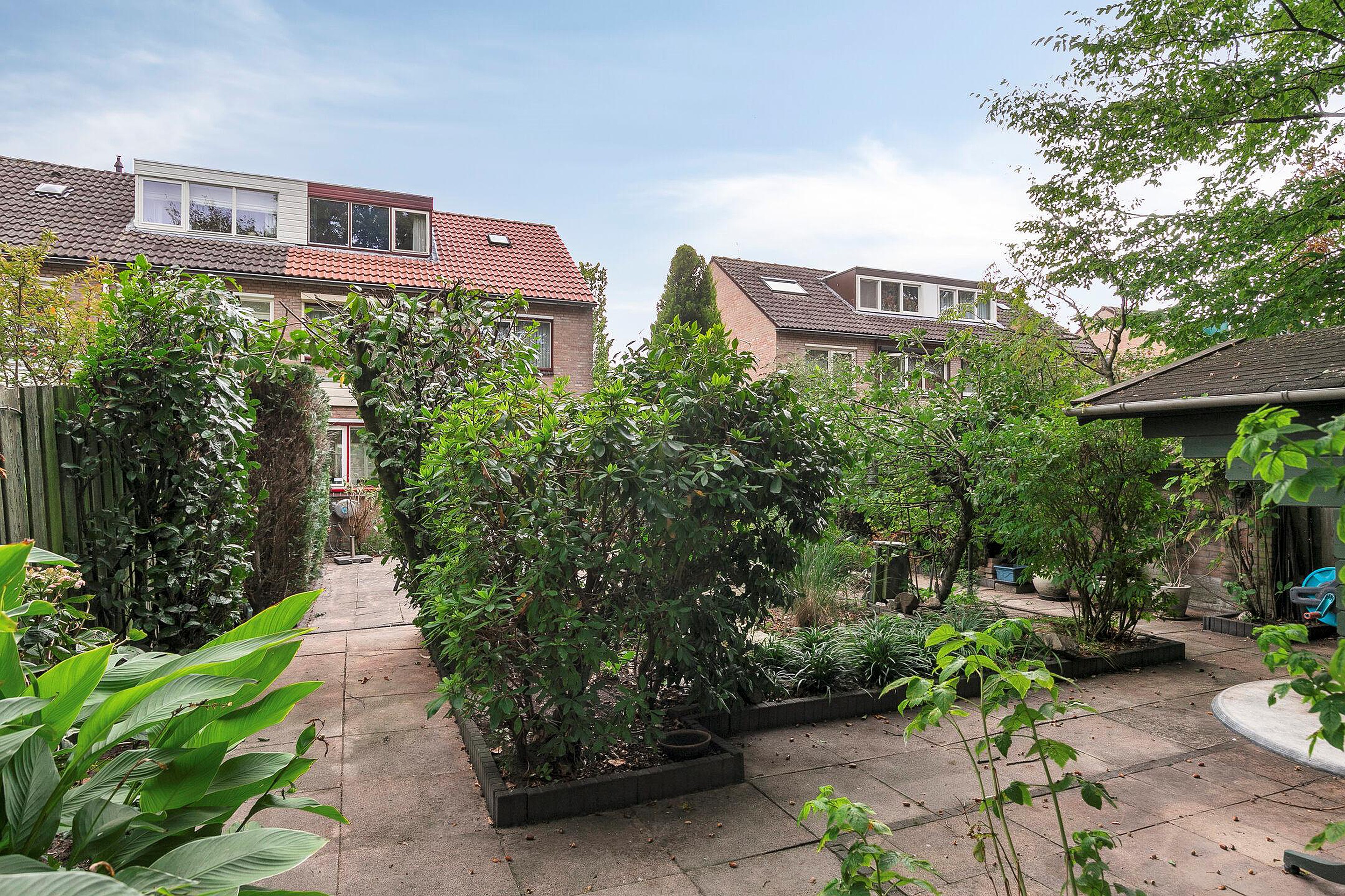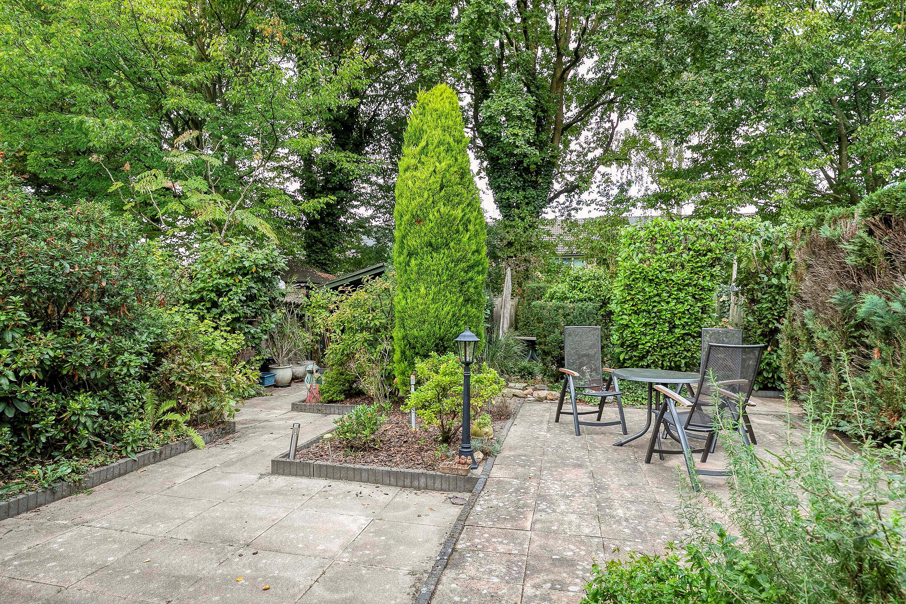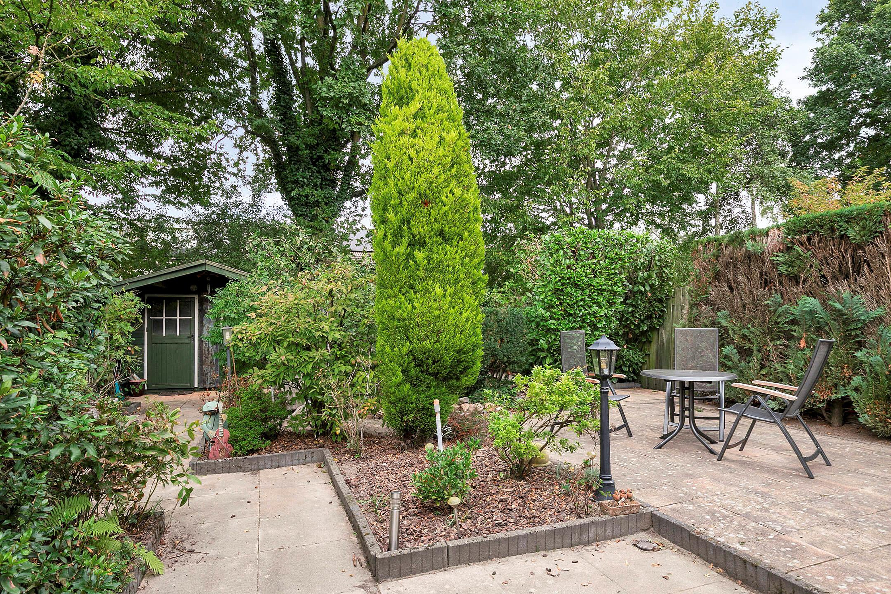 - Achtertuin (noordwest): sfeervolle tuin met diverse terrassen, borders en grote tegels. Achterin de tuin staat een houten tuinhuis.