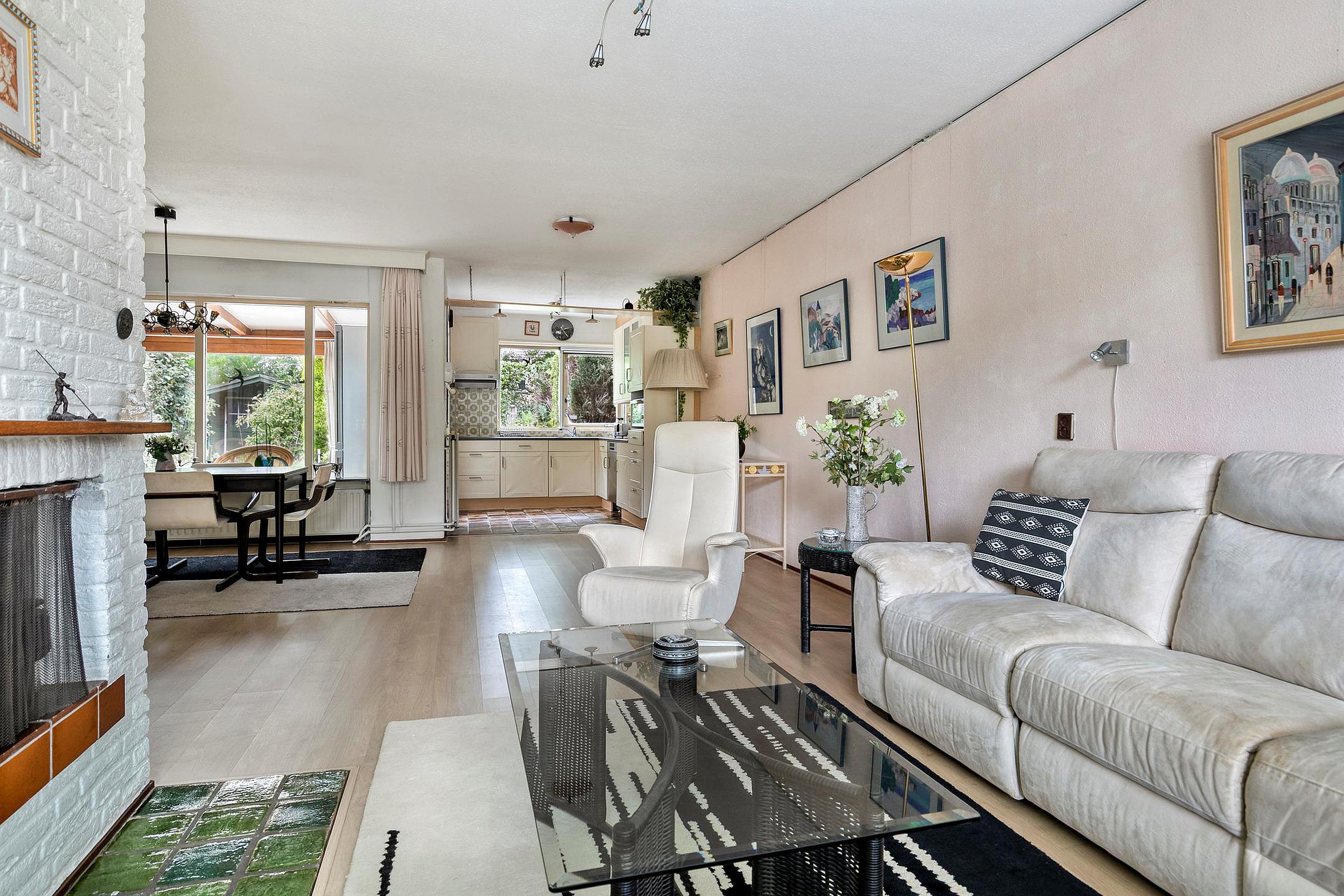 Bij binnenkomst treft u de ruime hal met toegang tot de eetkamer, de meterkast, het toilet en de bergruimte (voorheen garage). De woonkamer valt direct op door de fijne lichtinval, de royale indeling en de sfeervolle houthaard. Grote raampartijen aan de voor- en achterzijde versterken het gevoel van ruimte. Het trappengat bevindt zich achter dubbele deuren in de woonkamer.