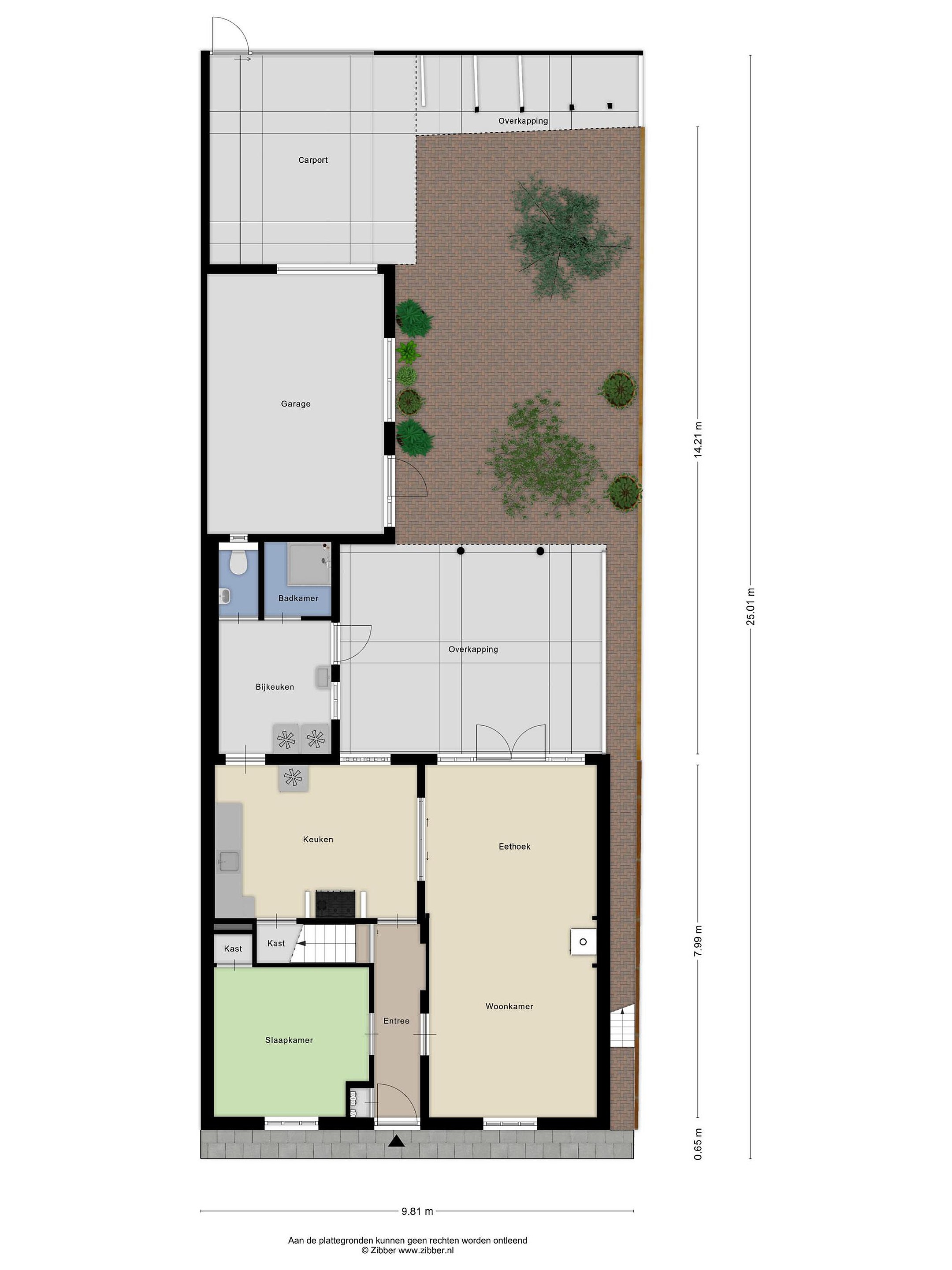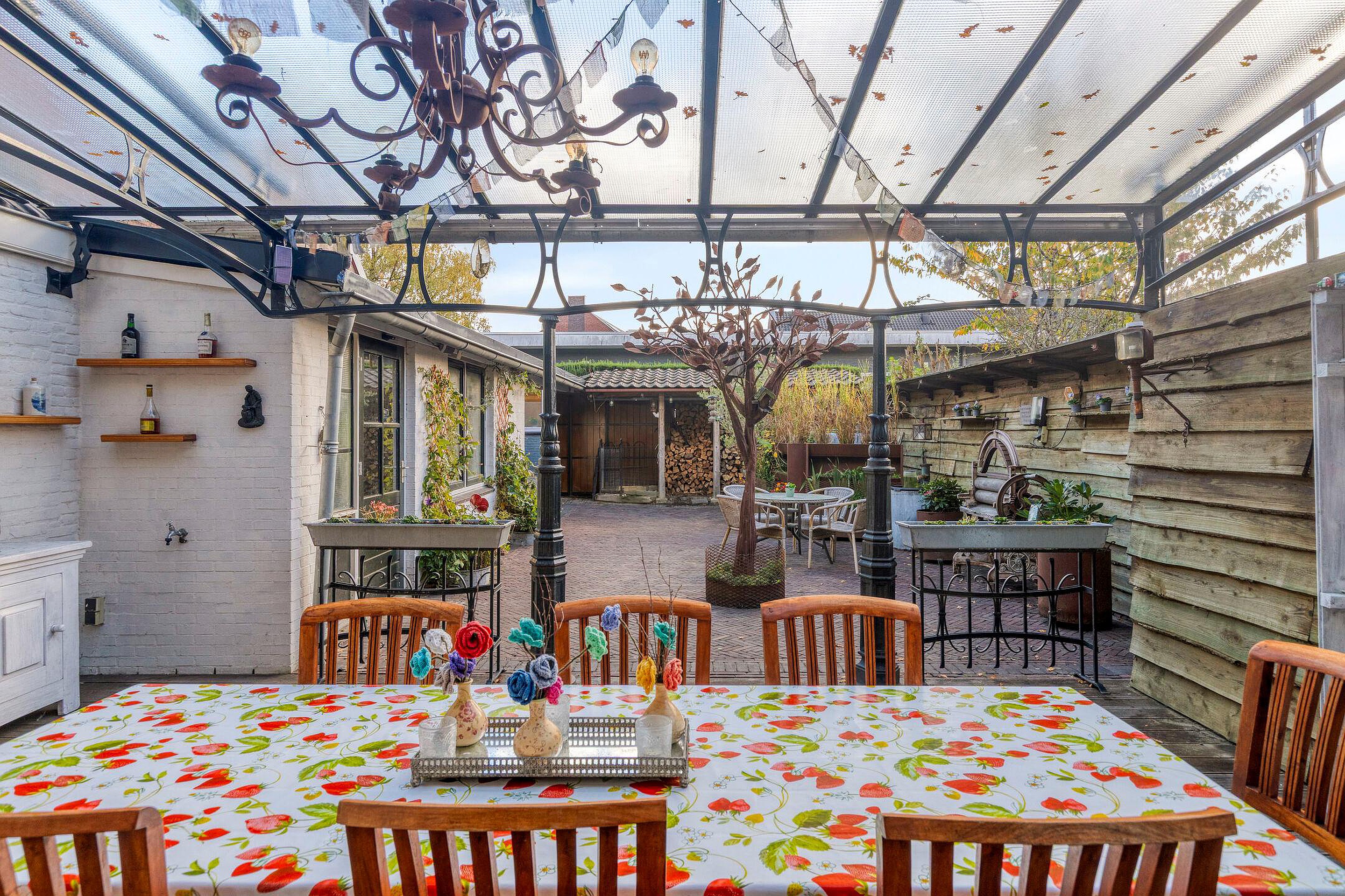 Verder is de tuin onderhoudsvriendelijk aangelegd met gebakken klinkers, diverse overkappingen en een sierlijke boom die zorgt voor een sfeervolle uitstraling. Via de zij-ingang is er een achterom en aan de achterzijde bevindt zich een grote schuifpoort naar de carport met parkeergelegenheid en toegang tot de ruime garage (24 m2).