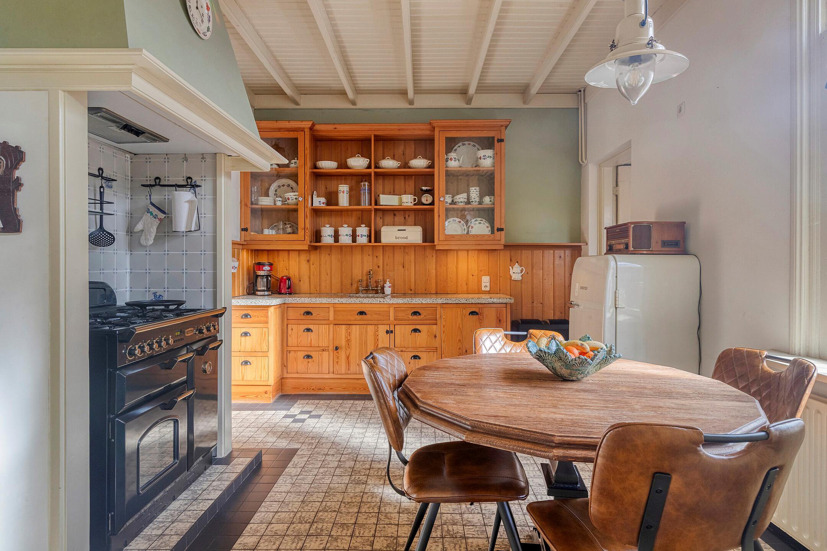 De keuken bevindt zich aan de achterzijde en vormt het hart van het huis. Deze landelijke keuken is voorzien van een Falcon-fornuis met oven, geplaatst in een karakteristieke schouw, een granieten werkblad, en volop kast- en werkruimte. Authentieke details zoals glas-in-loodramen, tegelwerk en ensuite schuifdeuren versterken de nostalgische sfeer.