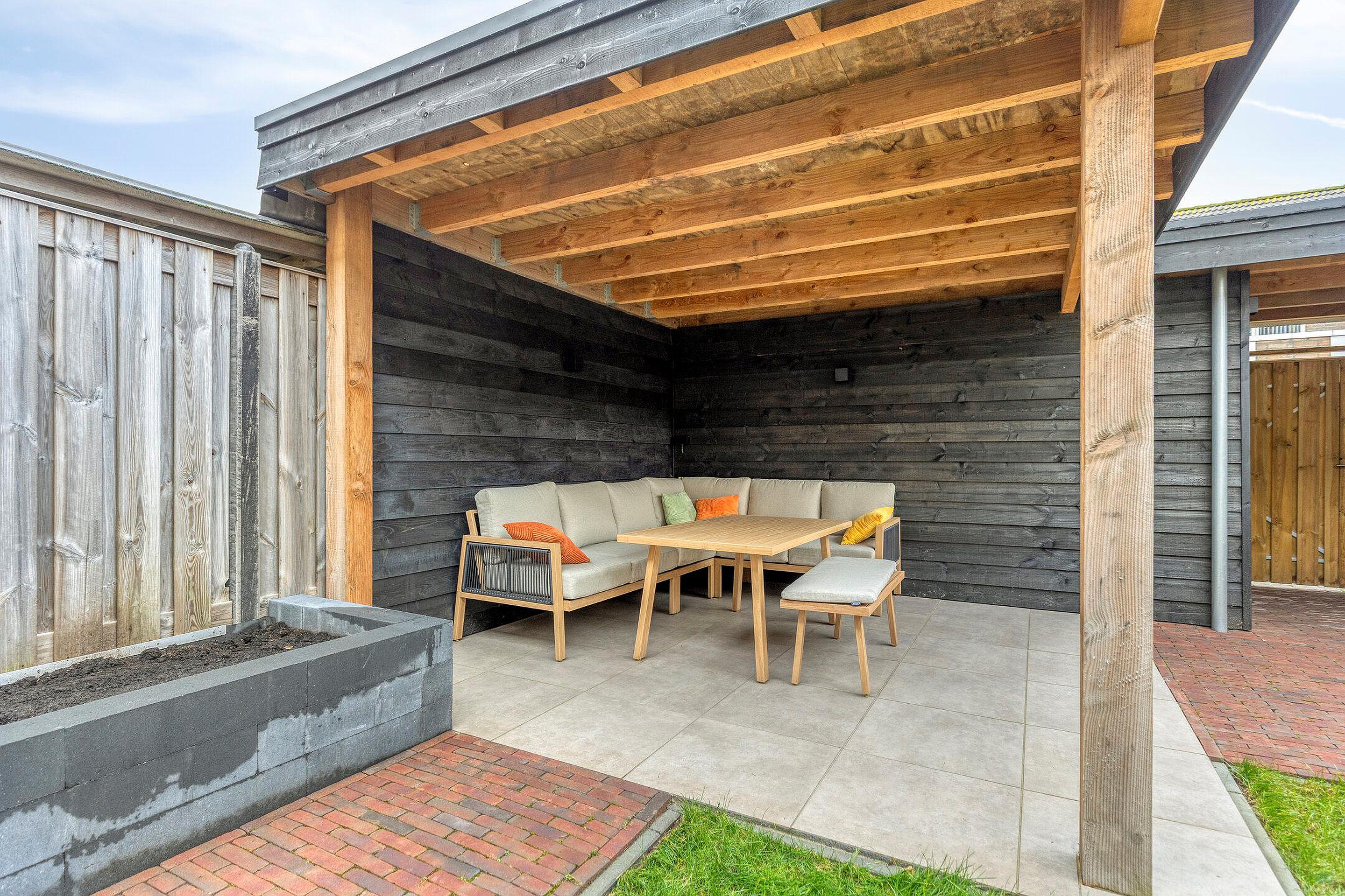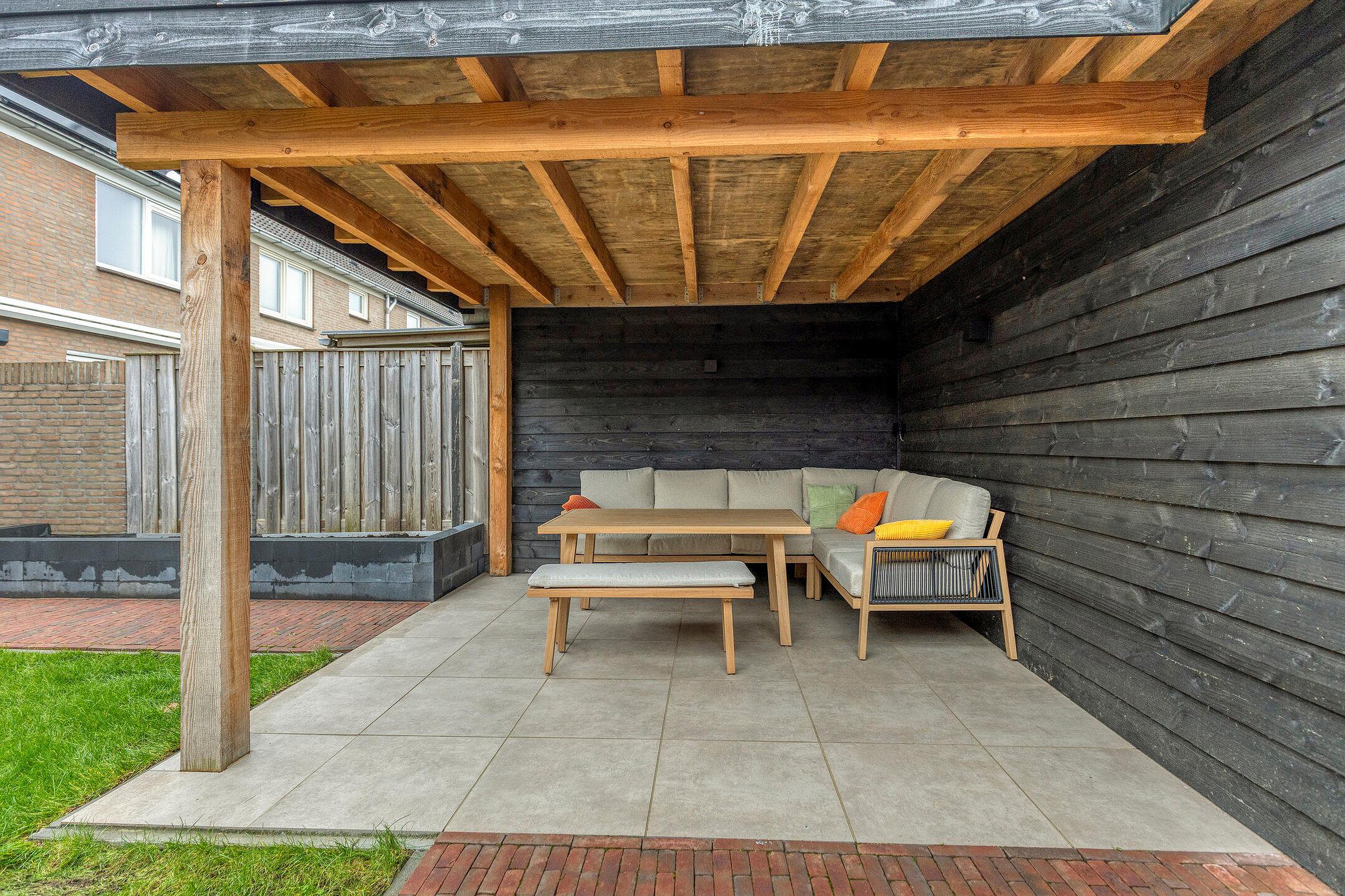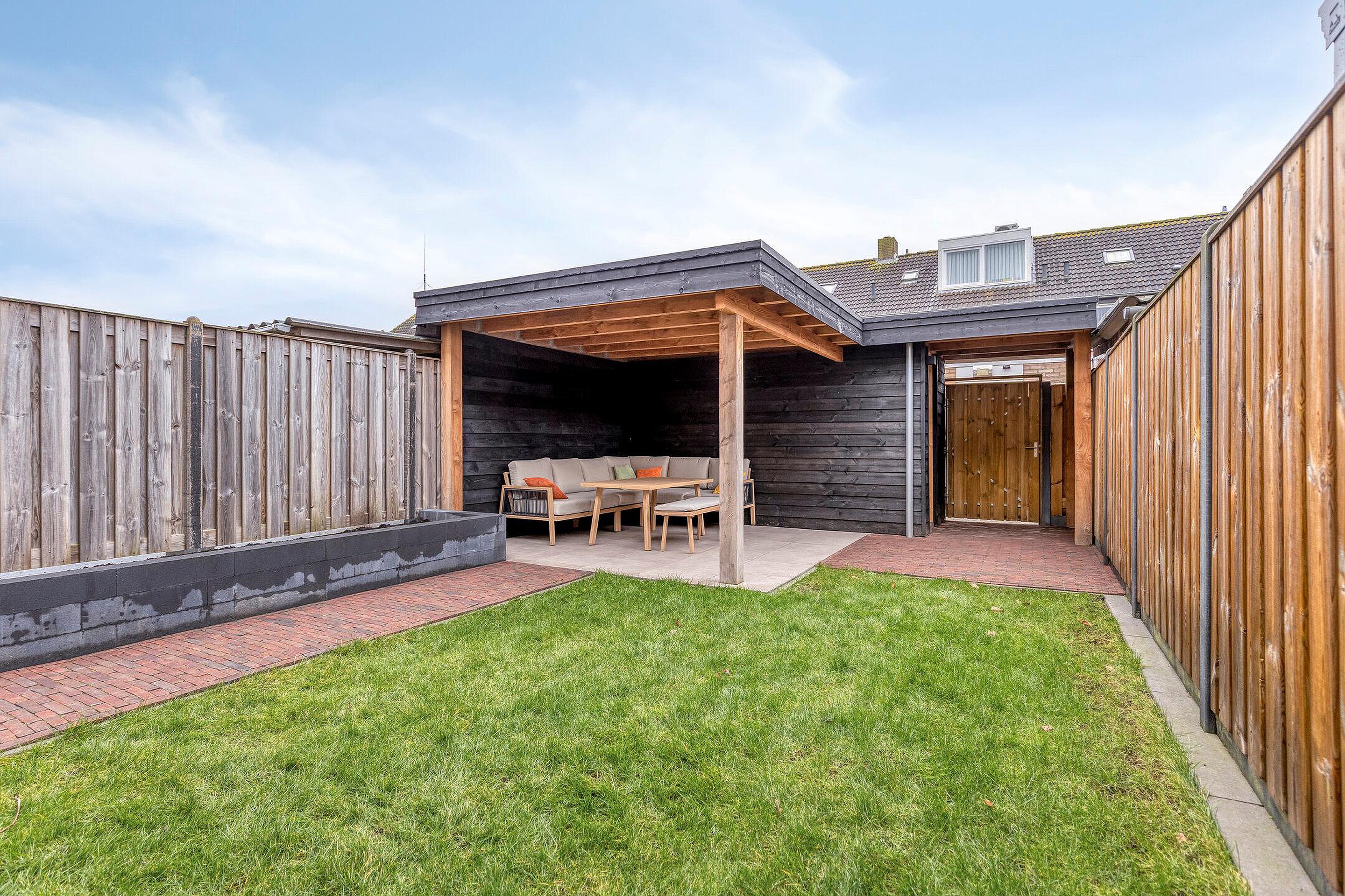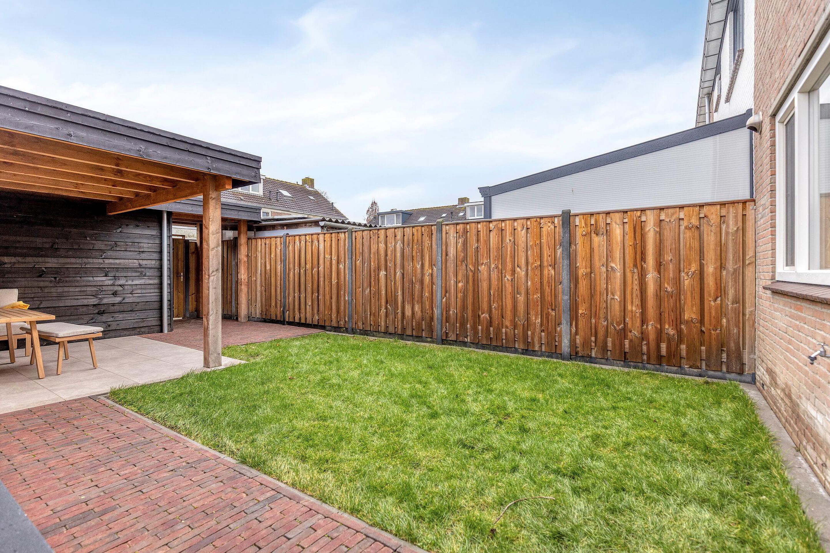 De moderne achtertuin is verzorgd aangelegd en voorzien van een grote plantenbak en een grasmat. Het overdekte terras, direct grenzend aan de berging, maakt het mogelijk om op elk moment van de dag van het buitenleven te genieten. Daarnaast beschikt de tuin over een achterom.