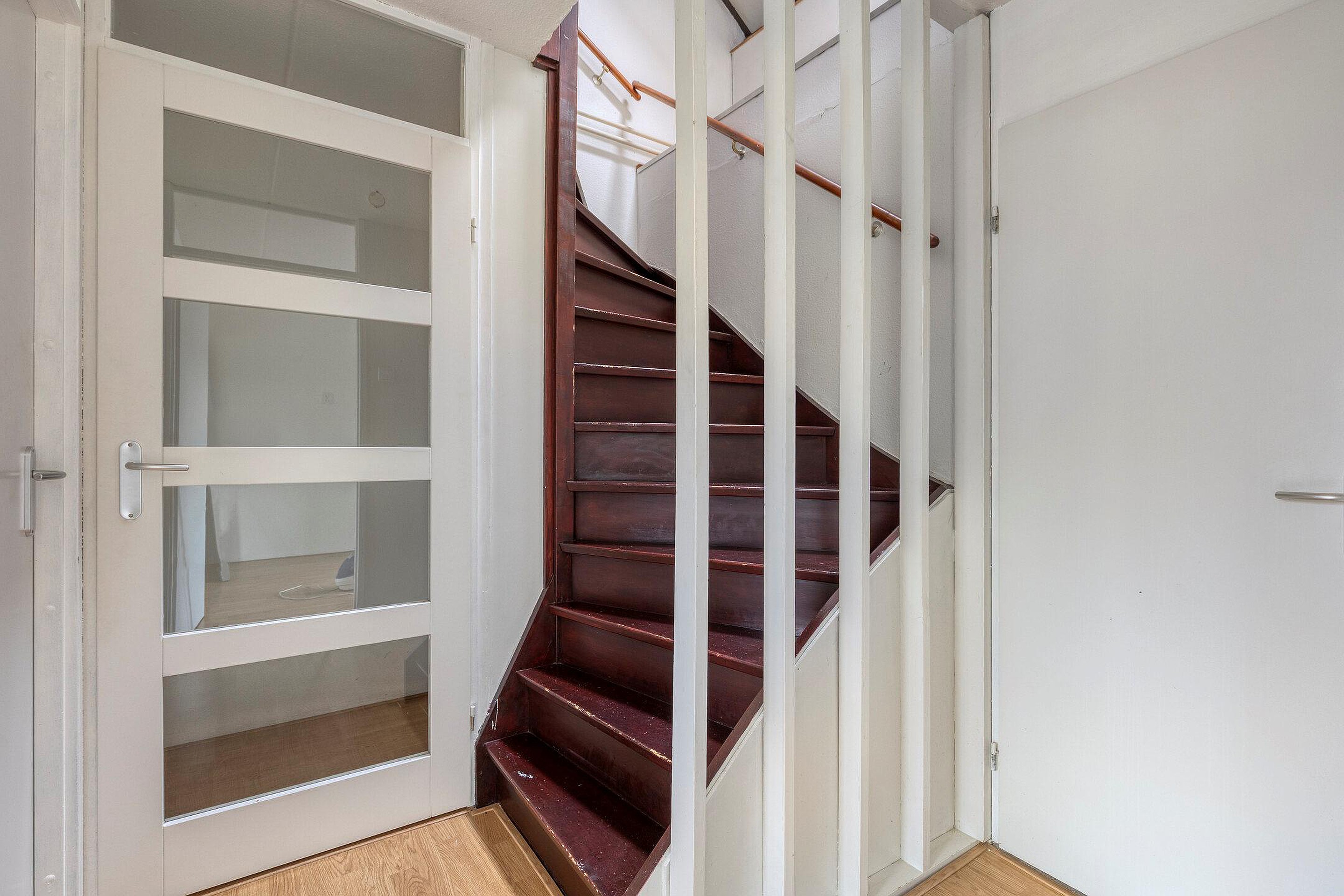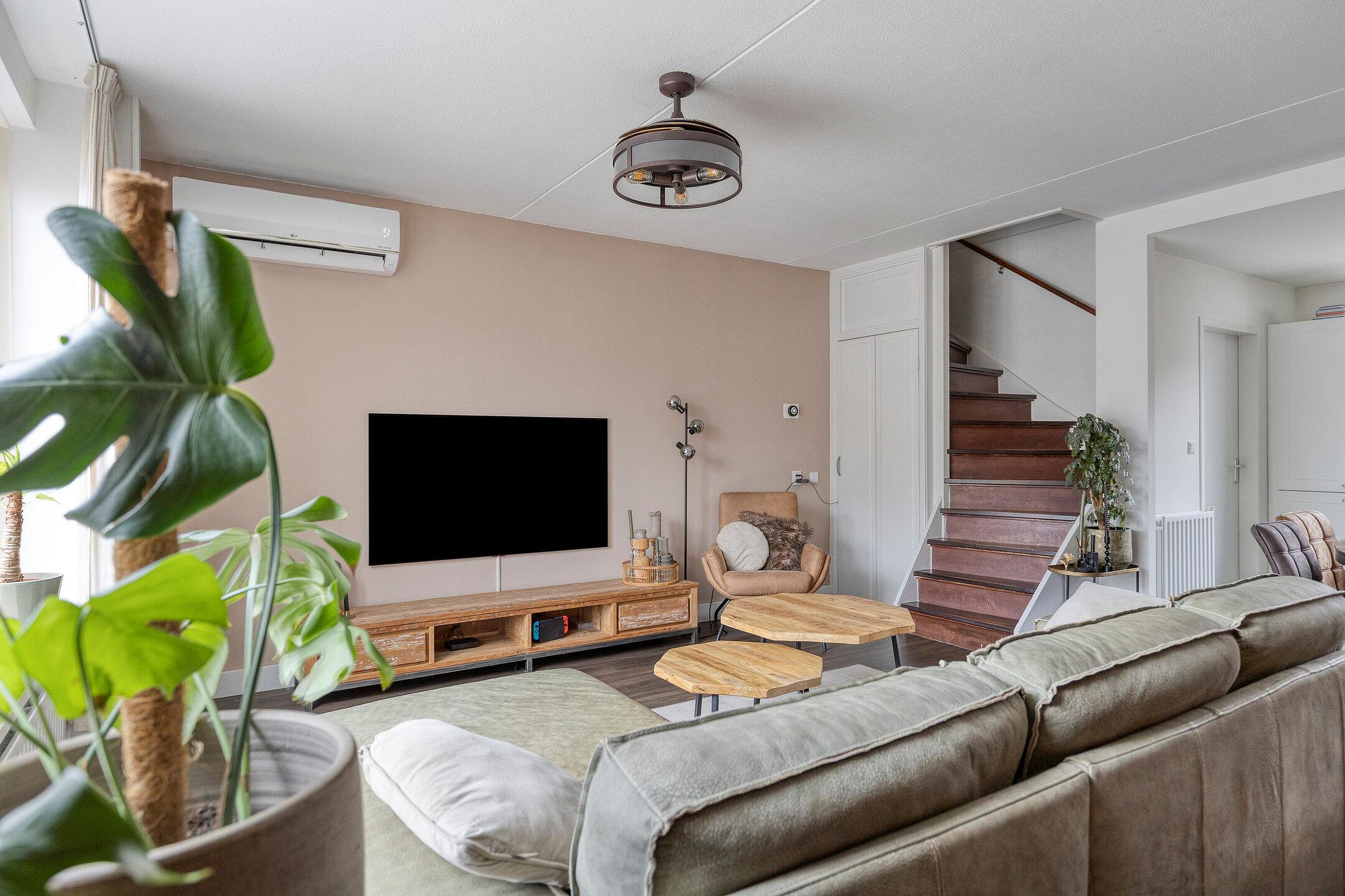 De woonkamer is licht en strak afgewerkt met gestucte wanden en een moderne pvc-vloer. De grote raampartij zorgt voor veel natuurlijke lichtinval en een prettige sfeer. Onder de trap bevindt zich een praktische bergkast.