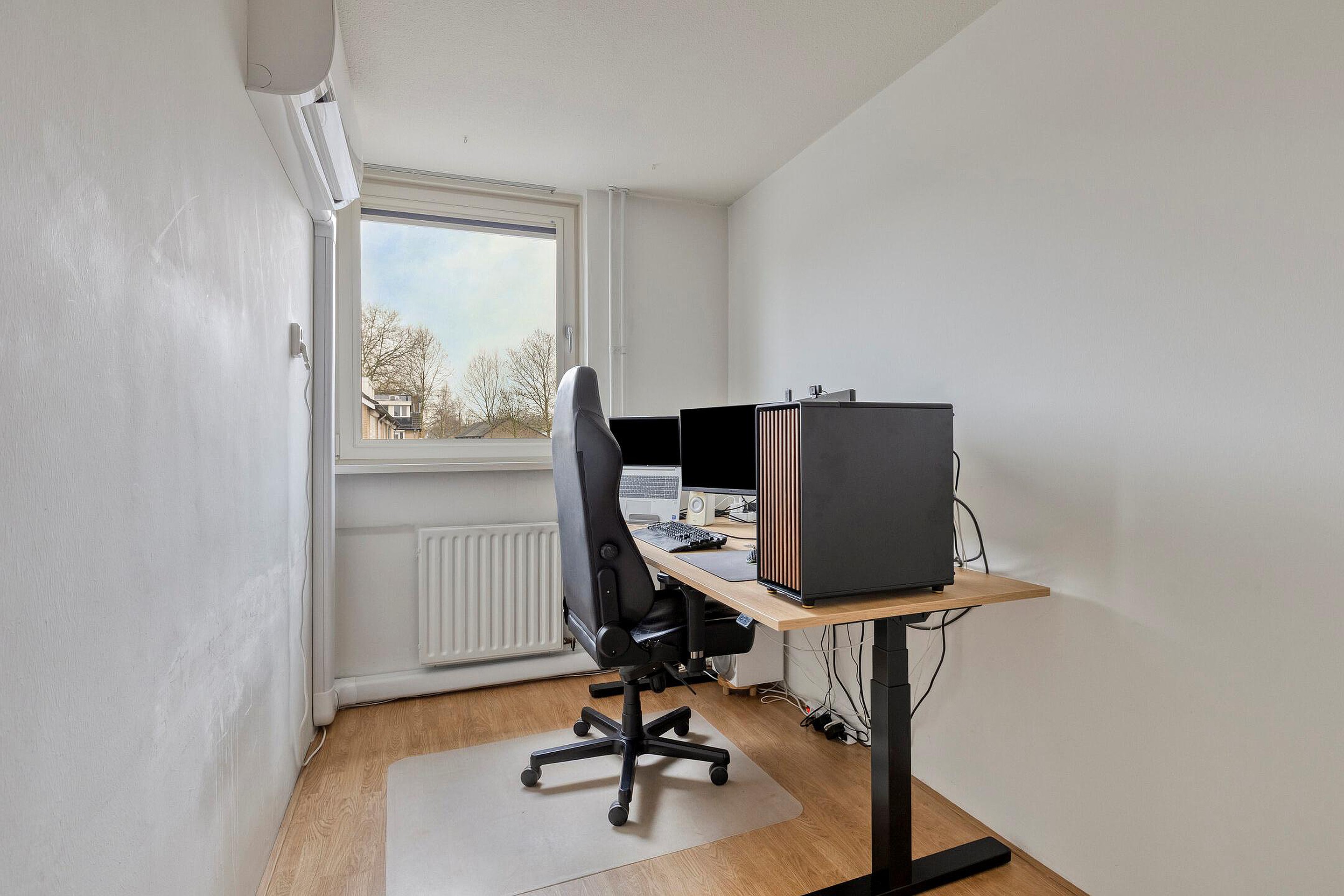 - Slaapkamer 2: ca. 13 m2, gelegen aan de voorzijde, voorzien van airco, strak gestucte wanden en laminaatvloer