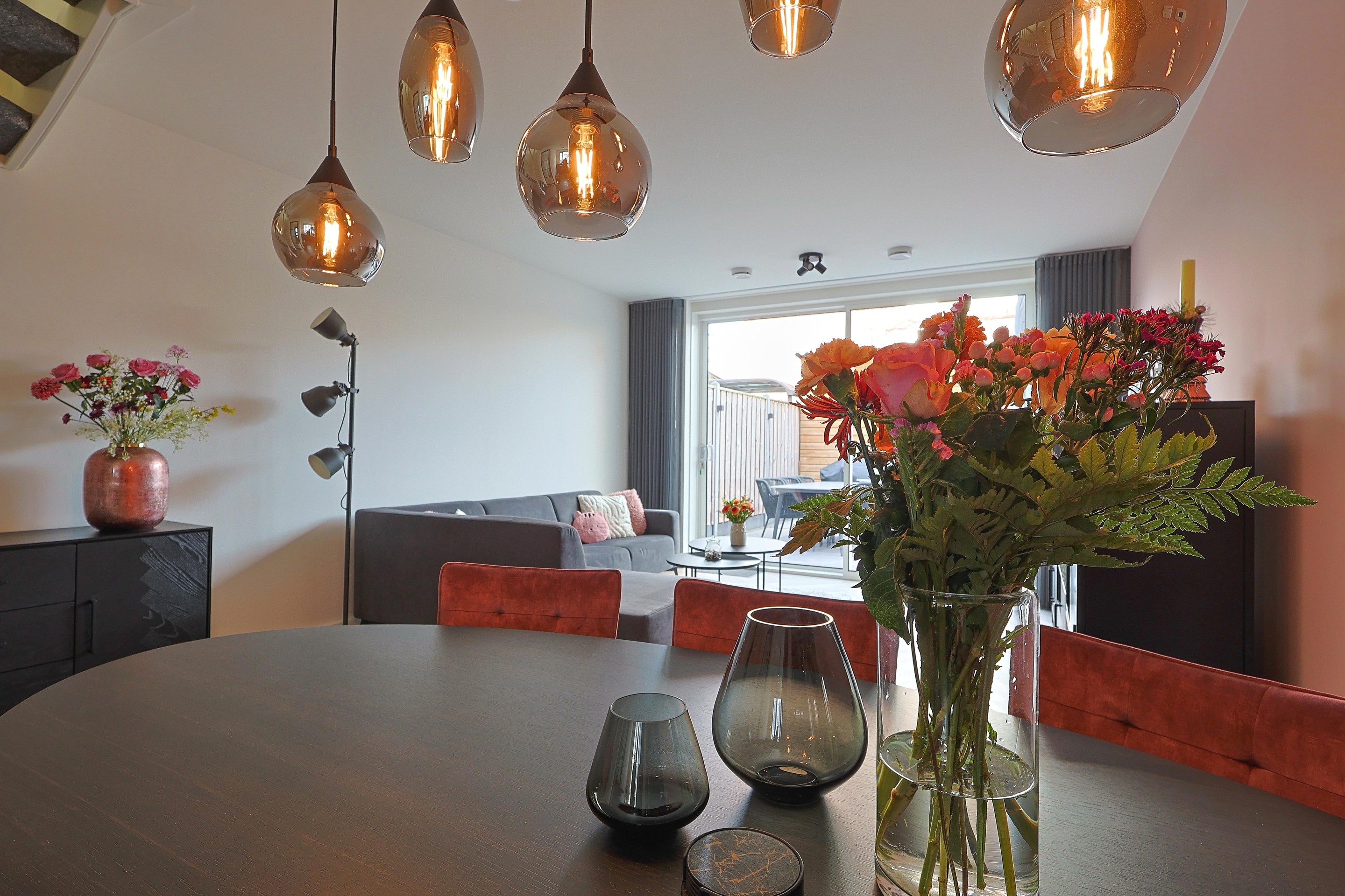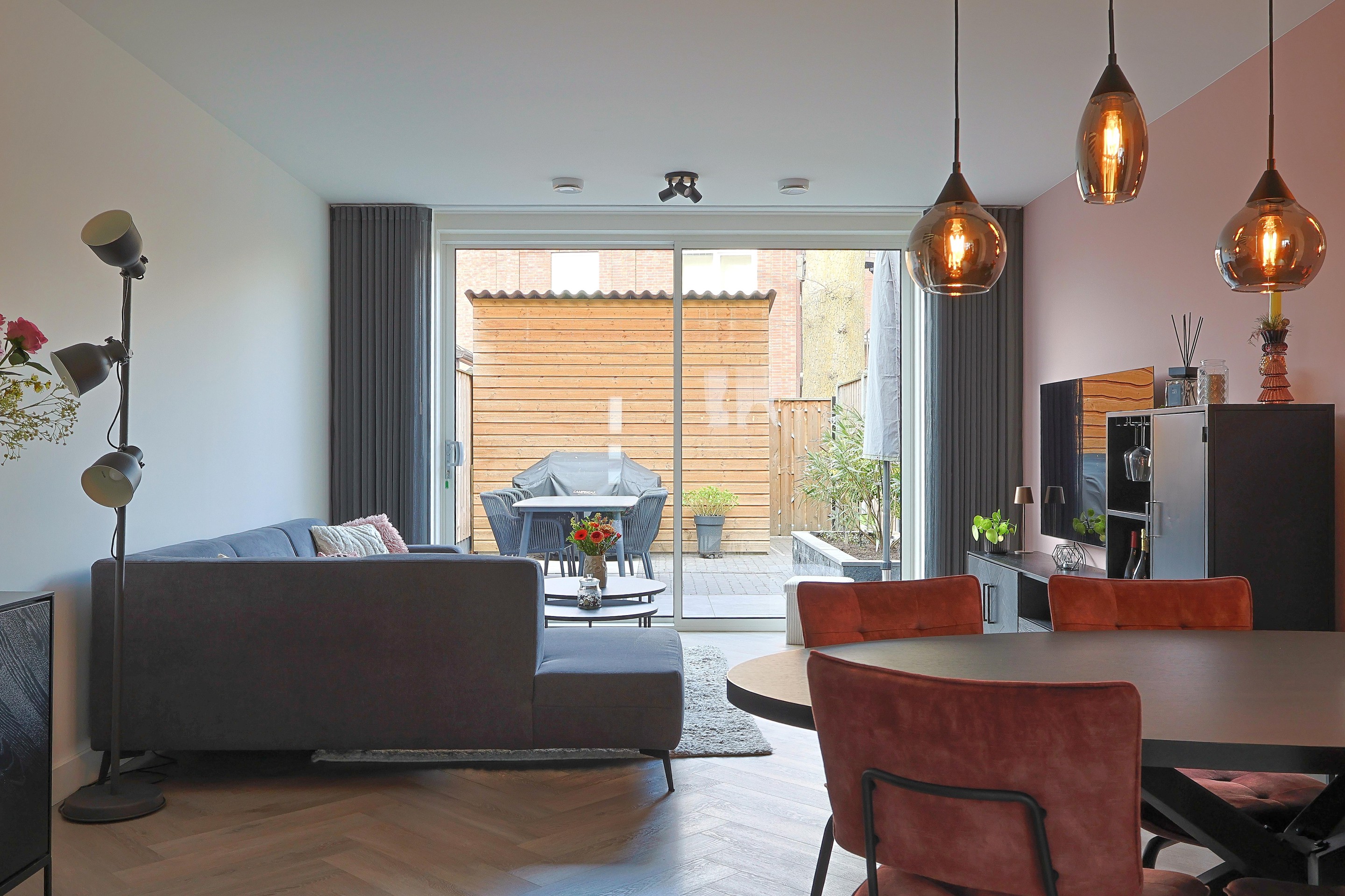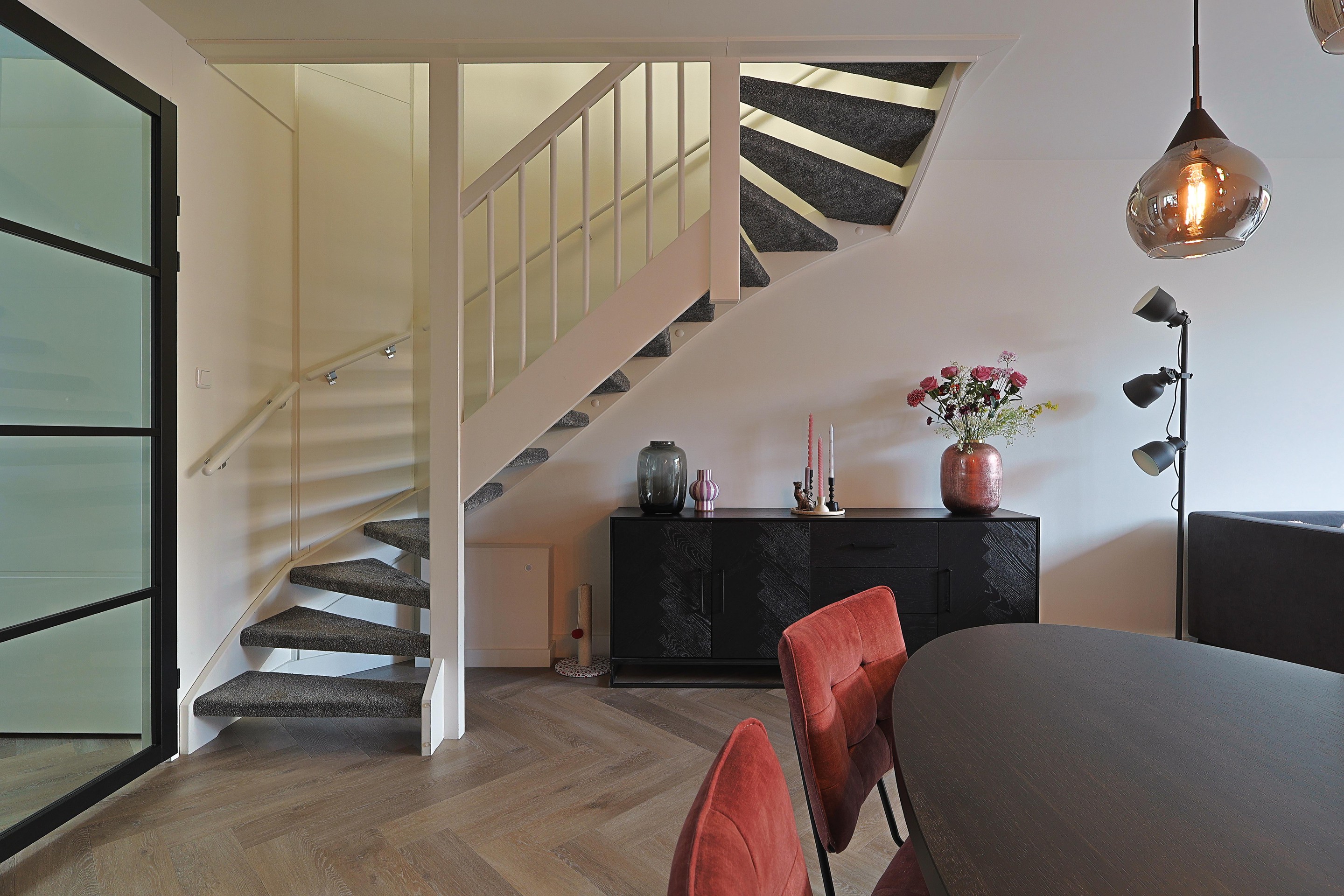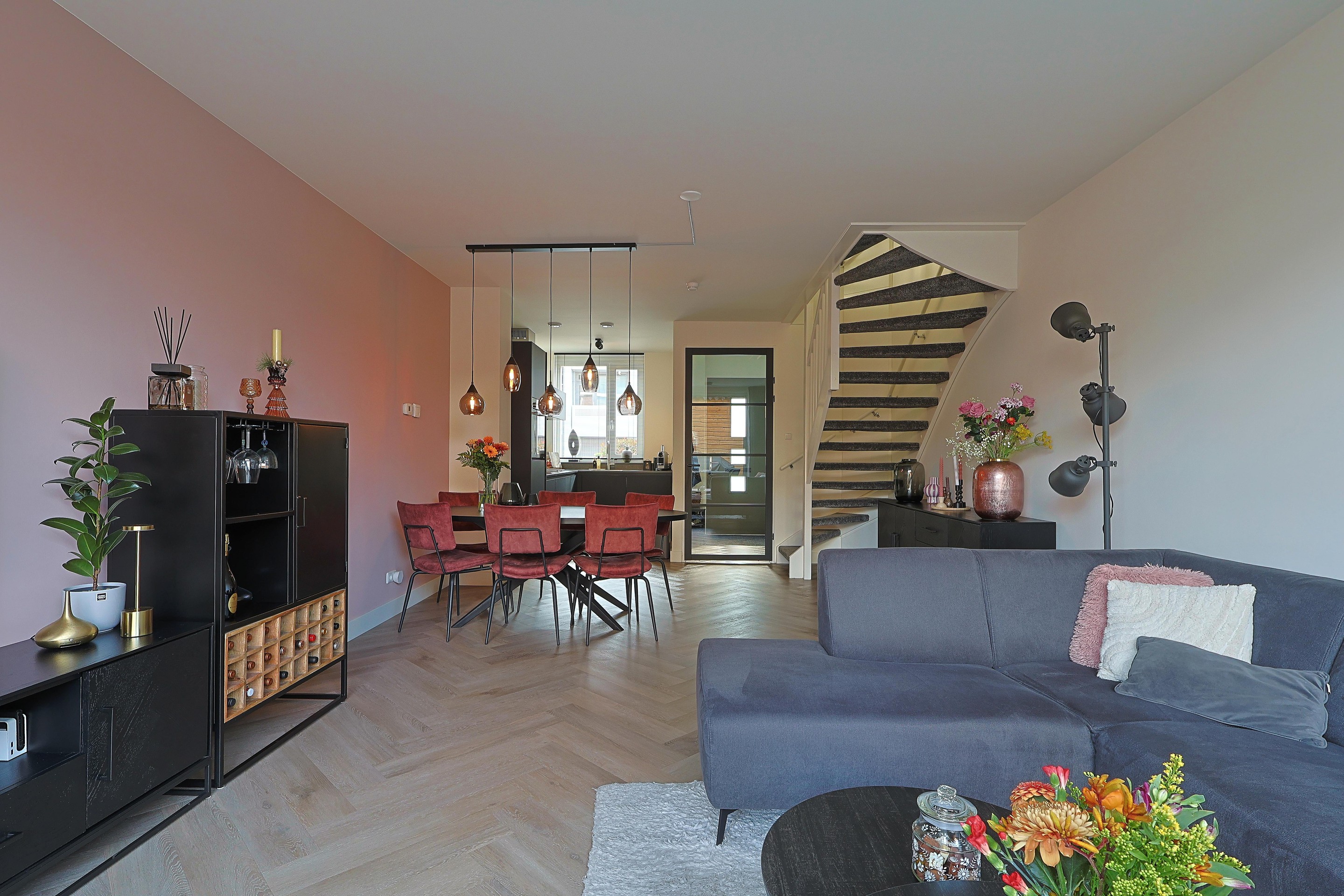 Verder in de woonkamer de open trap, ruimte voor de eethoek en een royale TV-hoek met de brede schuifpui naar de achtertuin.