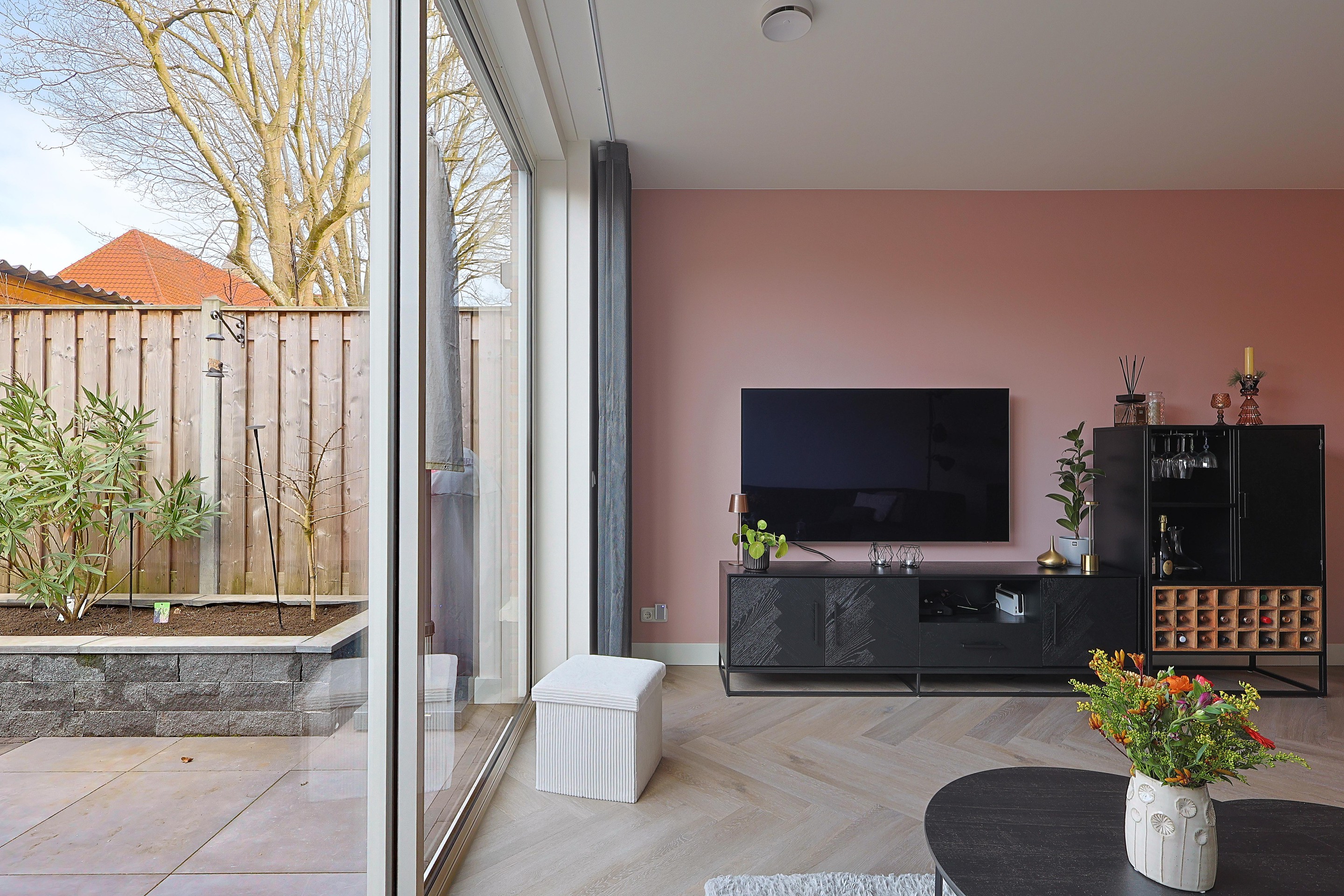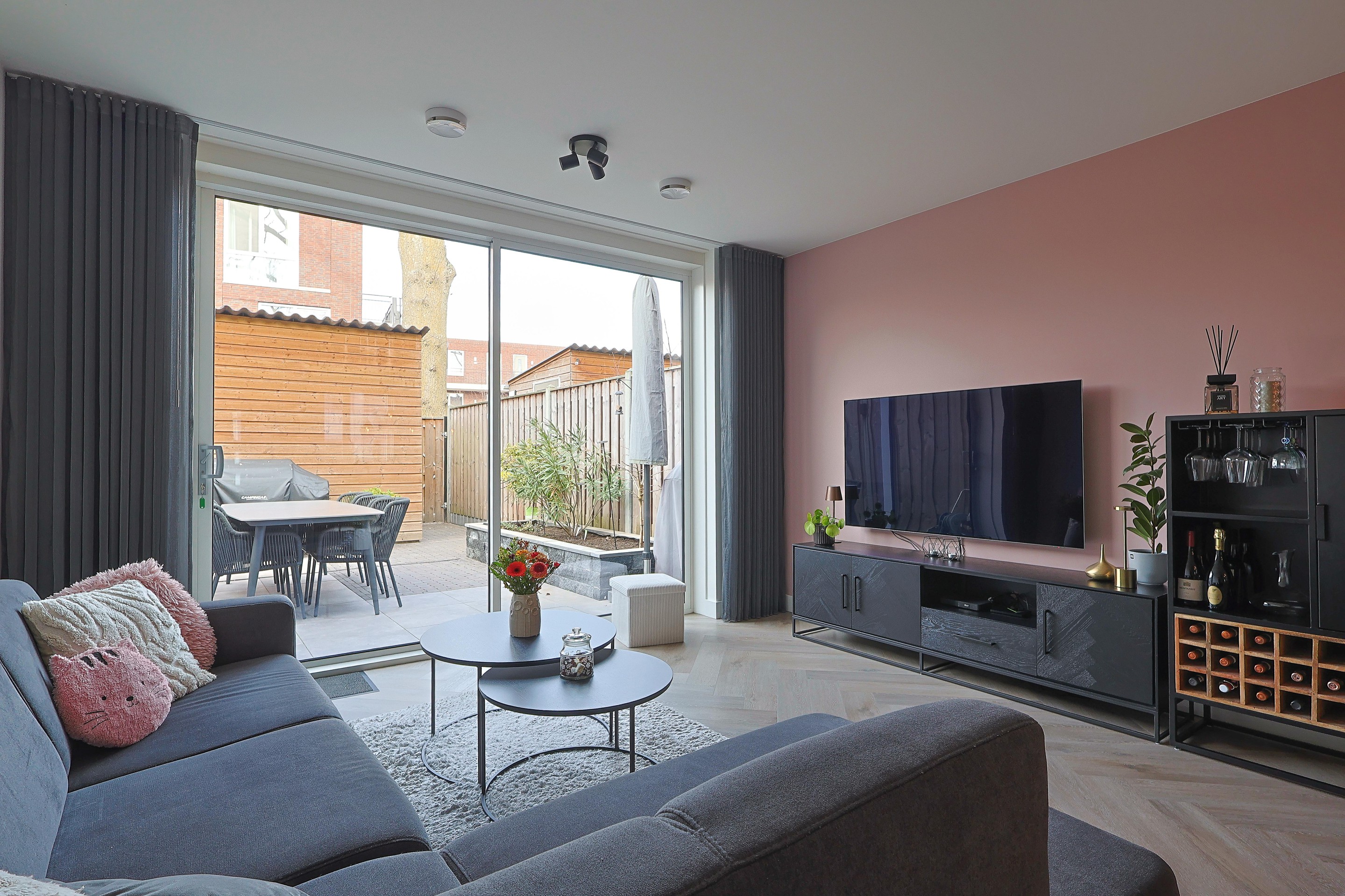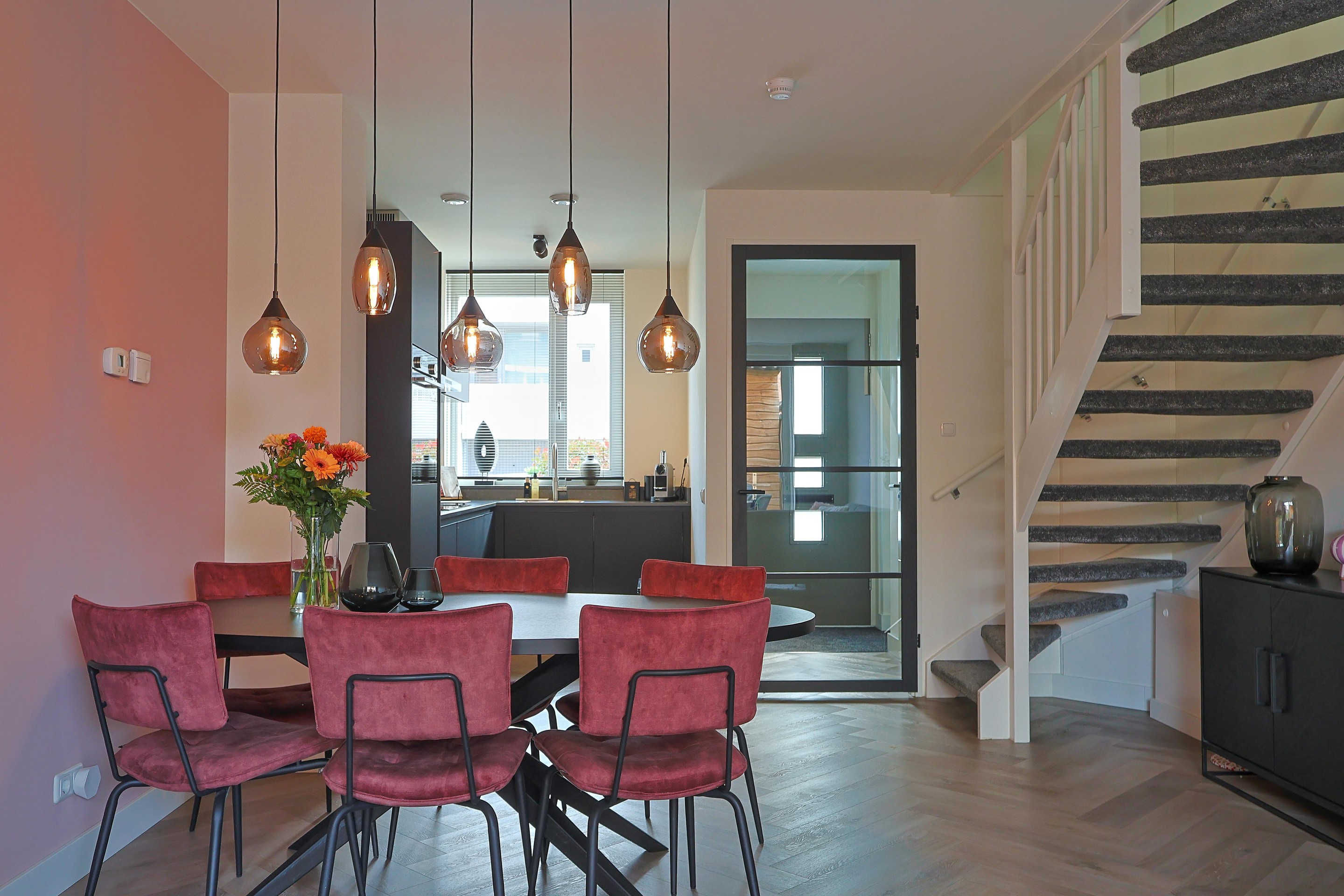 Verder in de woonkamer de open trap, ruimte voor de eethoek en een royale TV-hoek met de brede schuifpui naar de achtertuin.