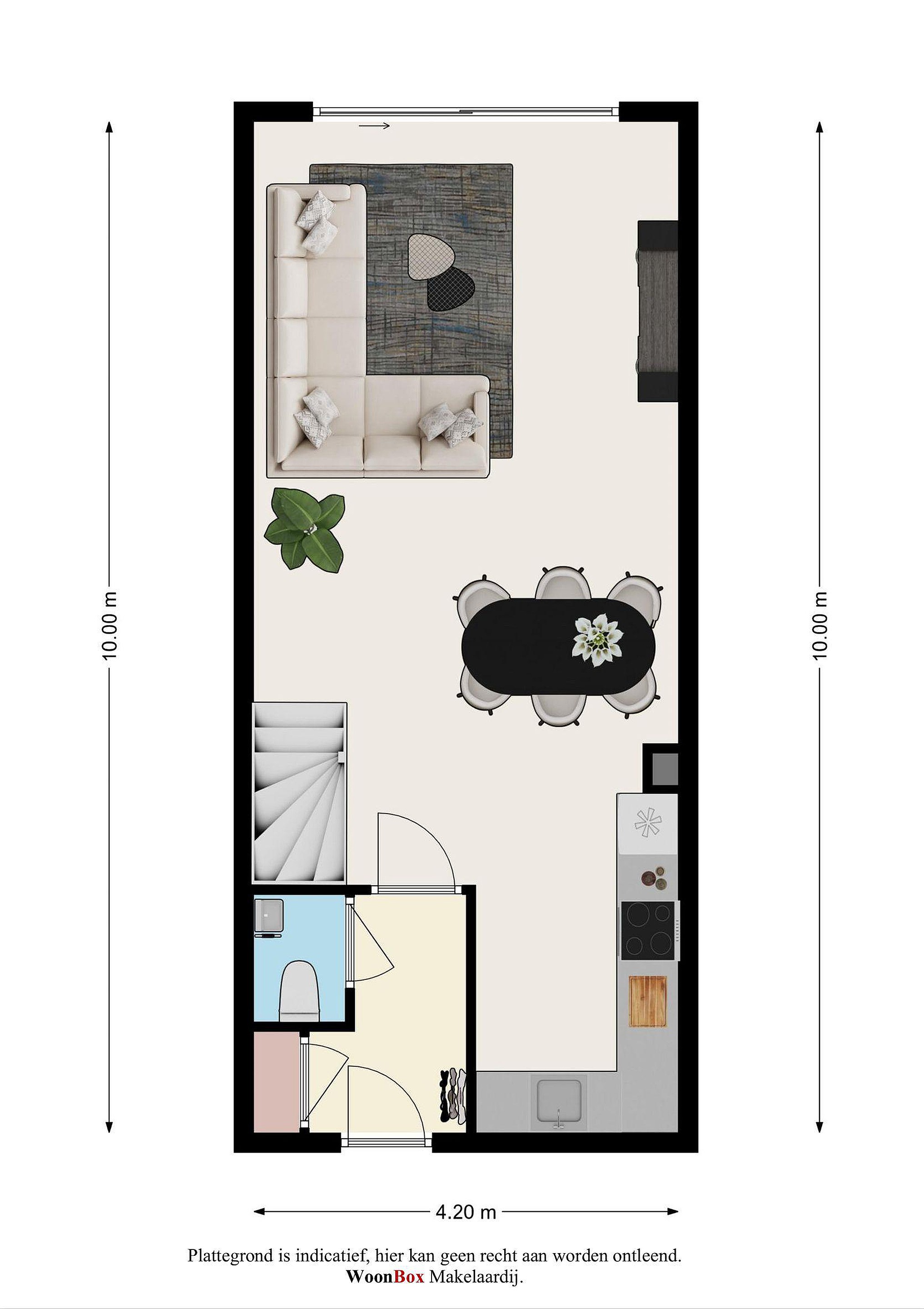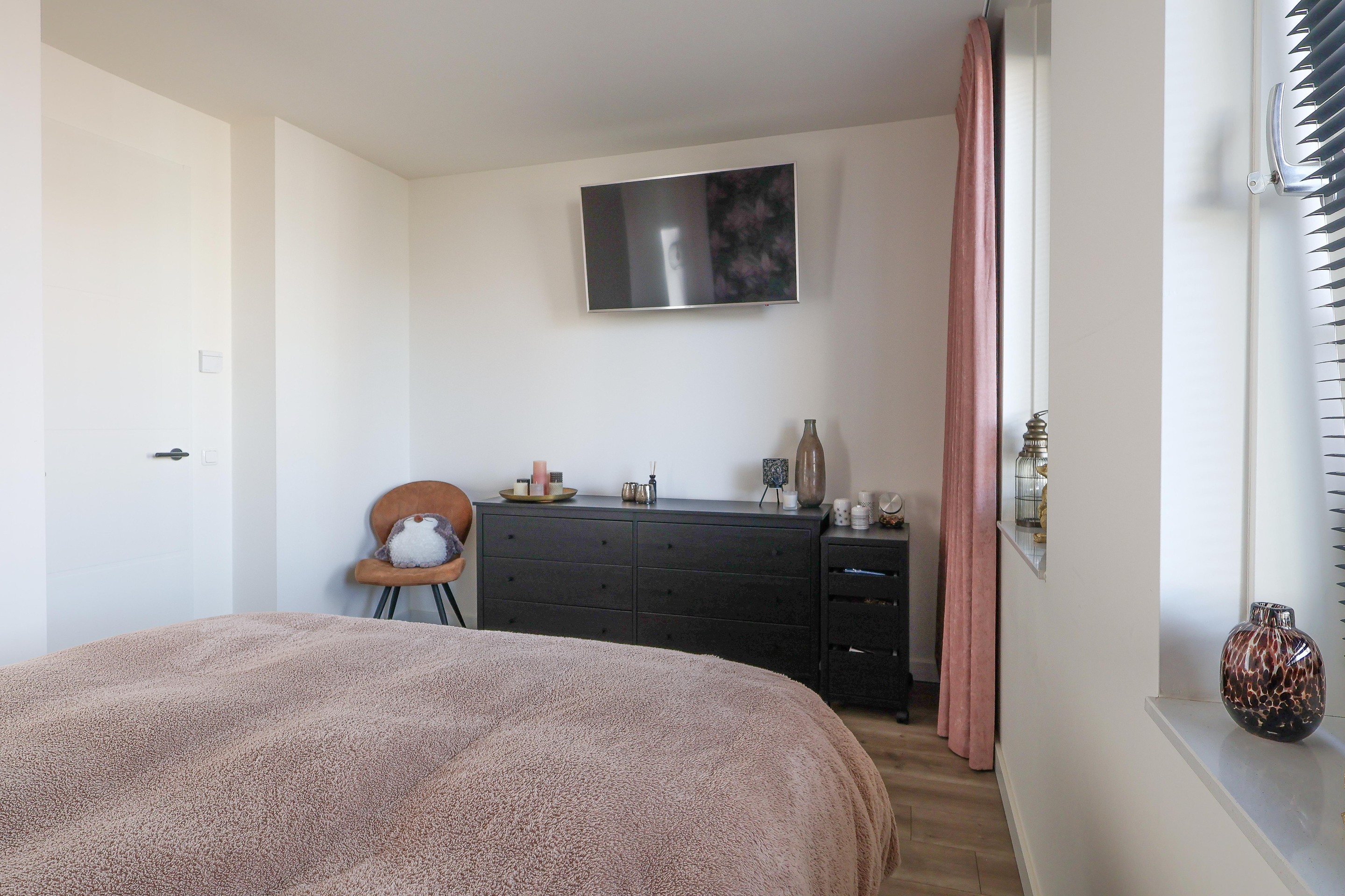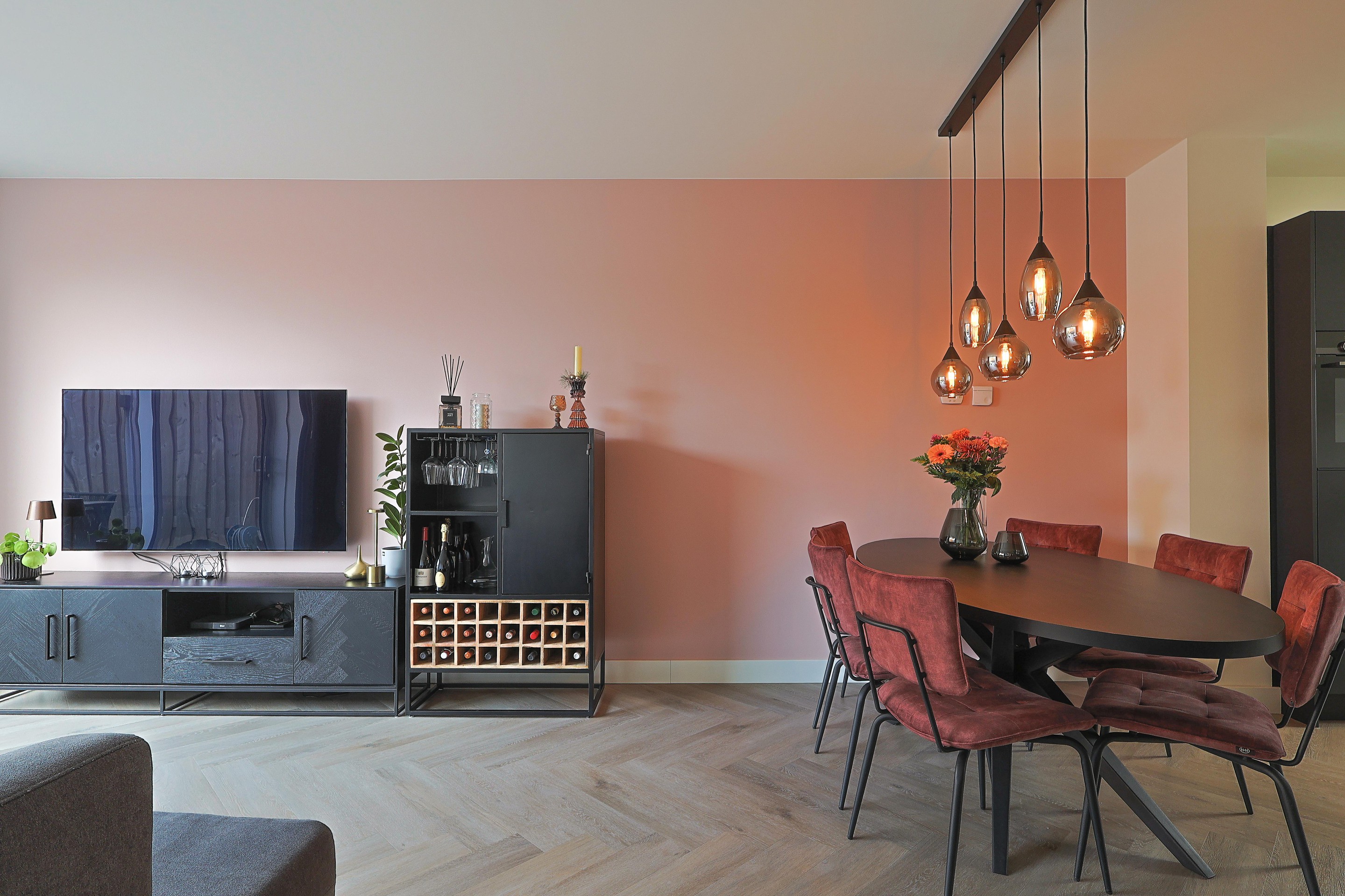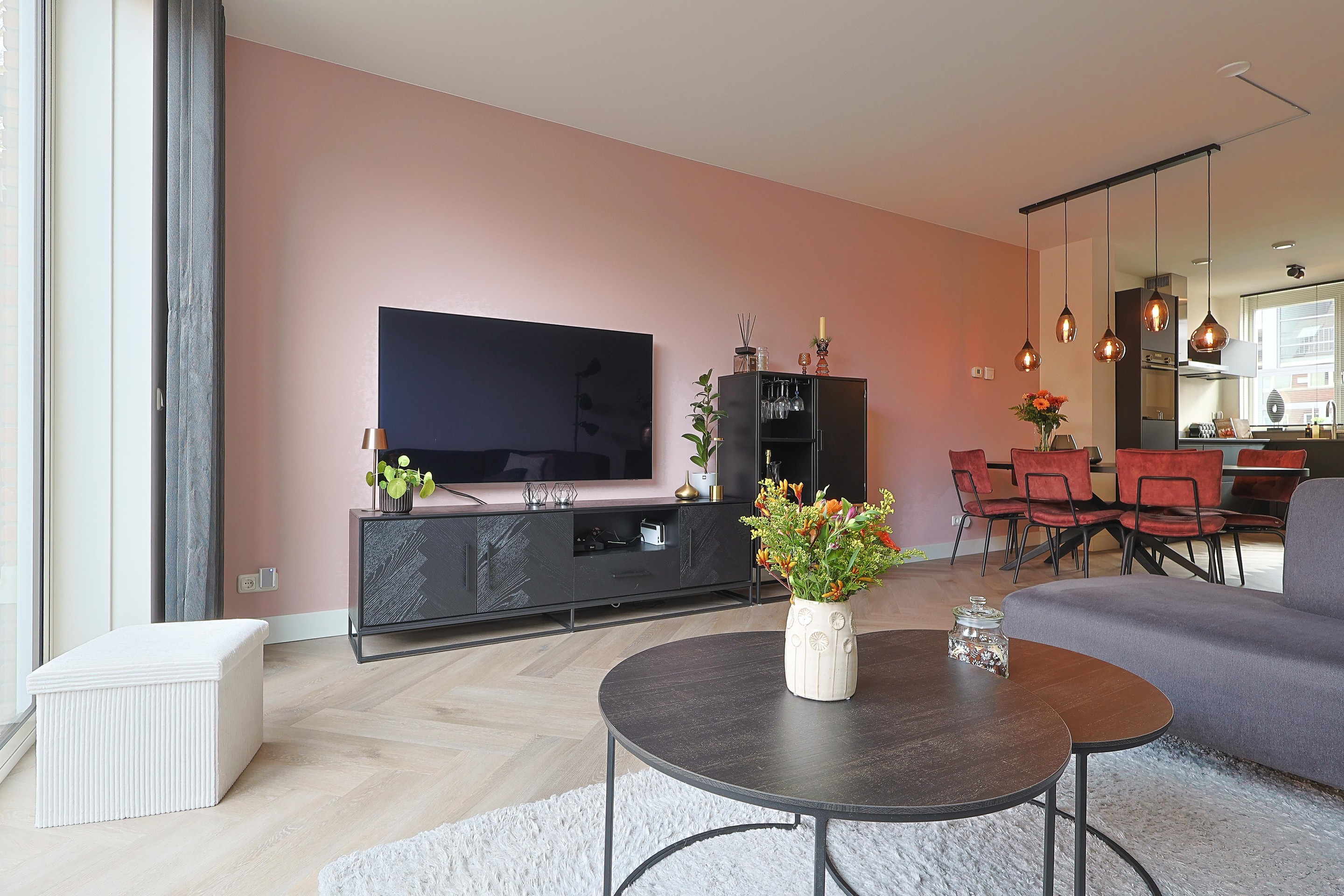Verder in de woonkamer de open trap, ruimte voor de eethoek en een royale TV-hoek met de brede schuifpui naar de achtertuin.