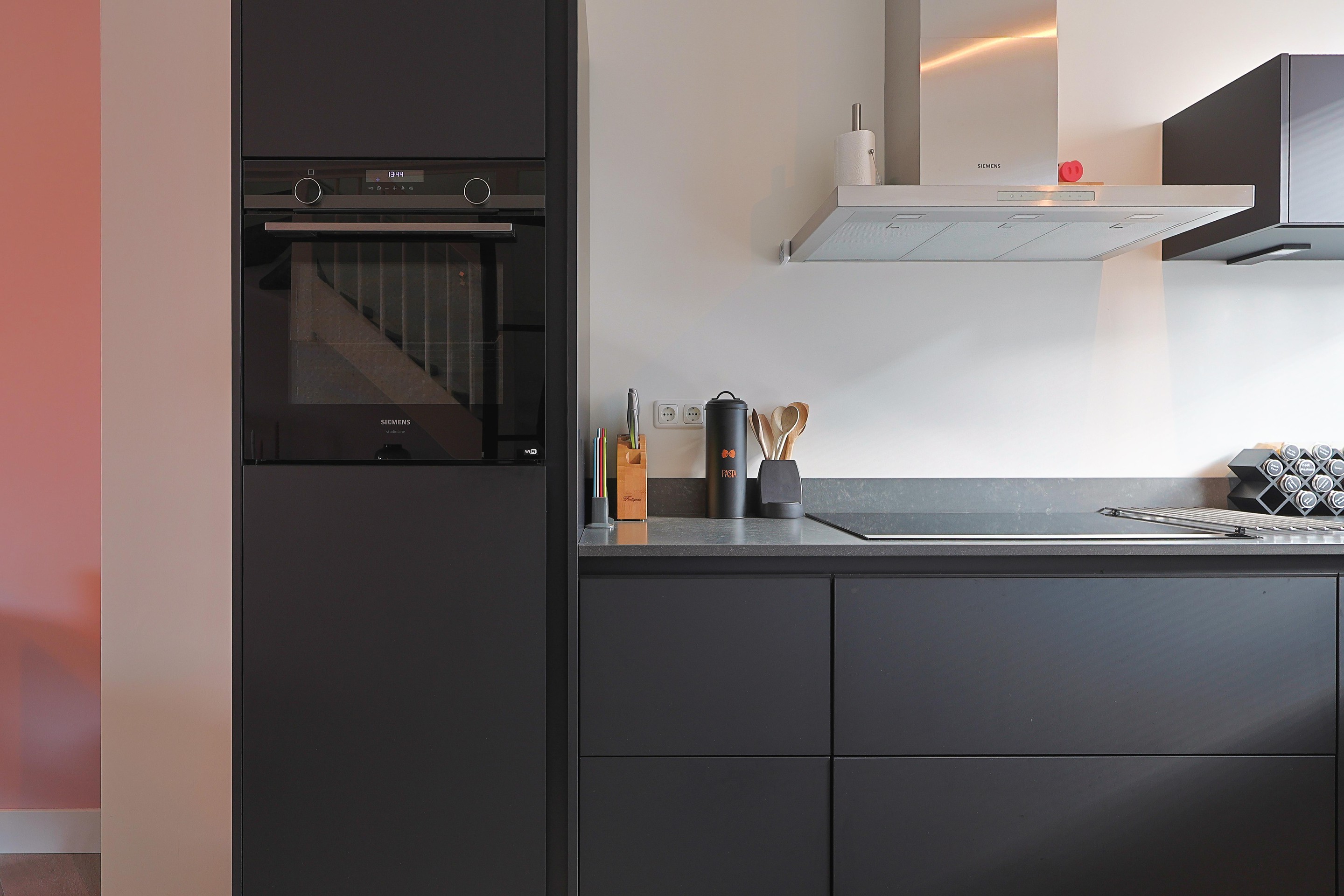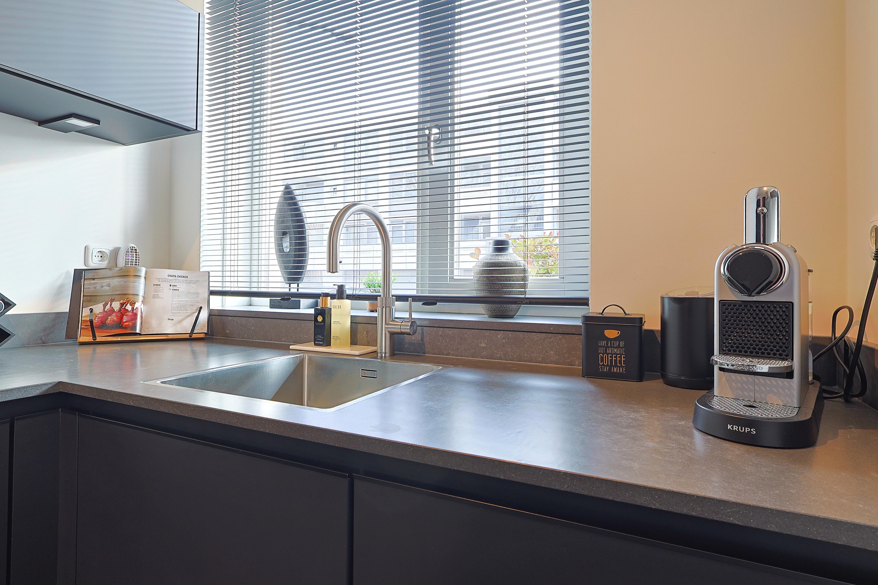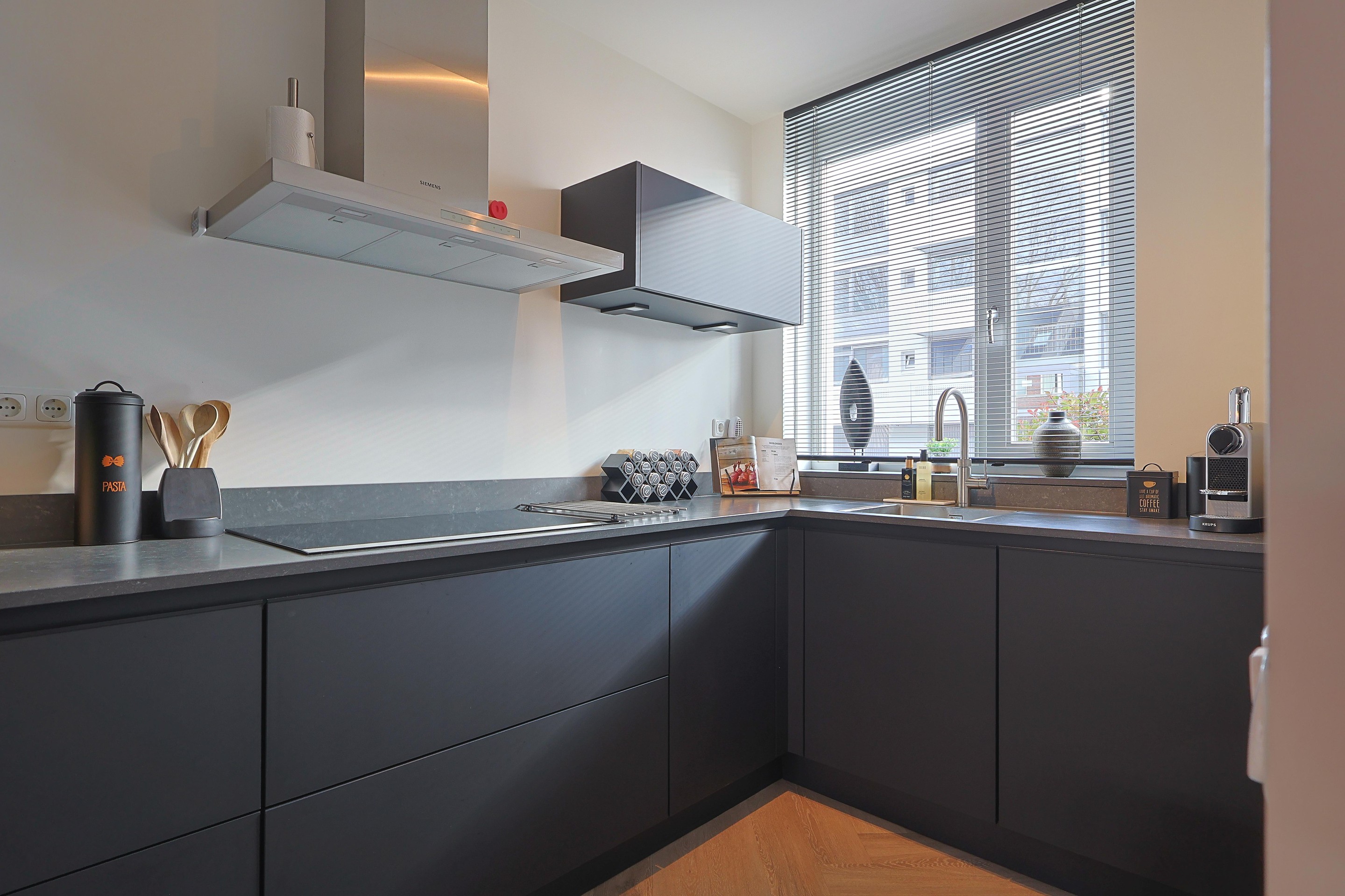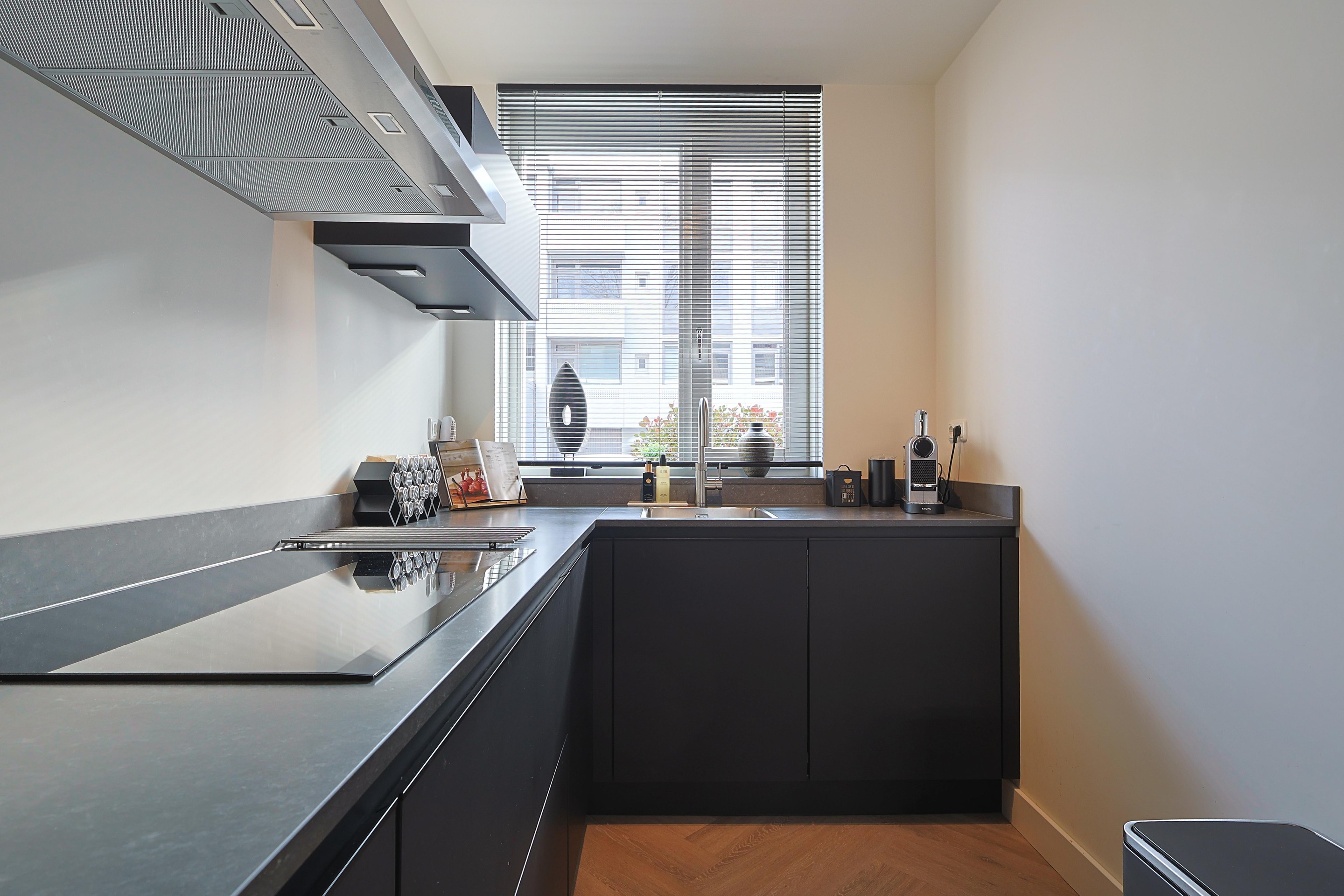 De luxe keuken met meubel in hoekopstelling is gepositioneerd aan de straatzijde en is voorzien van alle apparatuur inclusief een Quooker.