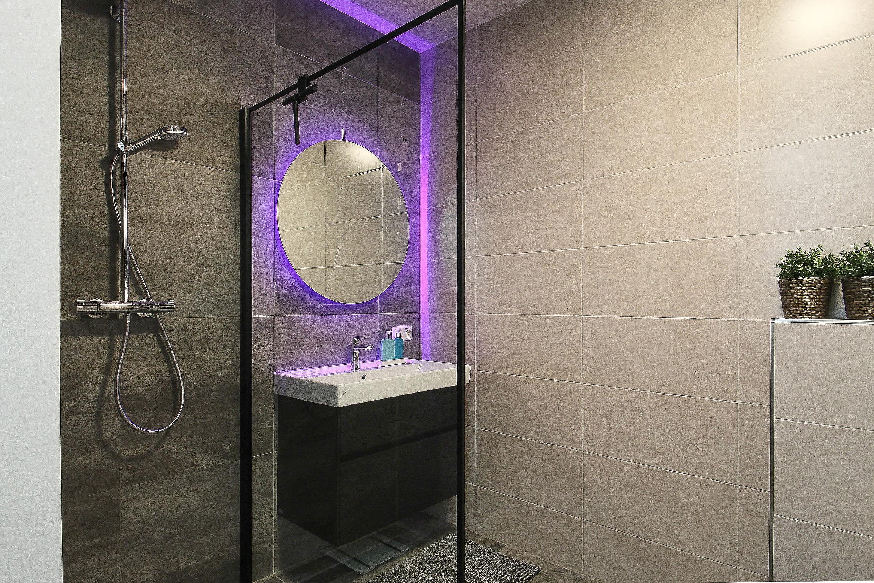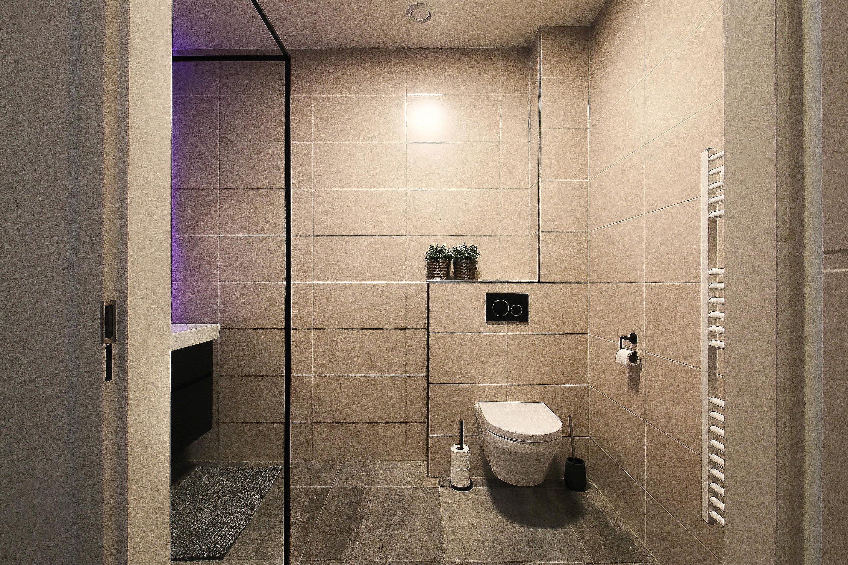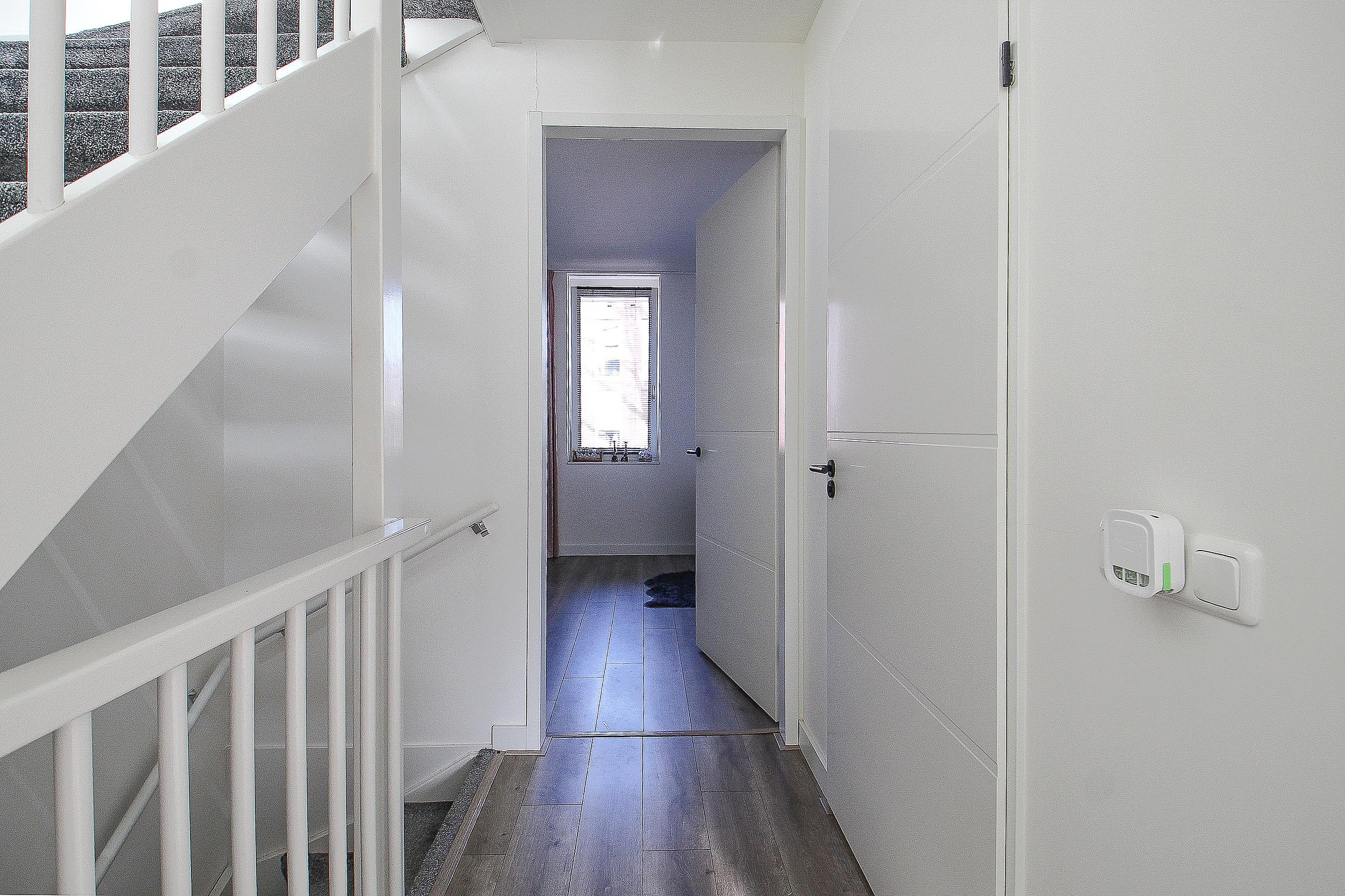 Eerste verdieping Overloop, drie slaapkamers en een moderne badkamer met design radiator, hangcloset, wastafel in meubel en comfortabele inloopdouche.