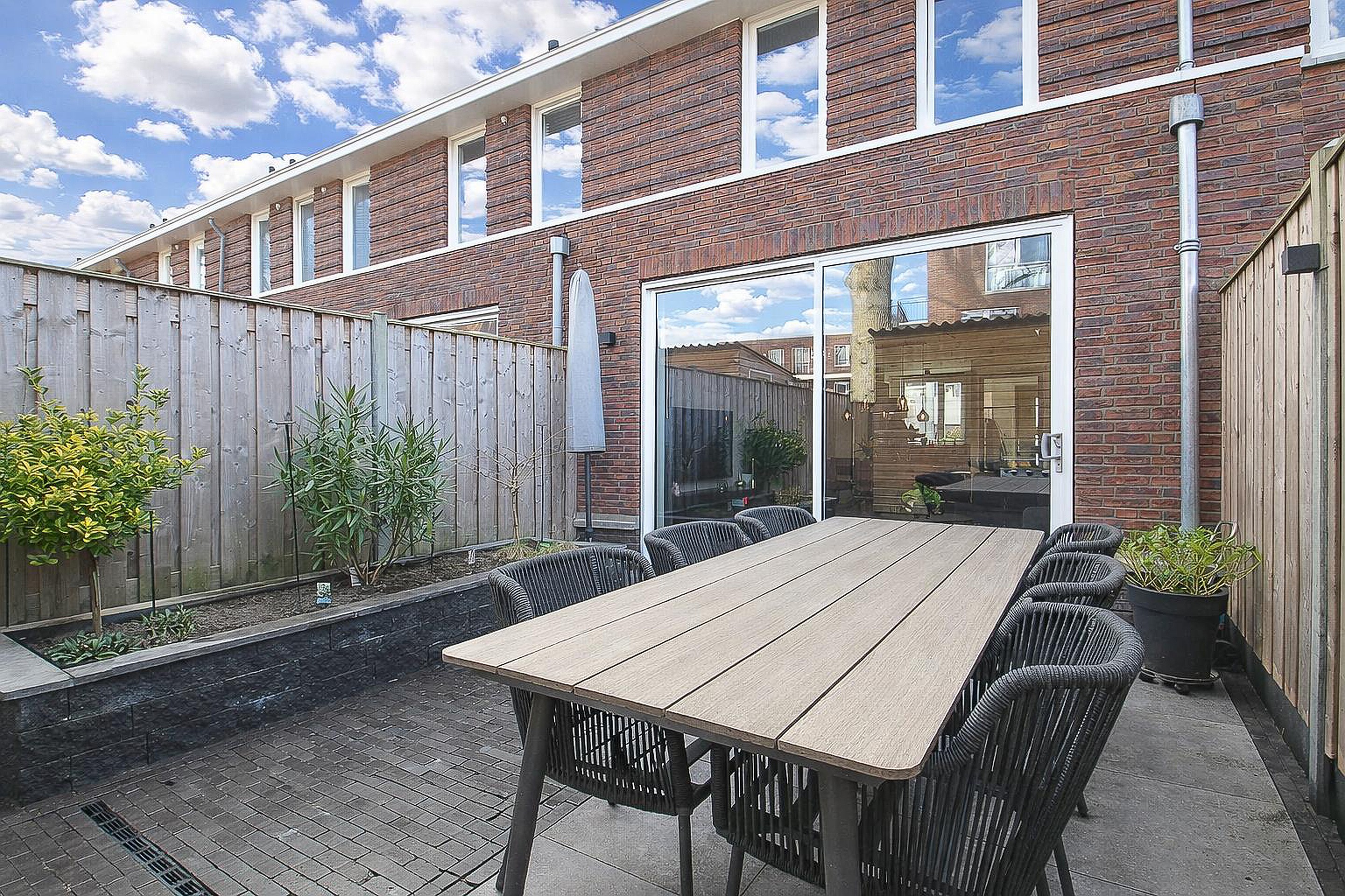 Tuin Leuke voortuin met groen en achtertuin met border, veel terras, achterom en de houten schuur.