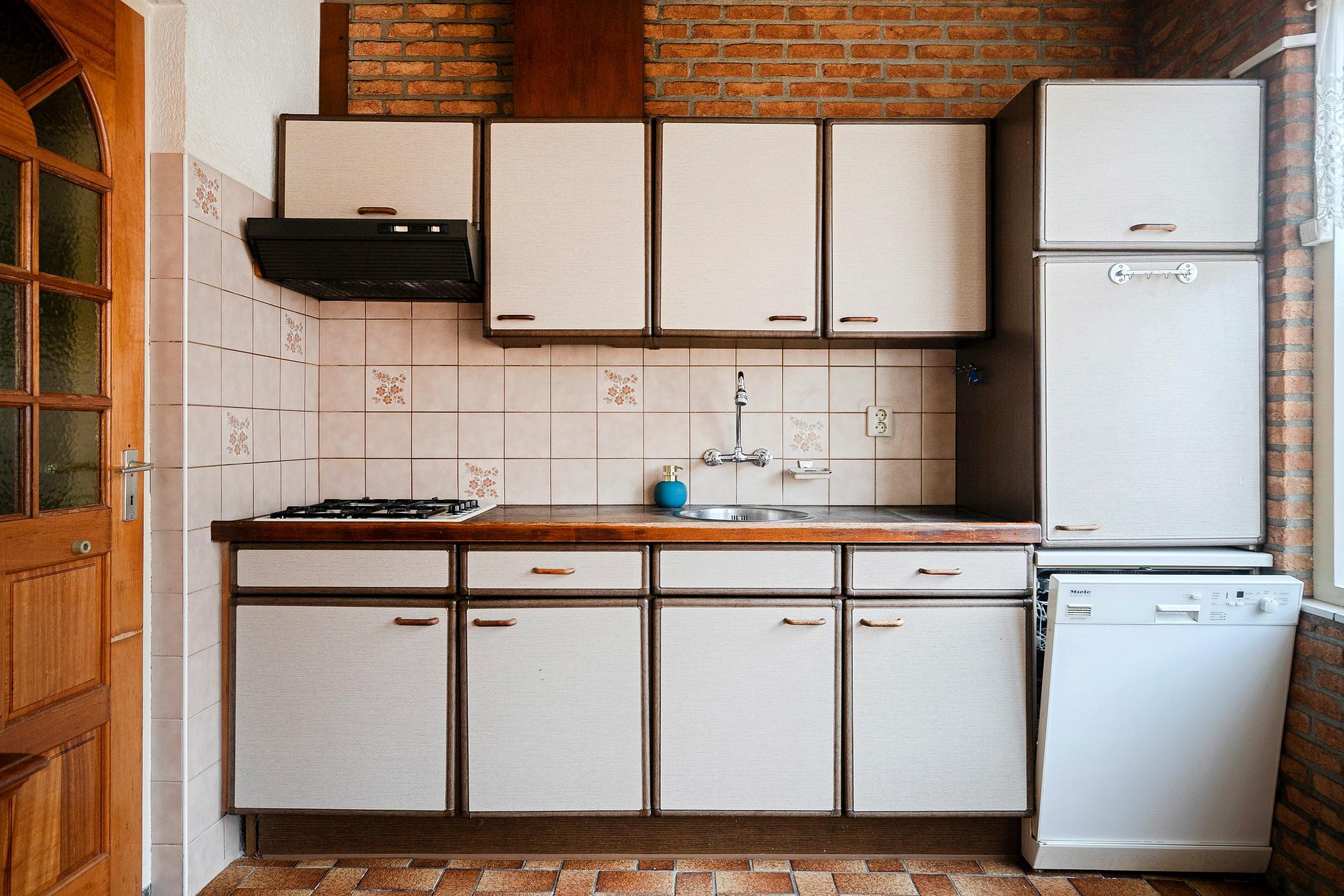 De woonkeuken bevindt zich in de uitbouw. De keukenopstelling is eenvoudig, maar de ruimte biedt volop mogelijkheden voor modernisering. Denk bijvoorbeeld aan het plaatsen van een schuifpui naar de tuin voor een heerlijk binnen-buitengevoel. Wie de muur tussen de woonkamer en keuken verwijdert, creëert bovendien een prachtige open leefruimte met veel licht en verbinding.