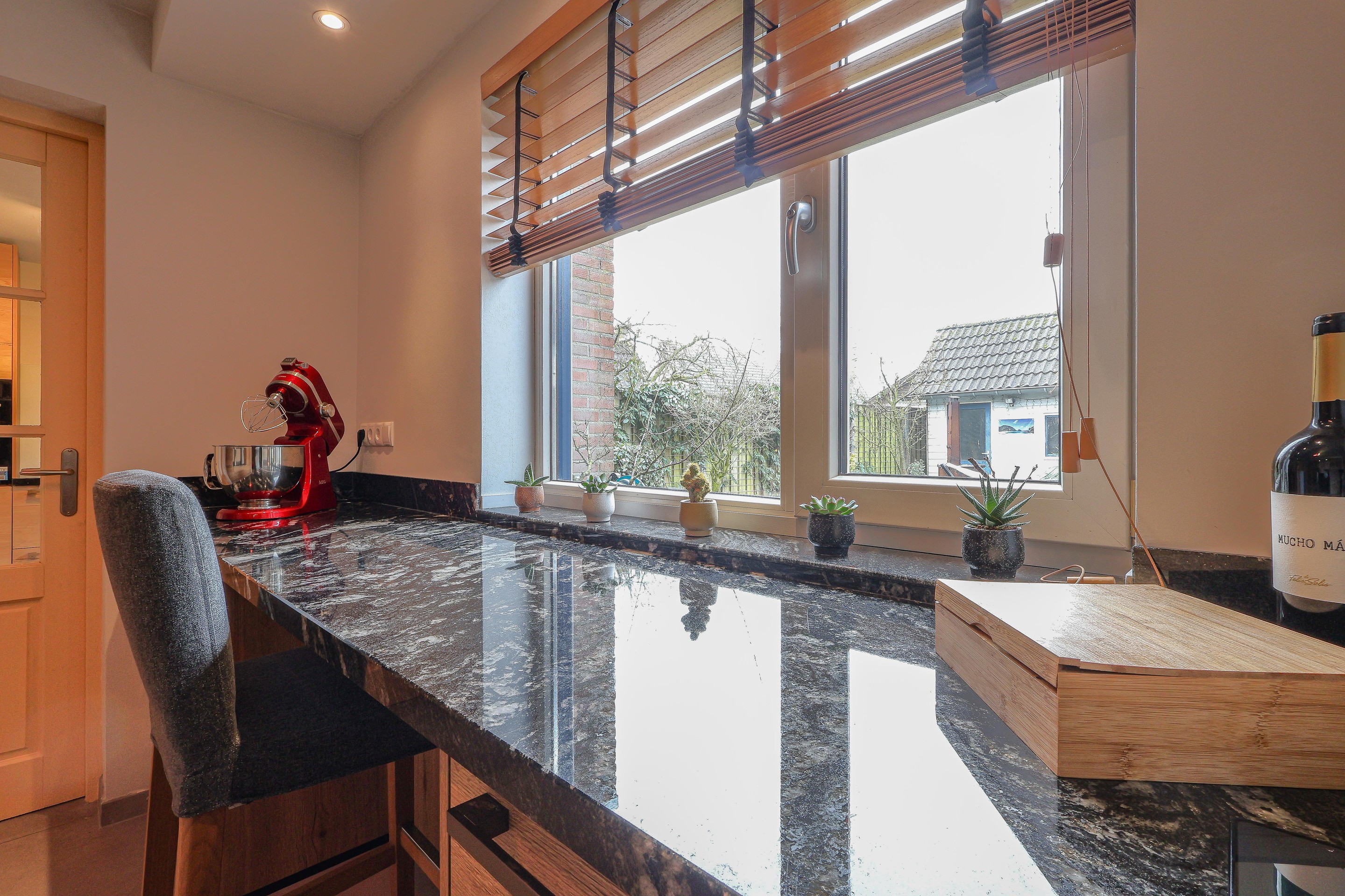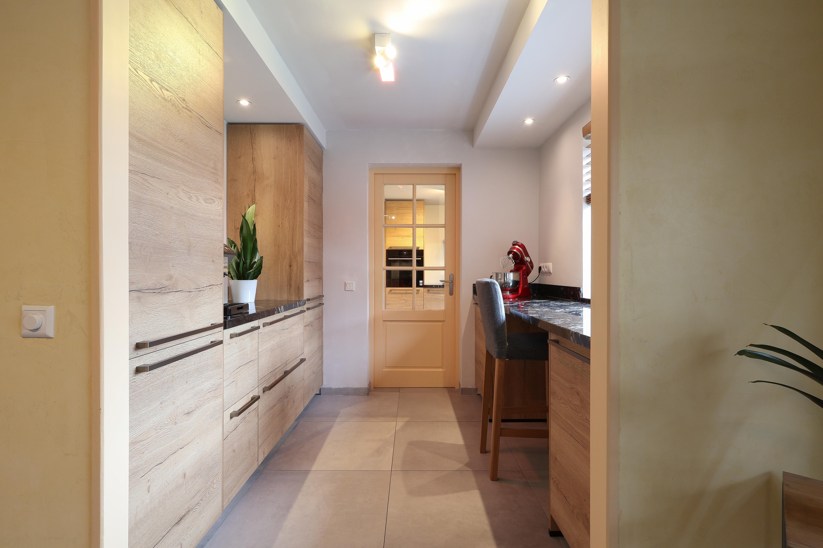 In dit deel van de keuken de achterom en deur naar de ruime inpandige garage met witgoedaansluitingen en sectionaal garagedeur.