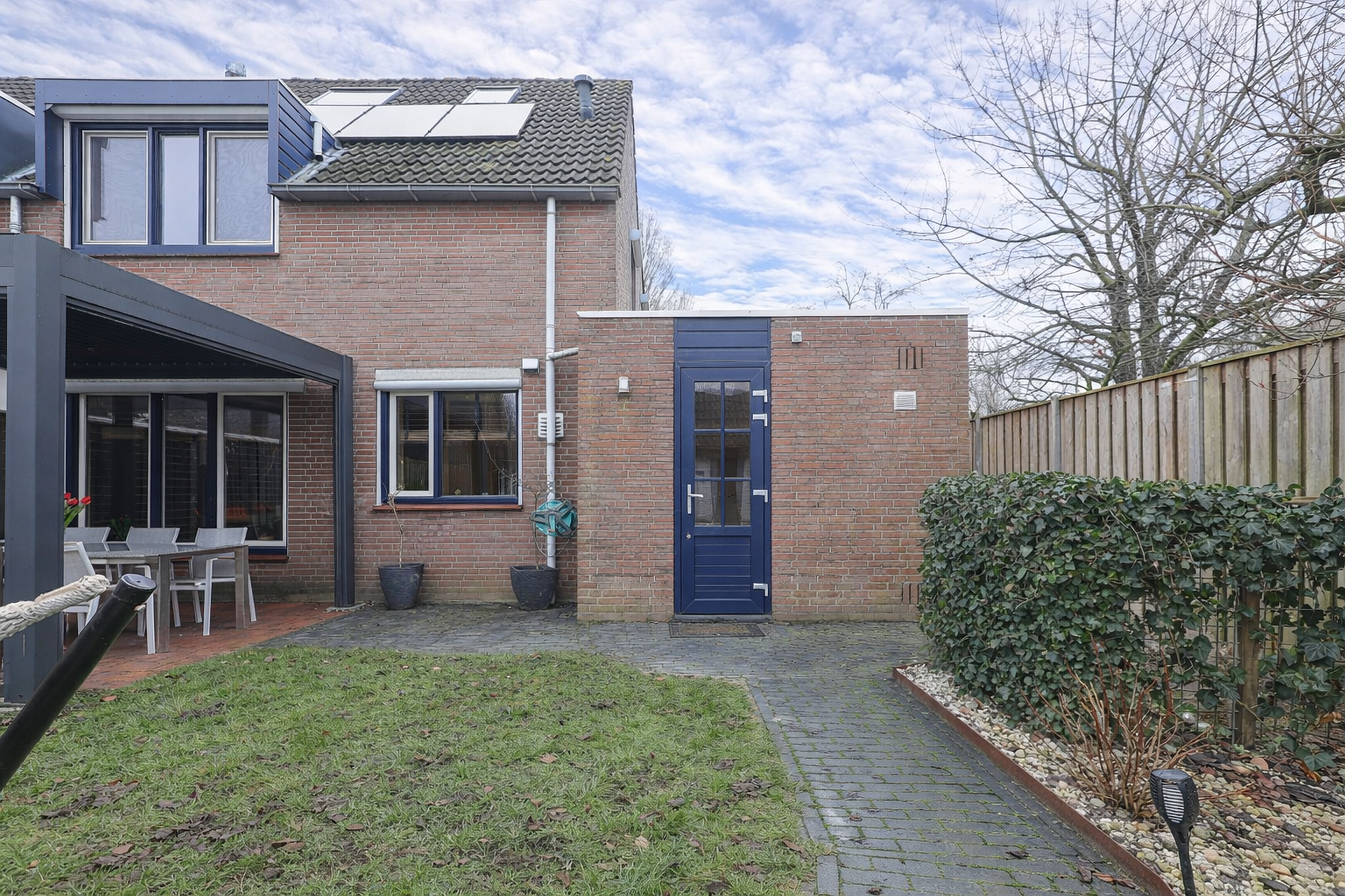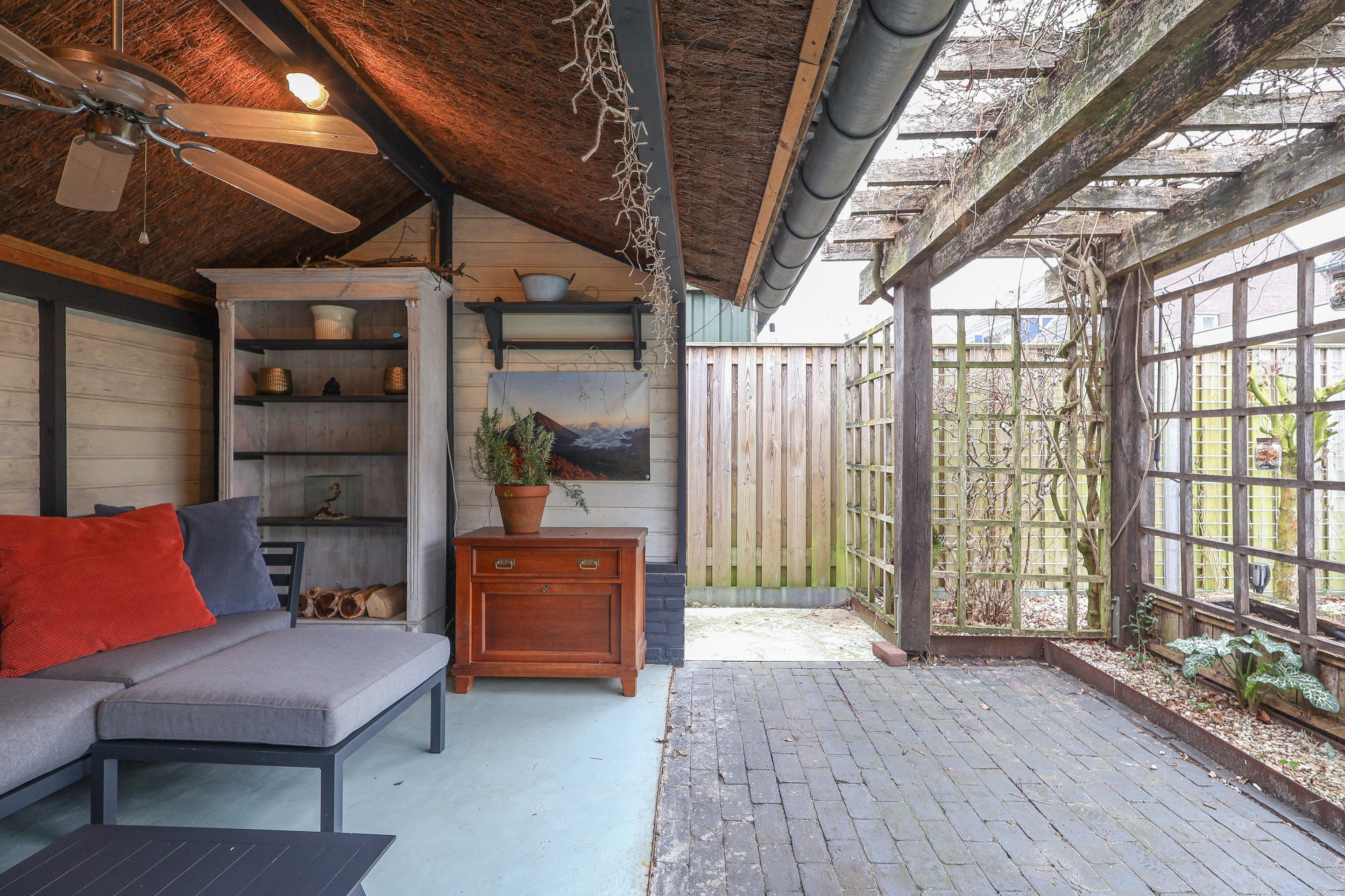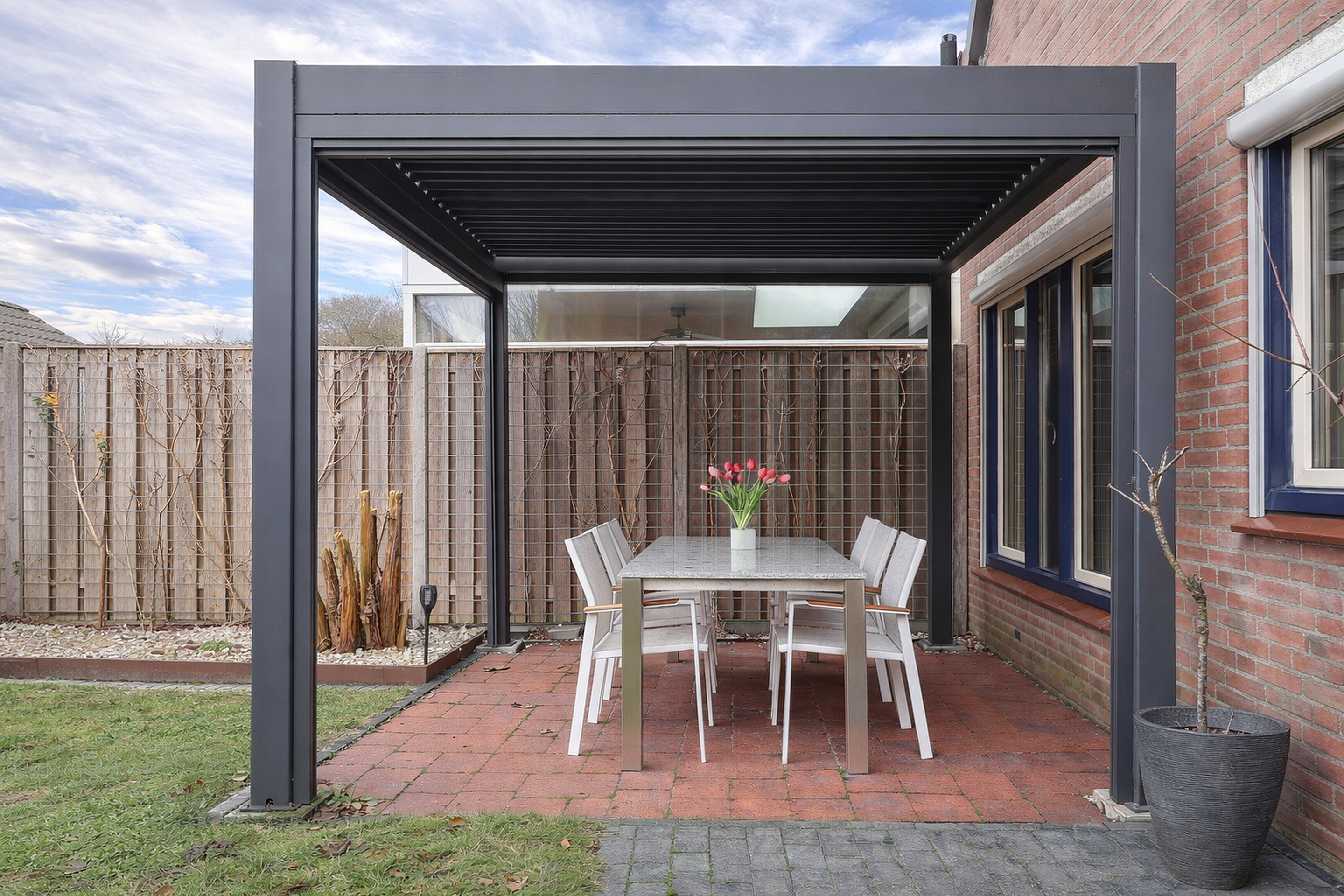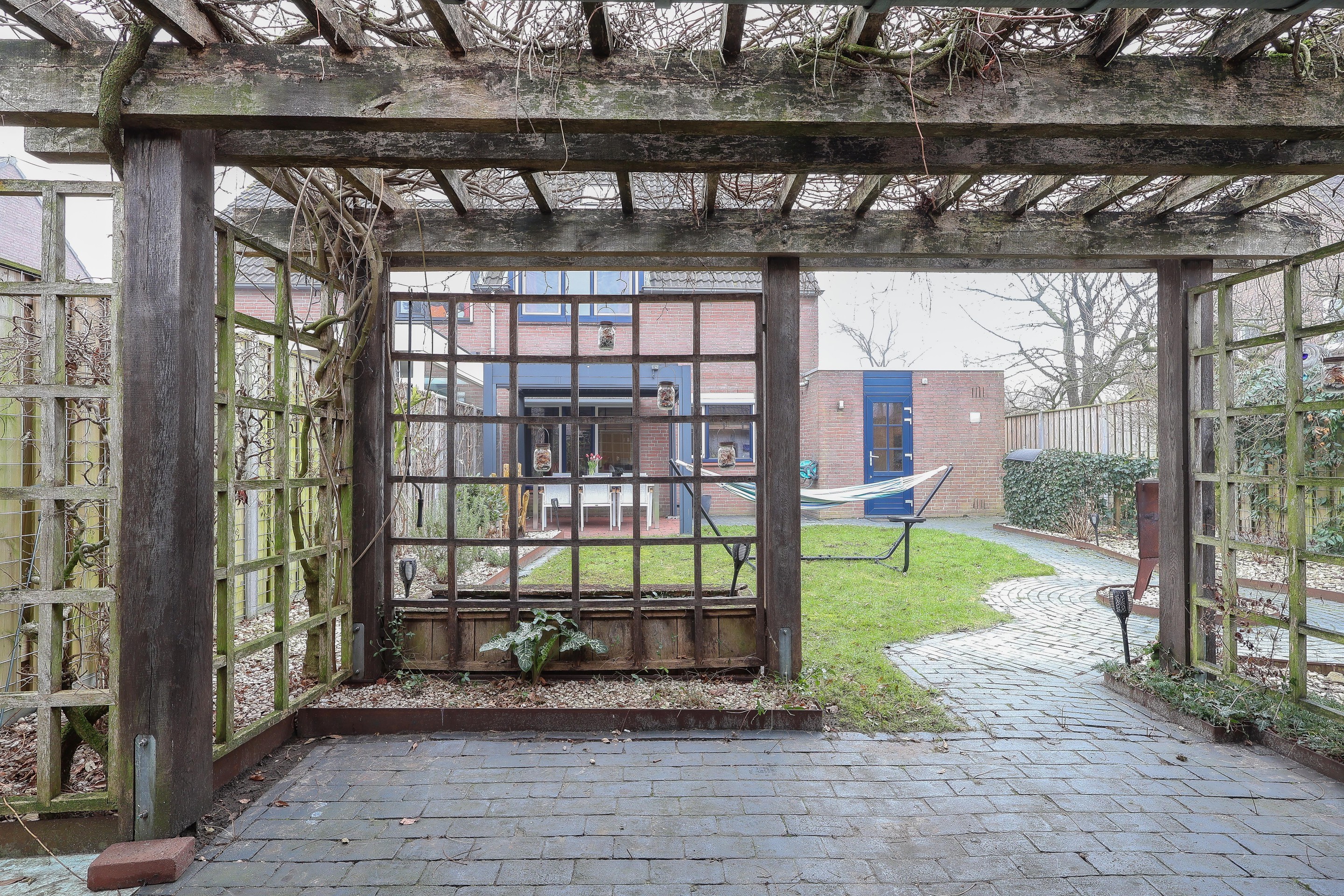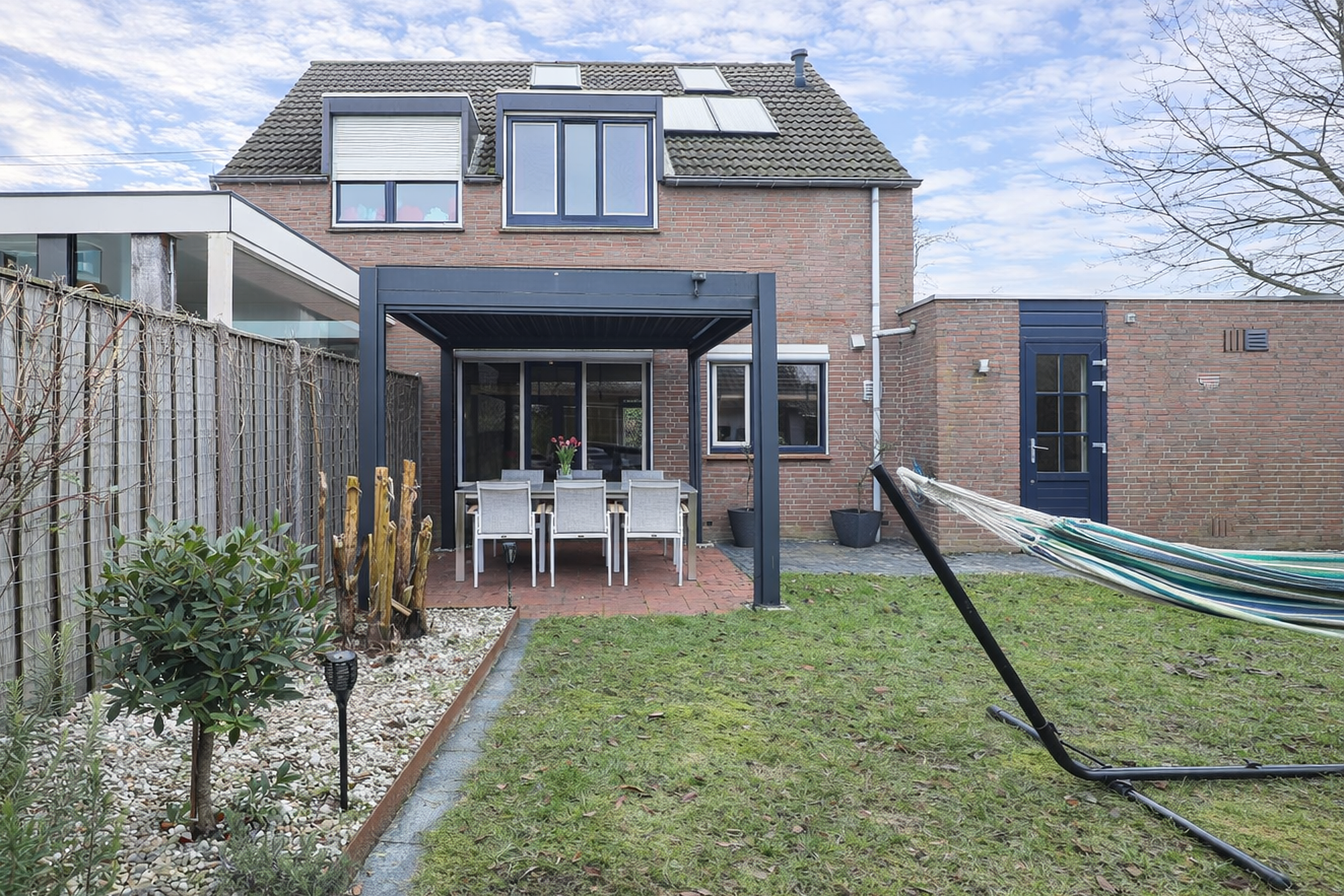 Verzorgde voortuin met een brede oprit en achterom met poort naar de fraai aangelegde achtertuin. Aluminium overkapping met screens direct aan de woning, een schuur met zolder en aangrenzend overdekt terras met prieel.