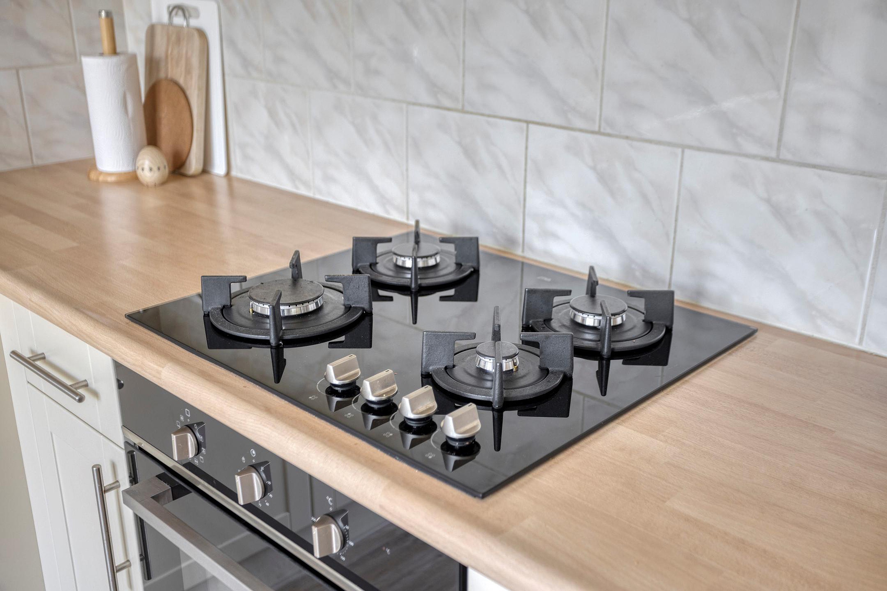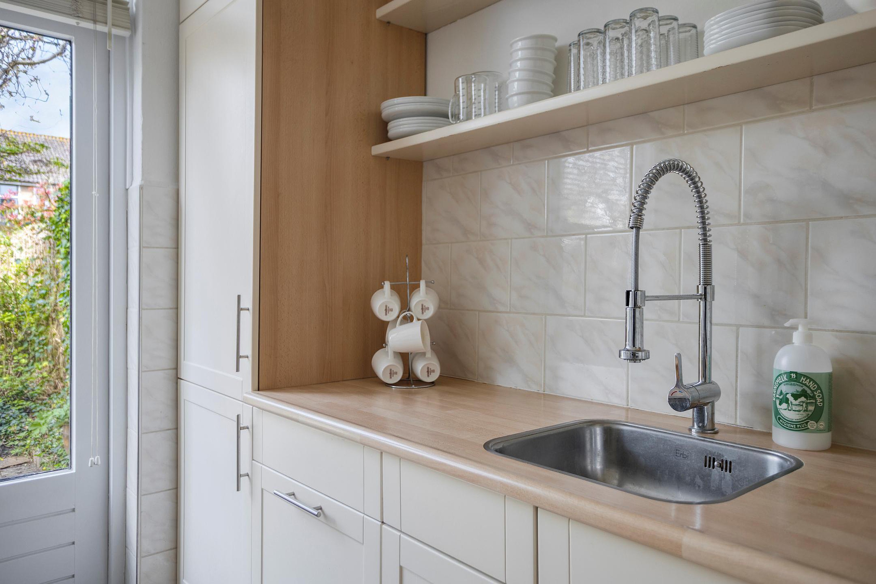 Aan de achterzijde bevindt zich de dichte keuken. Deze is functioneel ingericht en voorzien van diverse inbouwapparatuur, waaronder een vaatwasser, koelkast, vriezer, magnetron, oven en een gaskookplaat.