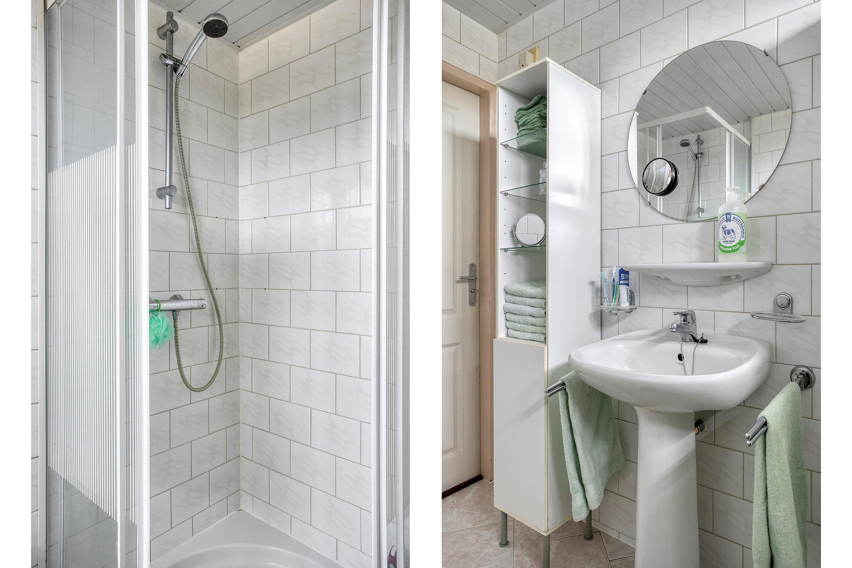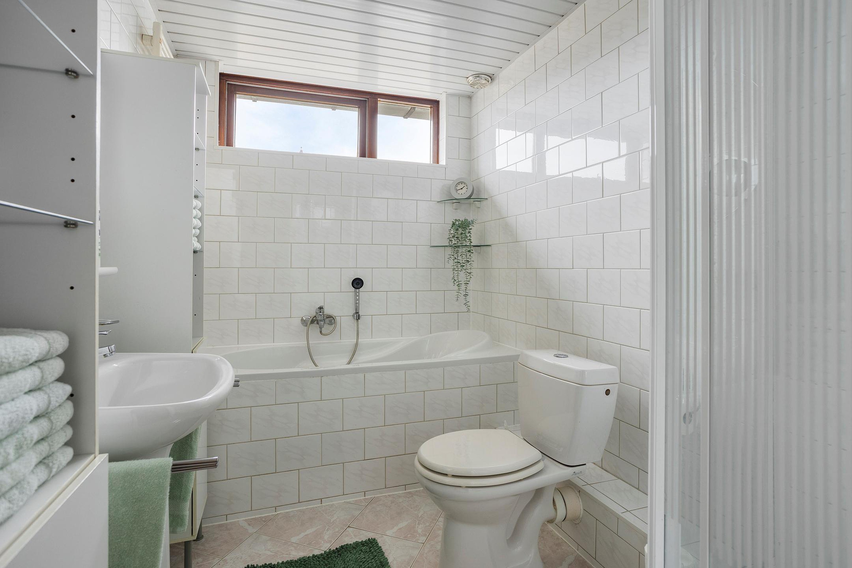 De badkamer is voorzien van een ligbad, douche, toilet en wastafel.