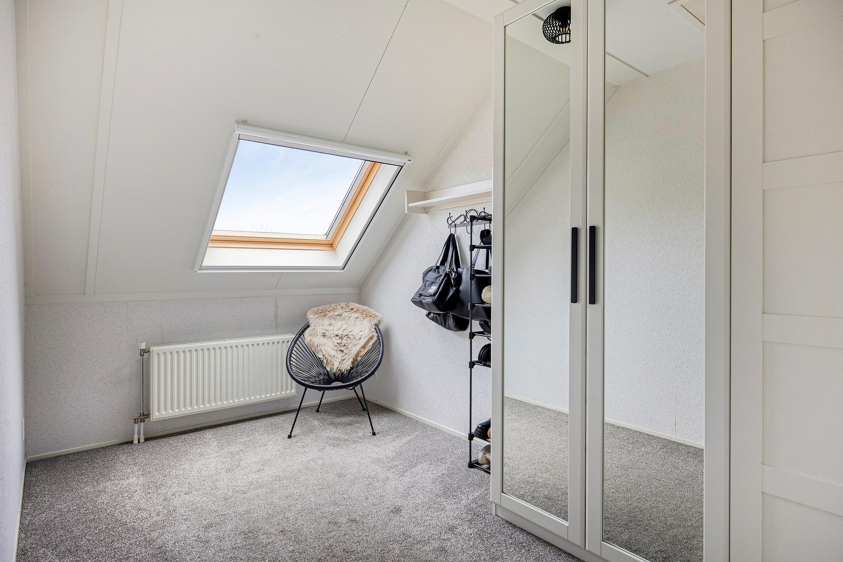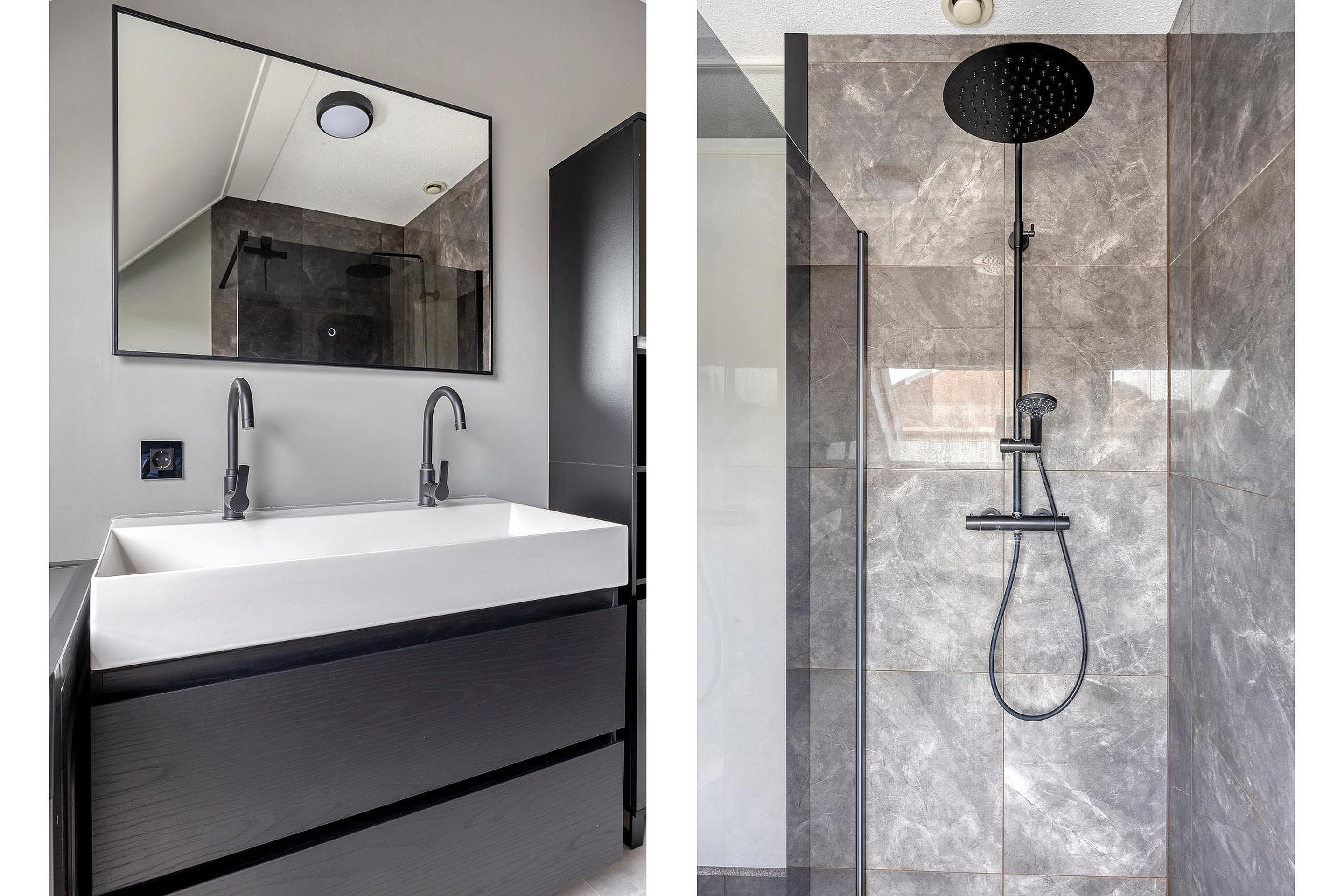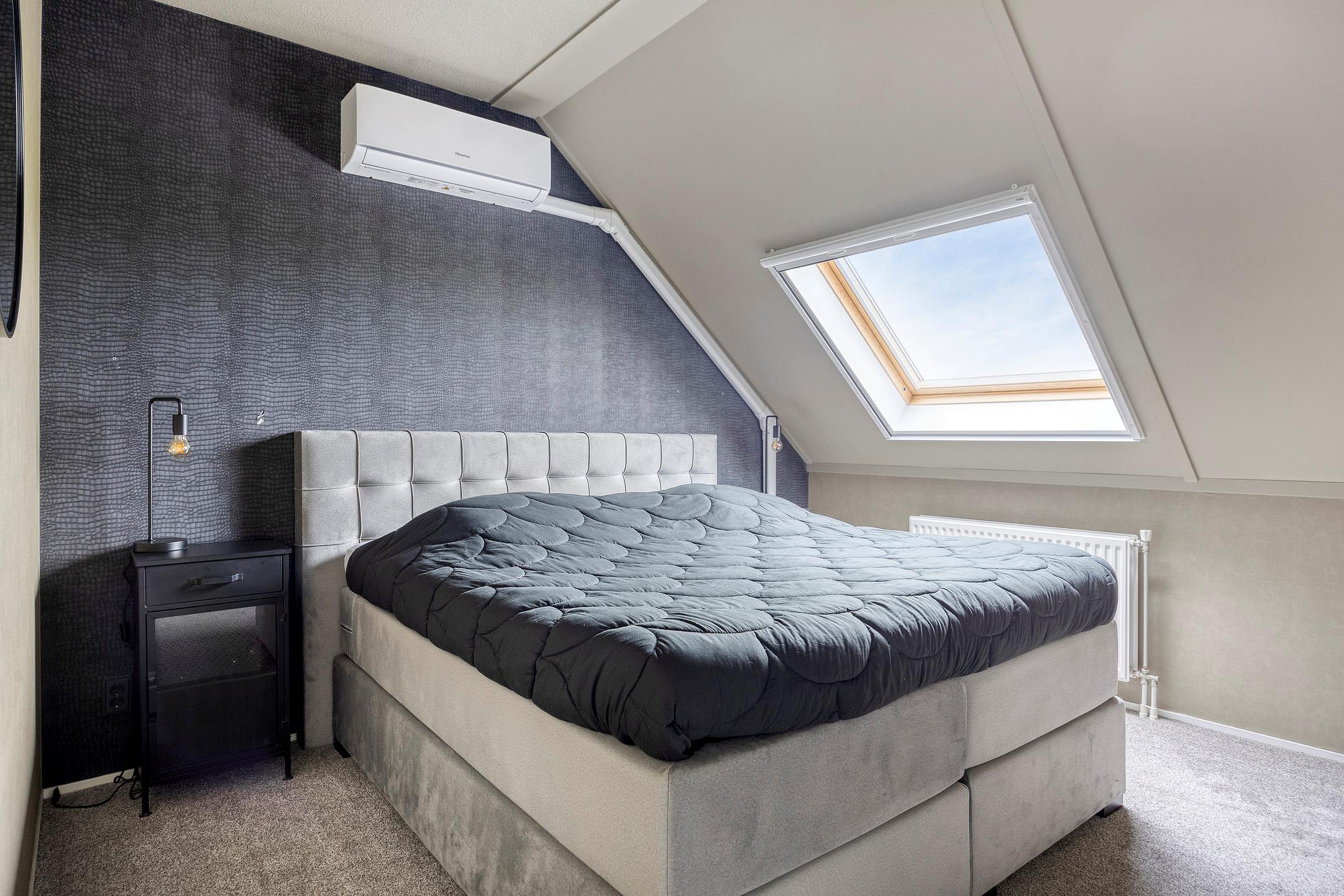 Via de vaste trap vanuit de hal komt u op de overloop op de 1e verdieping. Aangrenzend vindt u hier 2 slaapkamers en de badkamer. Beide slaapkamers zijn royaal van formaat en hebben een fijne lichtinval door de grote ramen. De kamers zijn netjes afgewerkt met strakke wanden en plafonds en voorzien van heerlijk zachte vloerbedekking. De grootste slaapkamer is tevens voorzien van een praktische inbouwkast en een airco-systeem welke de gehele verdieping koel houdt in de zomermaanden. Vanuit de andere slaapkamer is er via een luik met vlizotrap toegang naar de ruime bergzolder waar u tevens de cv-opstelling vindt. De royale badkamer uit 2021 is luxe afgewerkt in een moderne stijl met strakke wanden en plafonds en voorzien van mooie wand- en vloertegels. U heeft hier beschikking over een grote doucheruimte met glazen wand, een dubbele wastafel met bergkast en spiegel, een hangend toilet, een groot kantelraam met zonwering, een radiator en tevens vindt u hier de aansluitingen voor het witgoed.