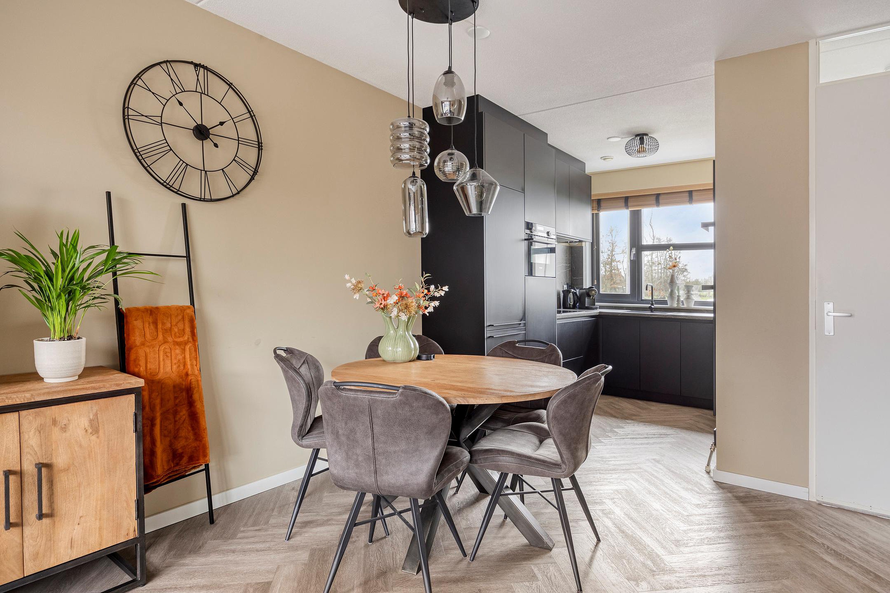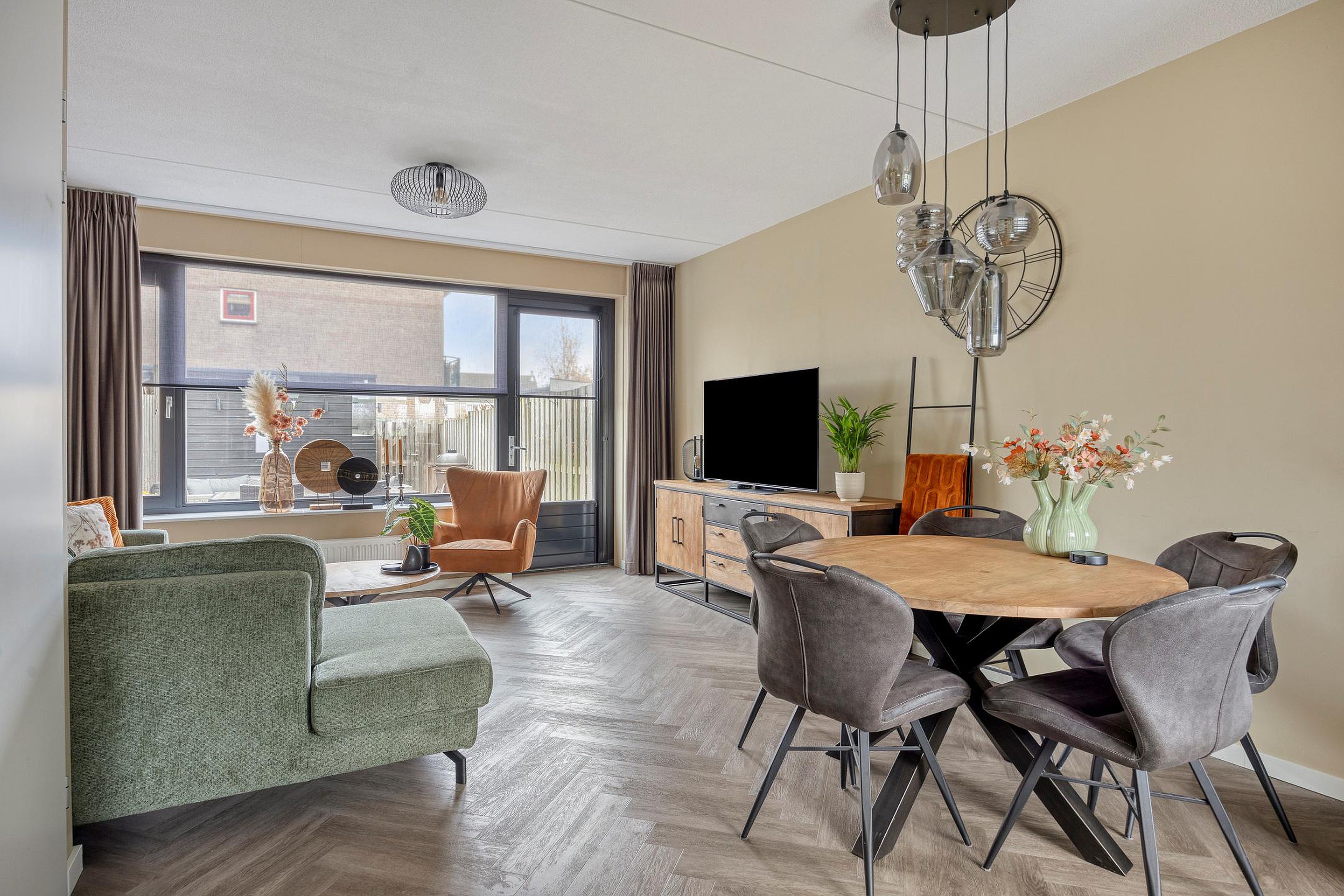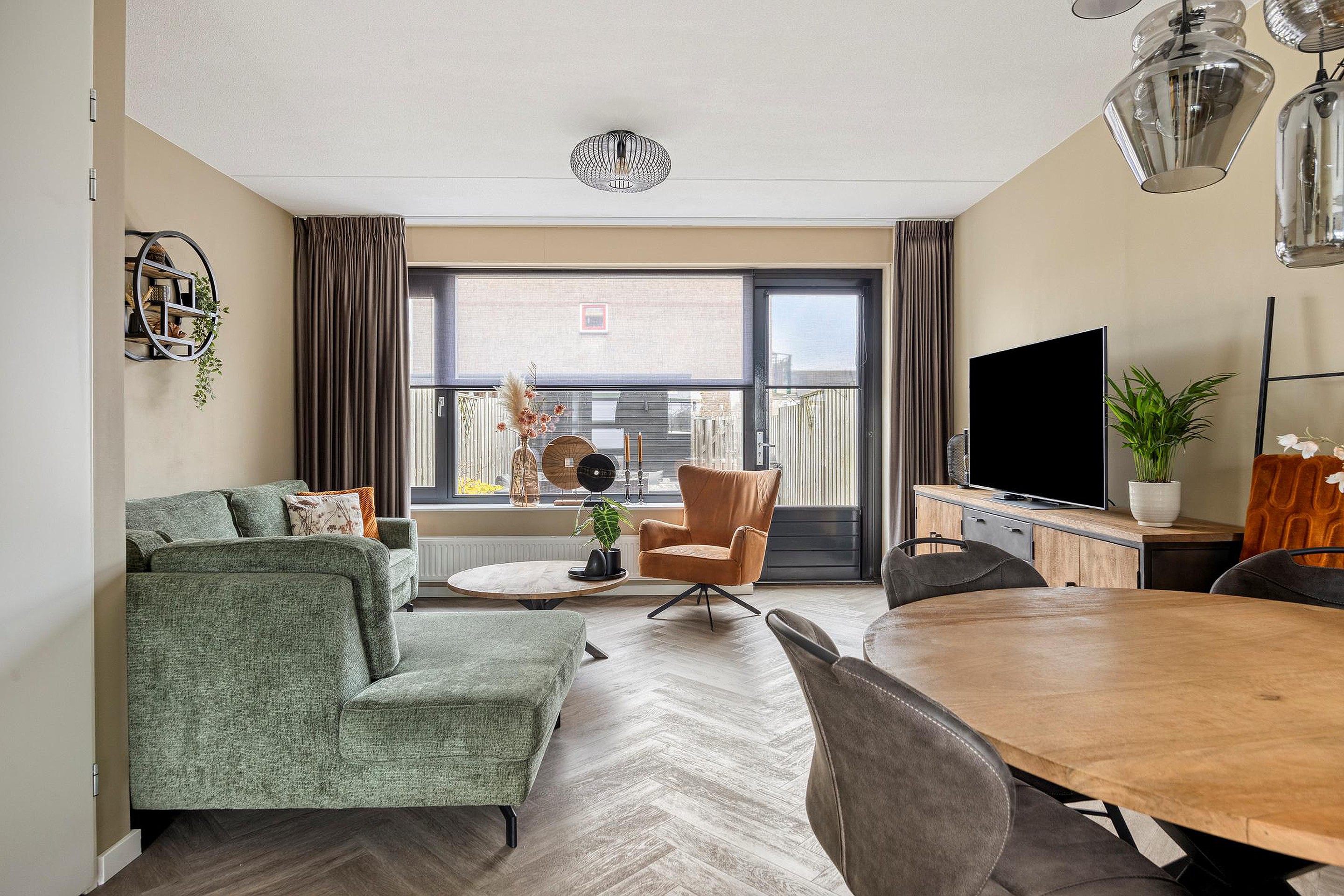 De ruime woonkamer is heerlijk licht door de grote ramen aan weerszijden van de woning en de glazen deur naar de achtertuin. De living is in 2021 nog volledig gemoderniseerd en voorzien van strakke wanden en plafonds en een mooie PVC-vloer. Er is ruim plaats voor een grote lounge aan de achterzijde waar u zicht heeft op de achtertuin. Aan de voorzijde vindt u de strakke keuken uit 2021. Deze is uitgevoerd in een moderne robuuste stijl met luxe keukenapparatuur van Siemens, een mooi werkblad en veel werk- en bergruimte. Voor nog meer bergruimte kunt u terecht in de grote kast onder de trap. Naast de keuken is er plaats voor een grote tafel om gezellig met familie en vrienden te kunnen eten.