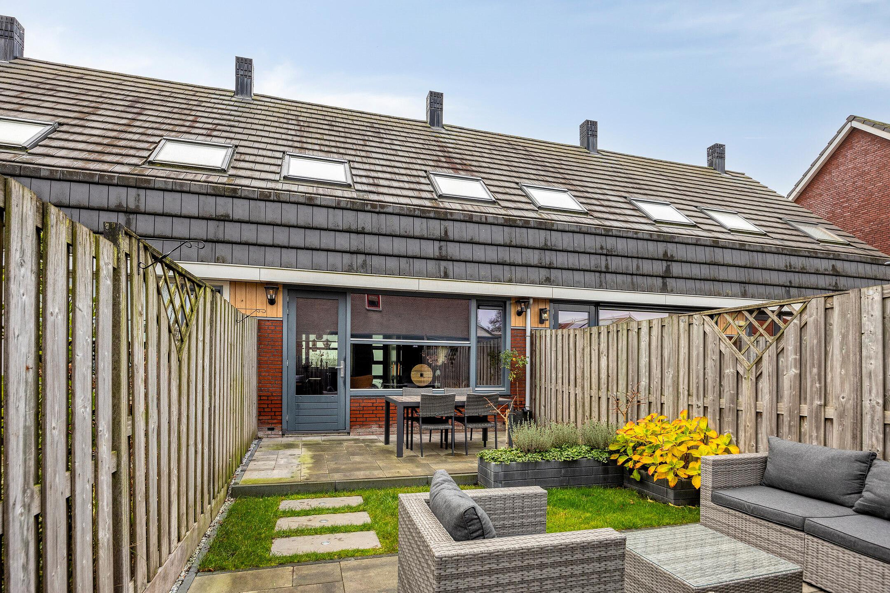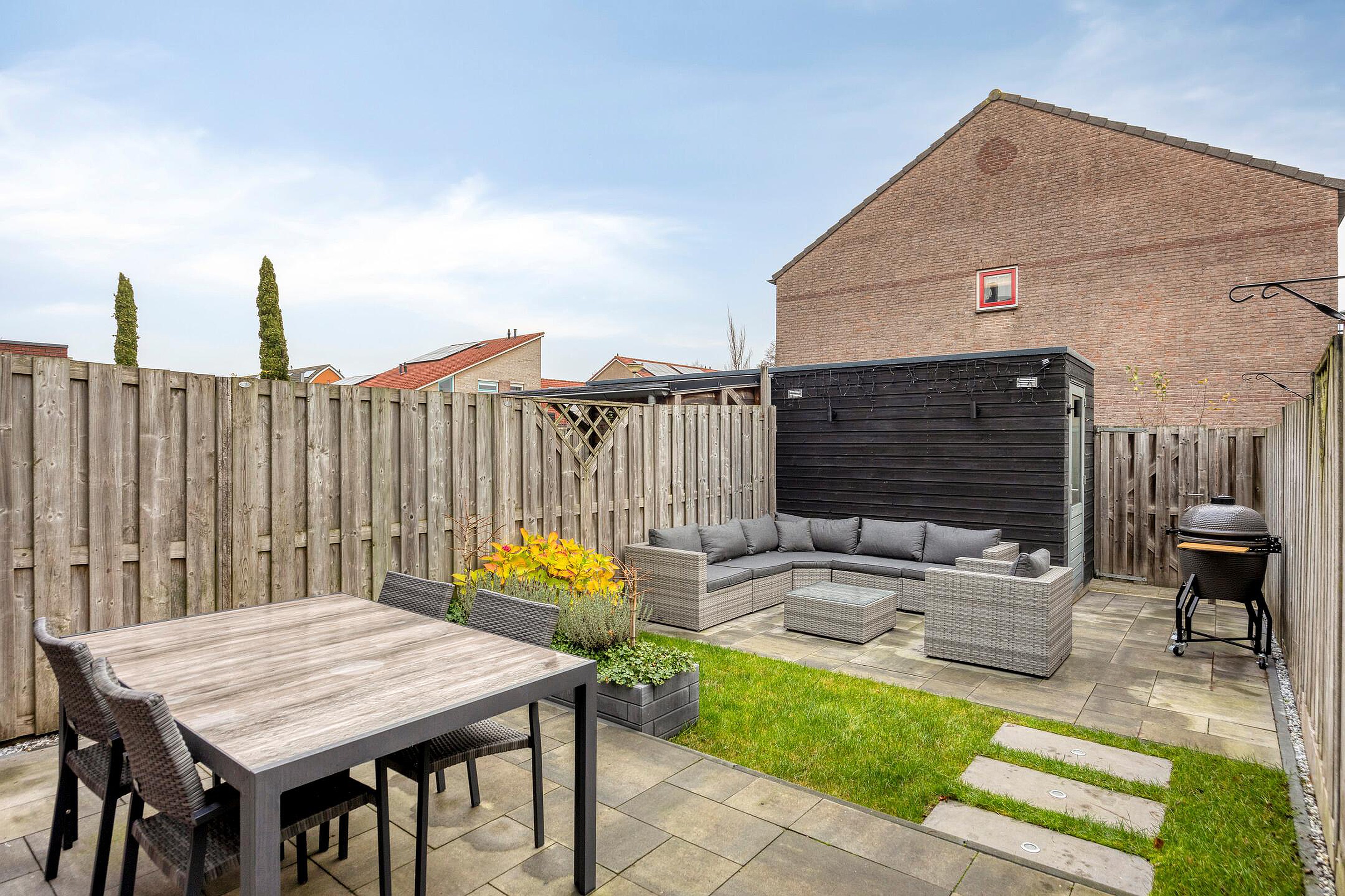 De fijne achtertuin is te bereiken vanuit de woonkamer of via de brede poort achter. De tuin is gelegen op het Zuidoosten en biedt u de hele dag plaatsen in de zon of juist in de schaduw. De tuin is strak en onderhoudsvriendelijk aangelegd met grote terrassen, een gazonstrook, een vaste plantenborder en robuuste schuttingen welke voor veel privacy zorgen. Achter in de tuin vindt u een ruime berging voor al uw gereedschap, het stallen van de fietsen of het speelgoed van de kinderen.