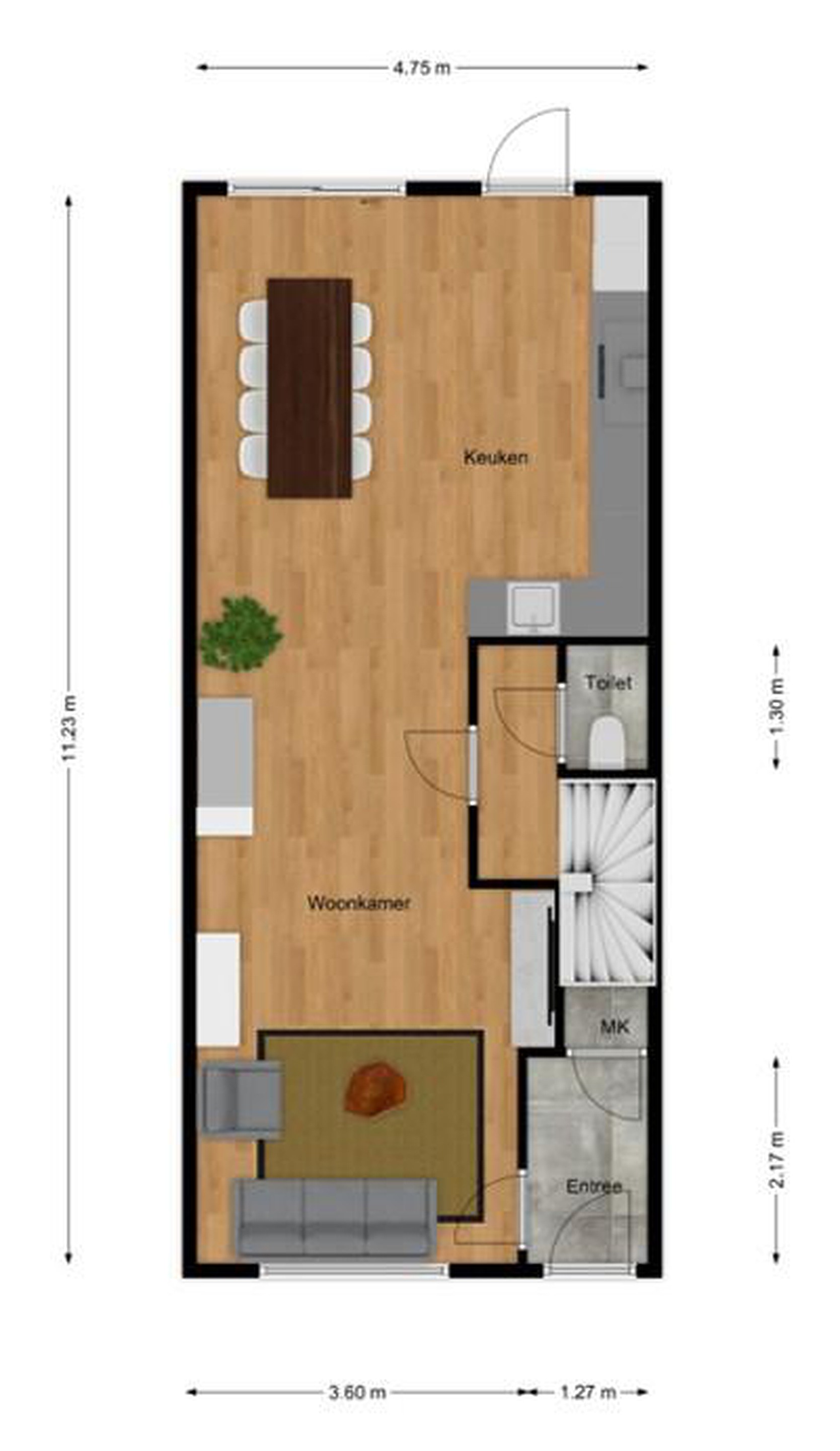 Begane grond Hal-/entree met tegelvloer, garderobeplek, meterkast (10 groepen, aparte kookgroep + 3 aardlekschakelaars), trapkast, middels loopdeur toegang tot de woonkamer;