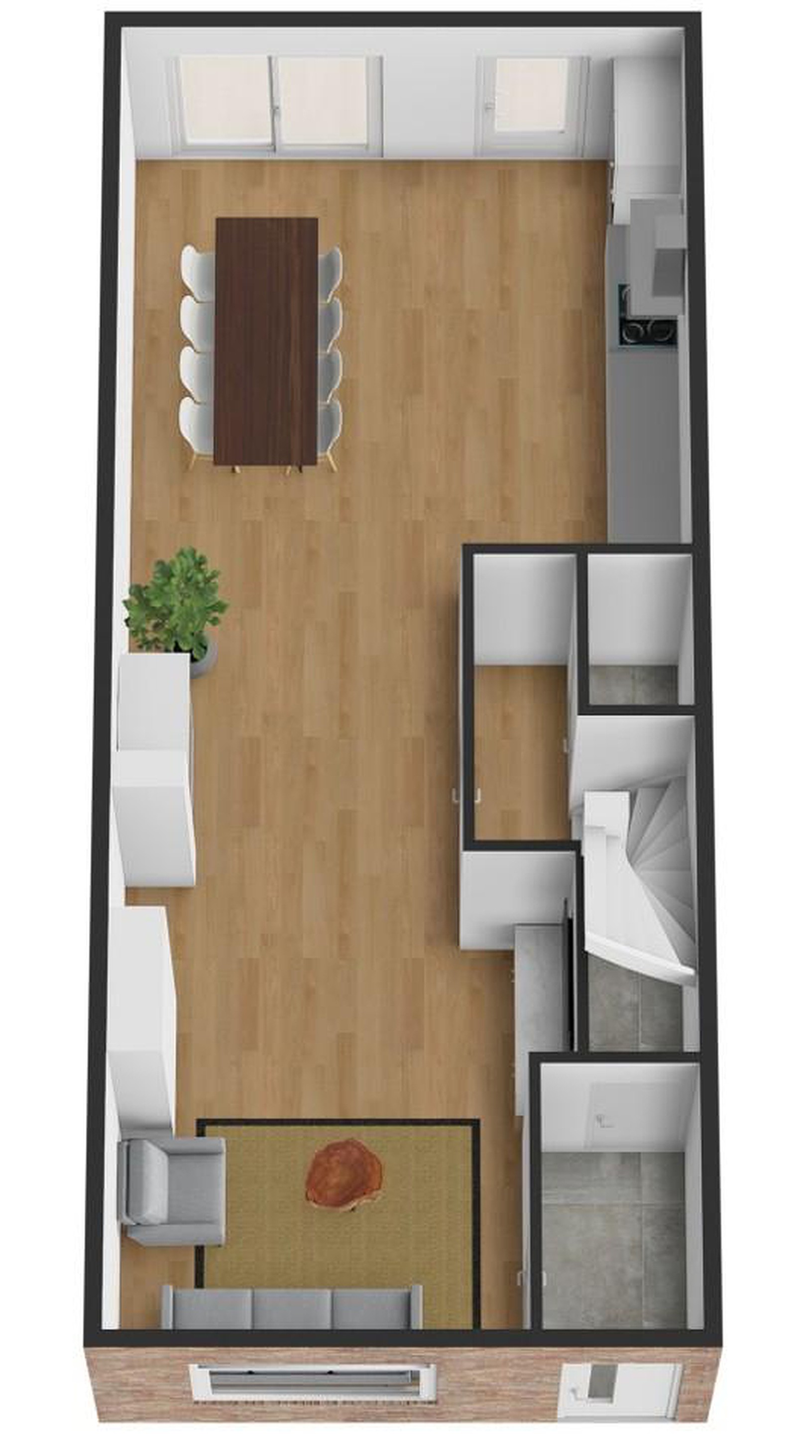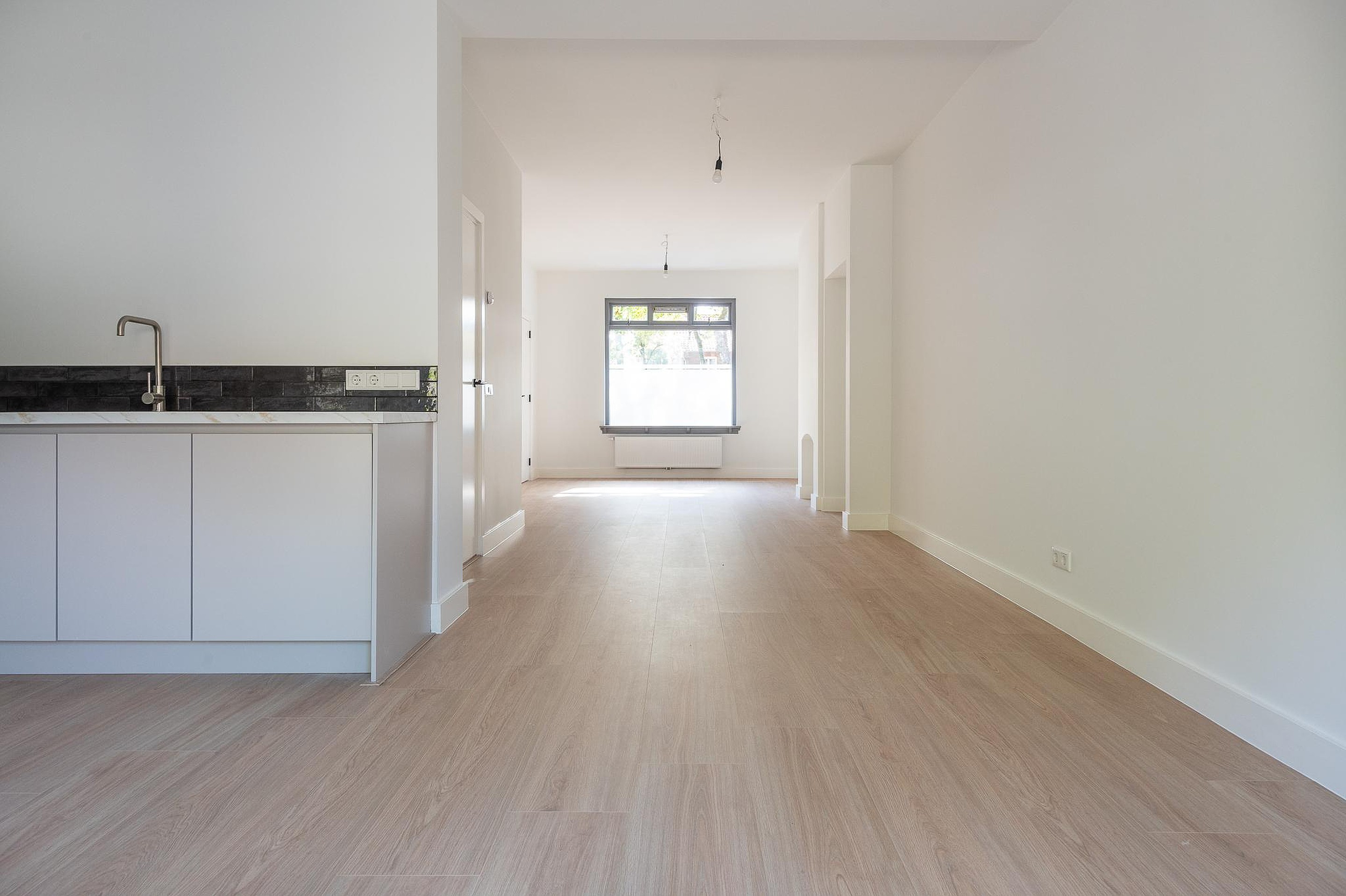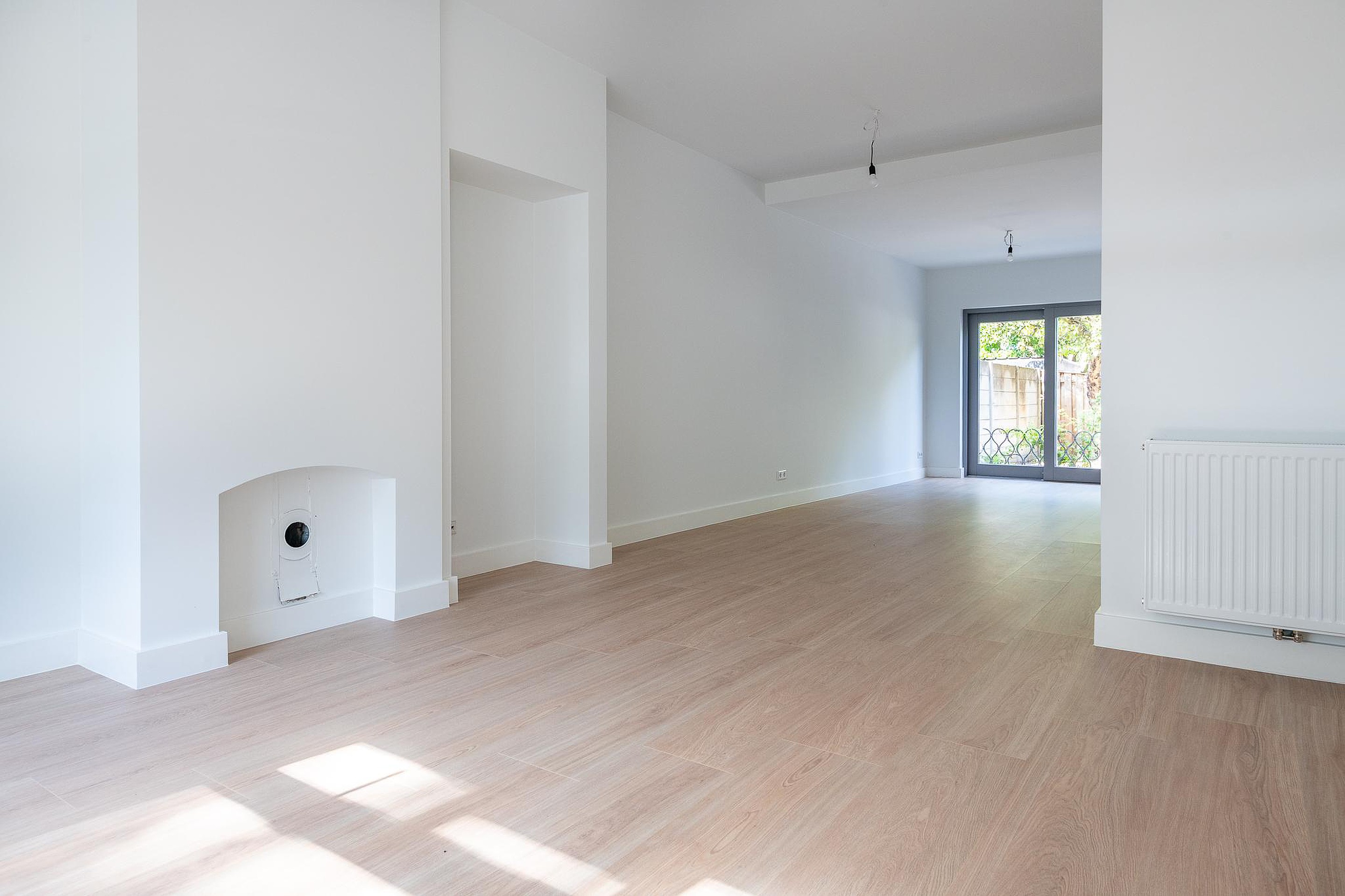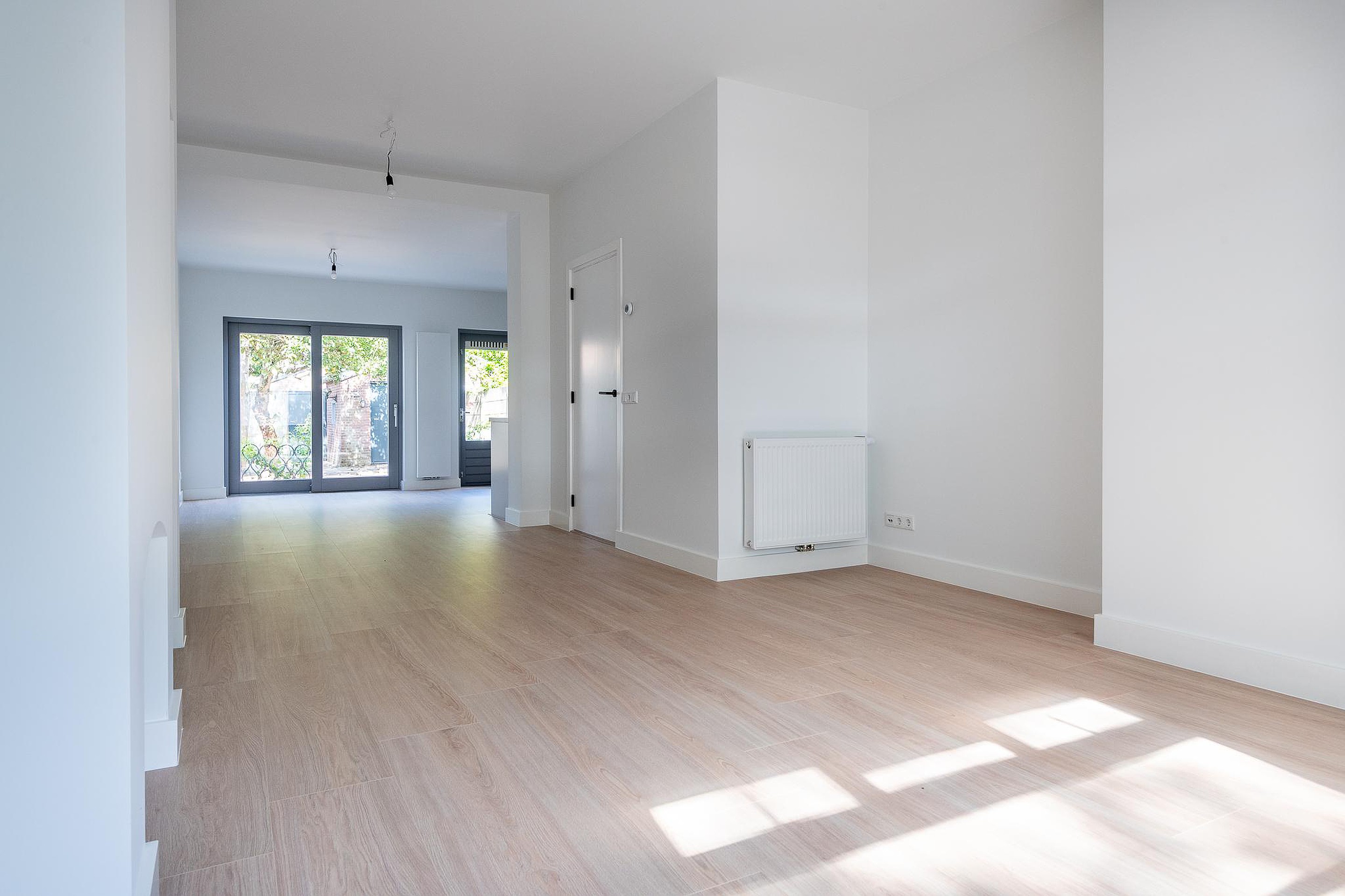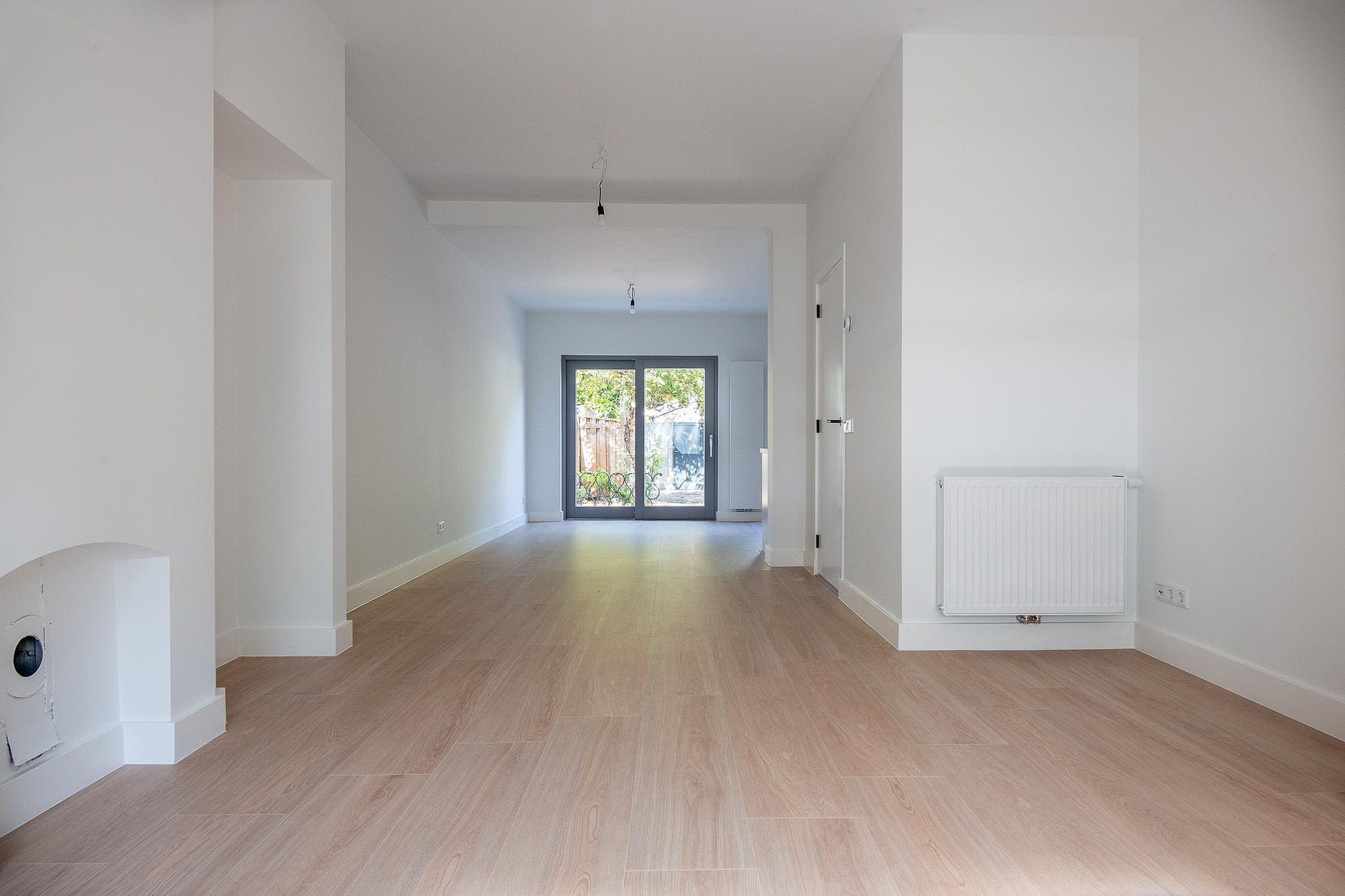 Woonkamer voorzien van laminaatvloer, middels schuifdeuren toegang tot de royale achtertuin, middels loopdeur toegang tot het toilet en trapopgang naar de eerste verdieping;
