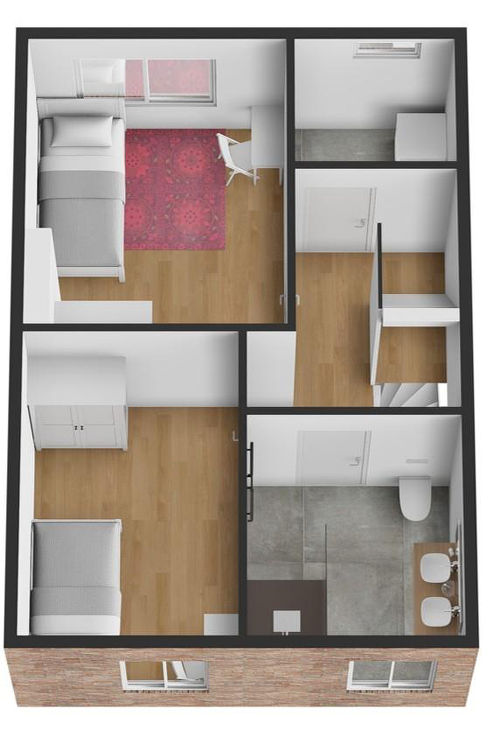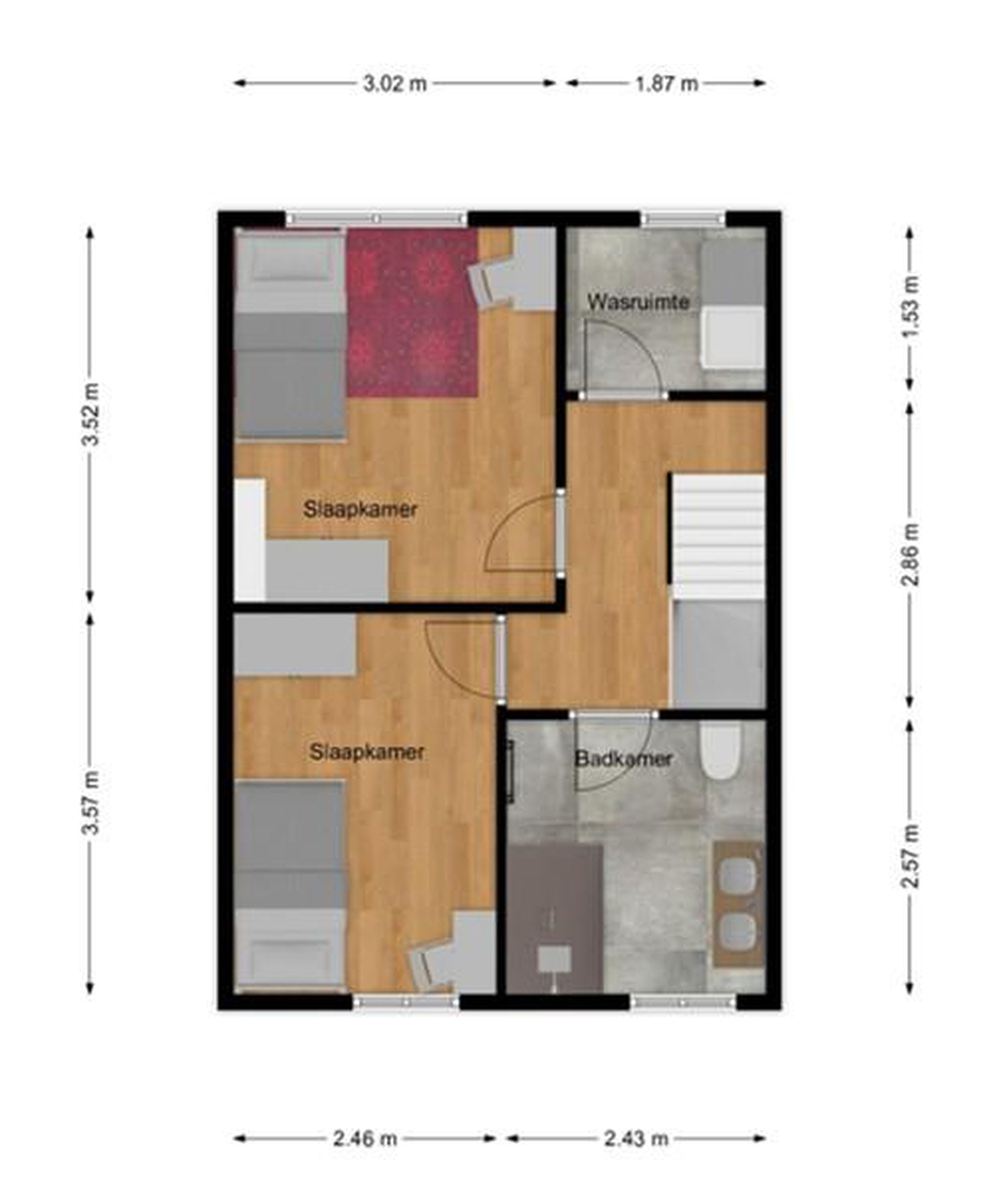 Eerste verdieping Overloop met laminaatvloer. Toegang tot de 2 slaapkamers, wasruimte en badkamer. Tevens trapopgang naar de tweede verdieping;