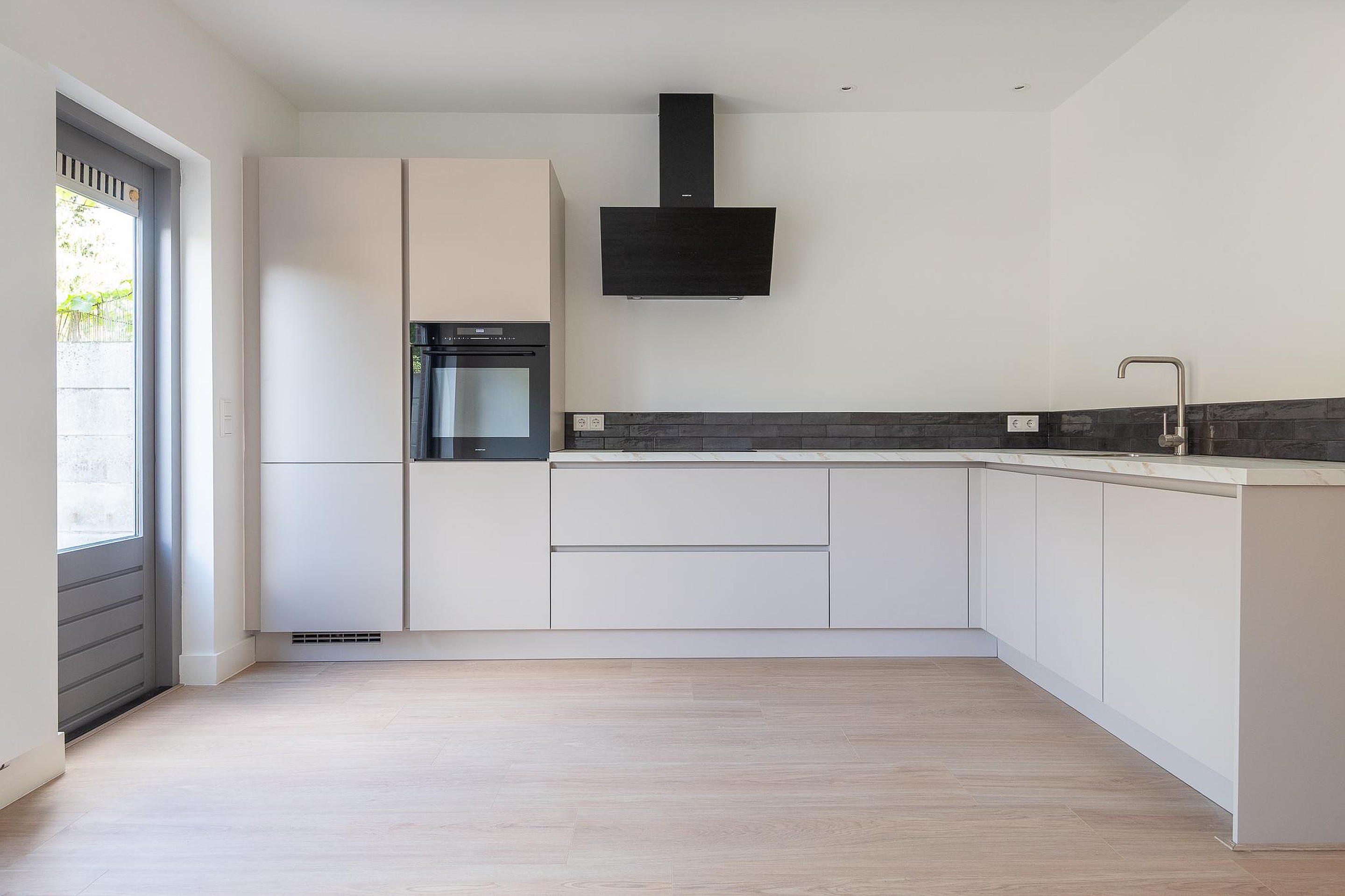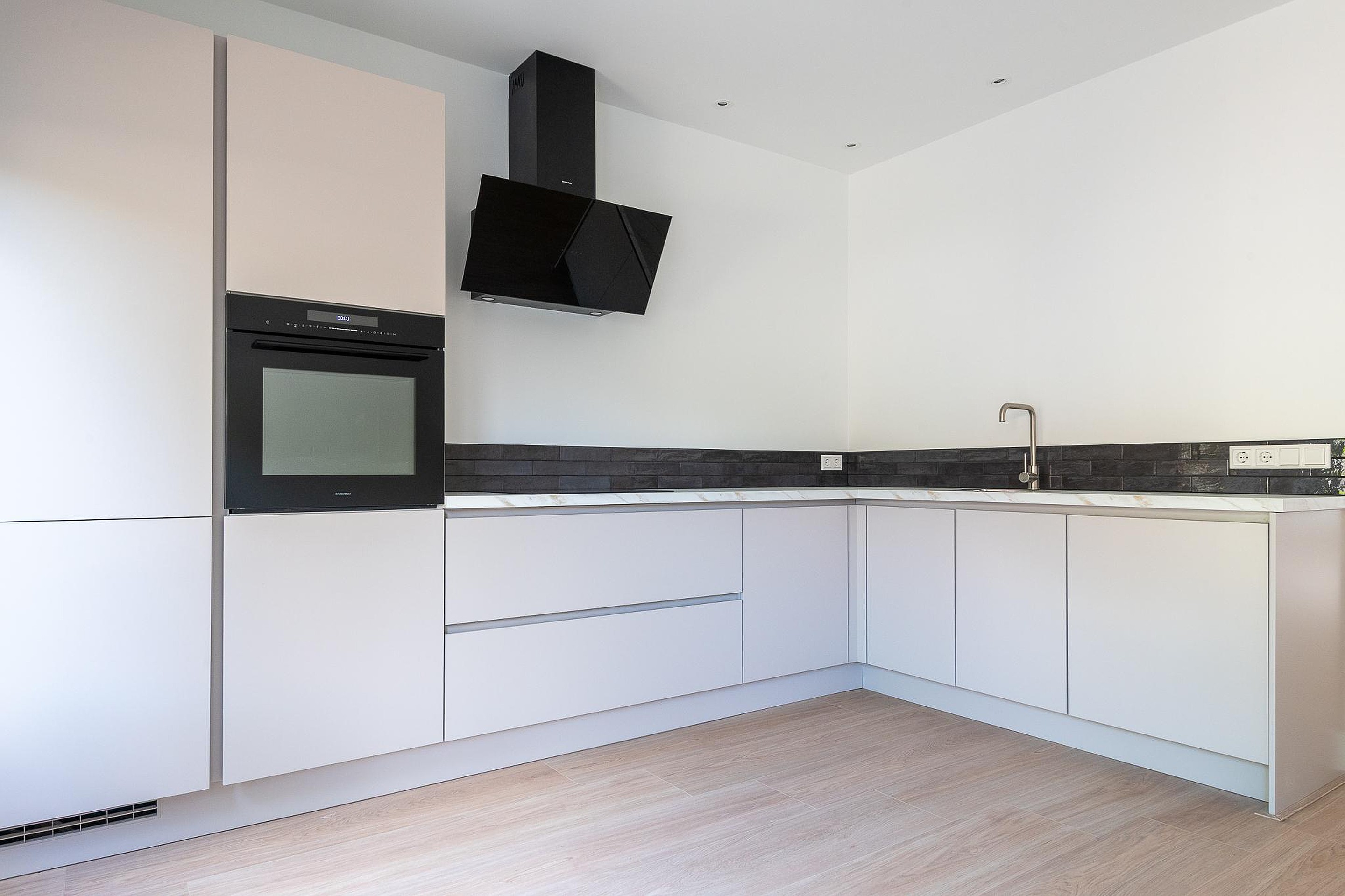 Open keuken voorzien van laminaatvloer met veel werkruimte, mengkraan, elektrische kookplaat, afzuigkap, oven en vaatwasser;
