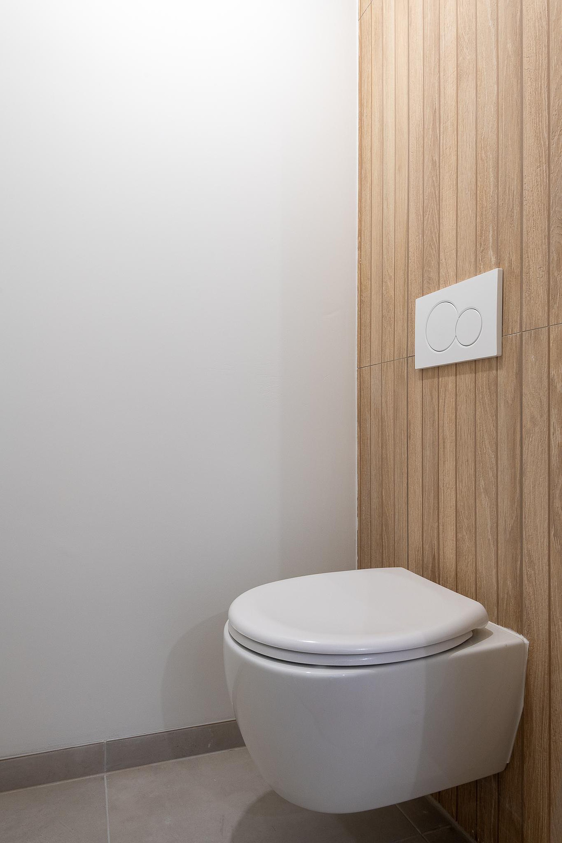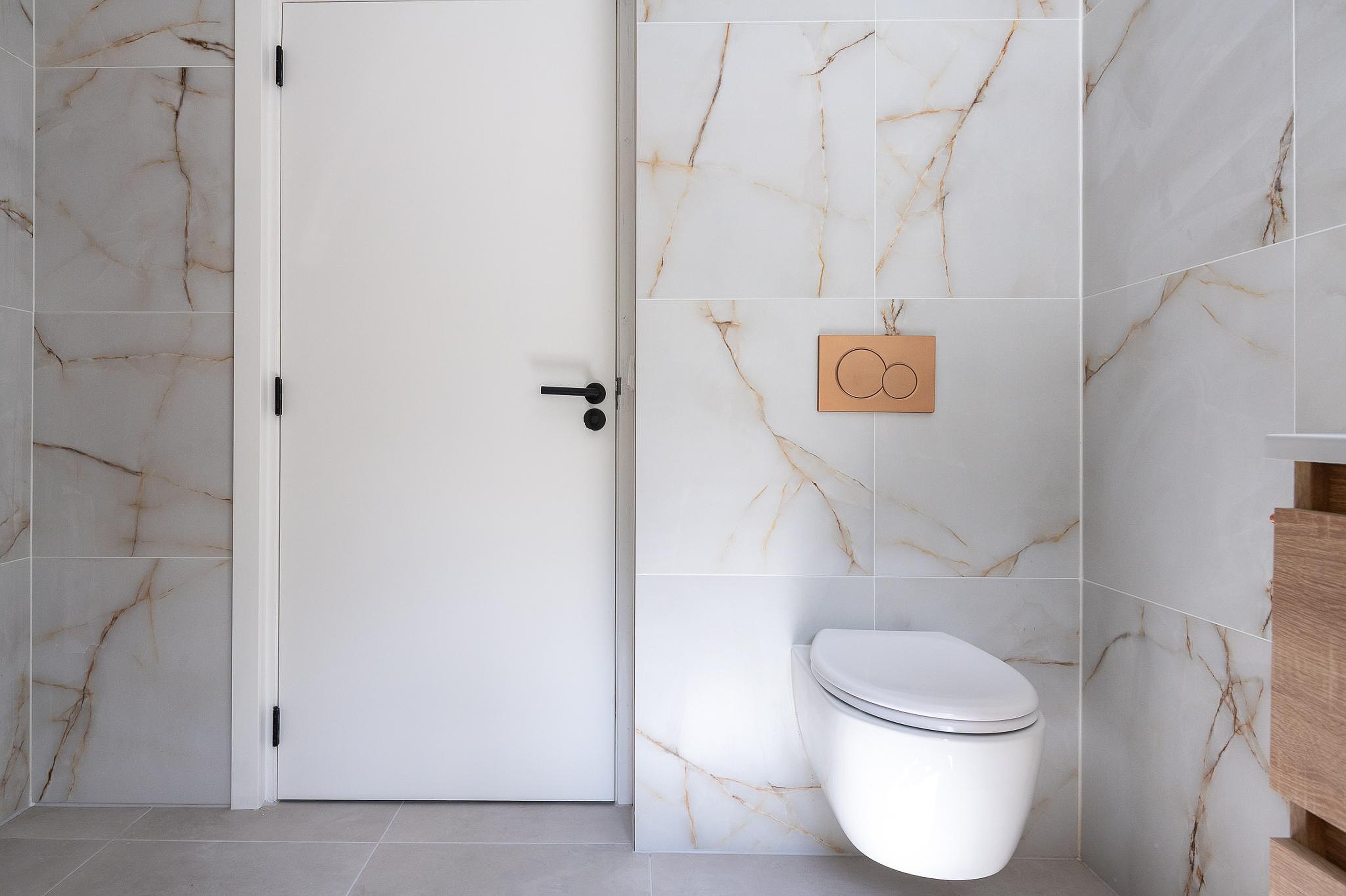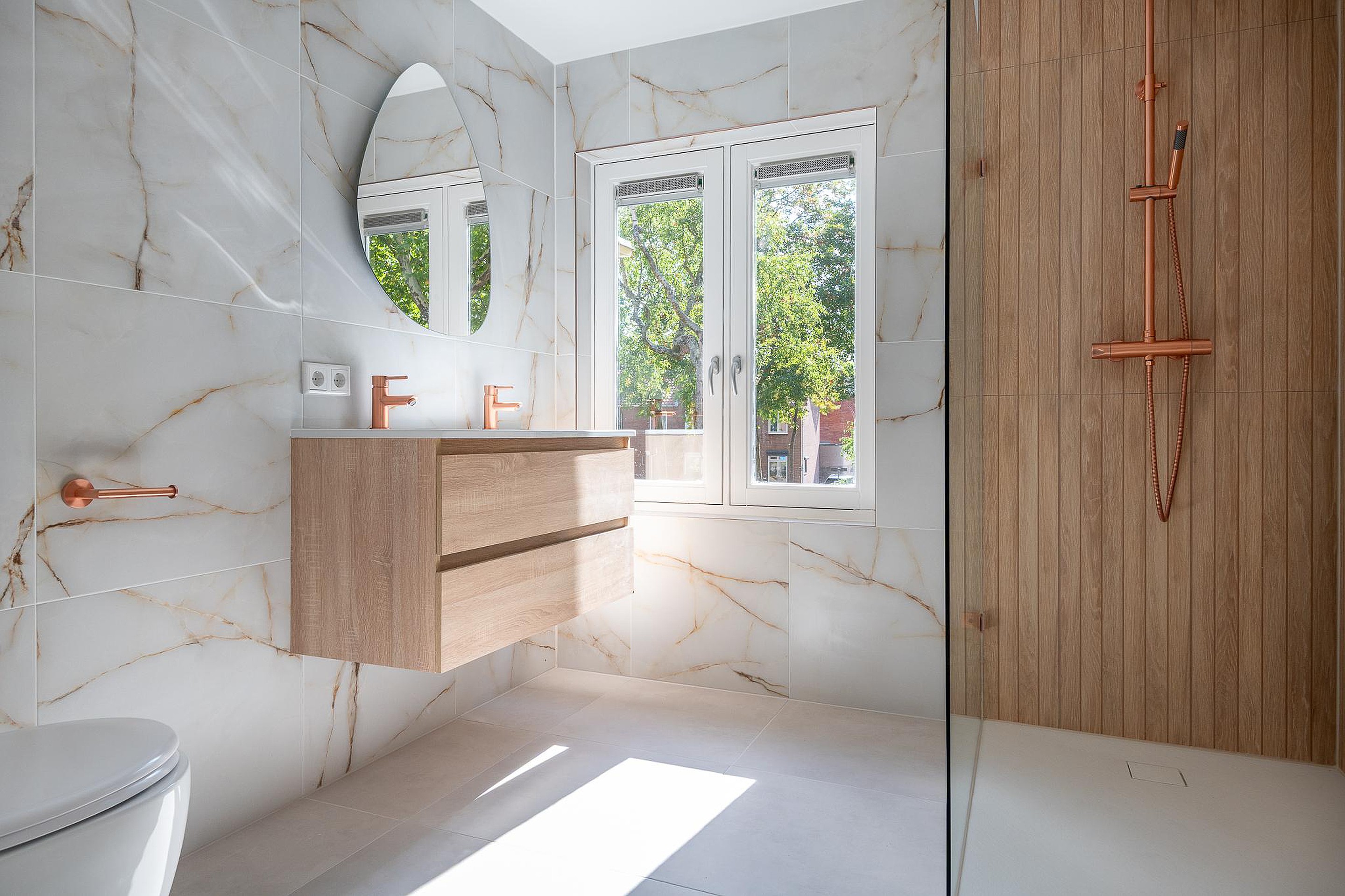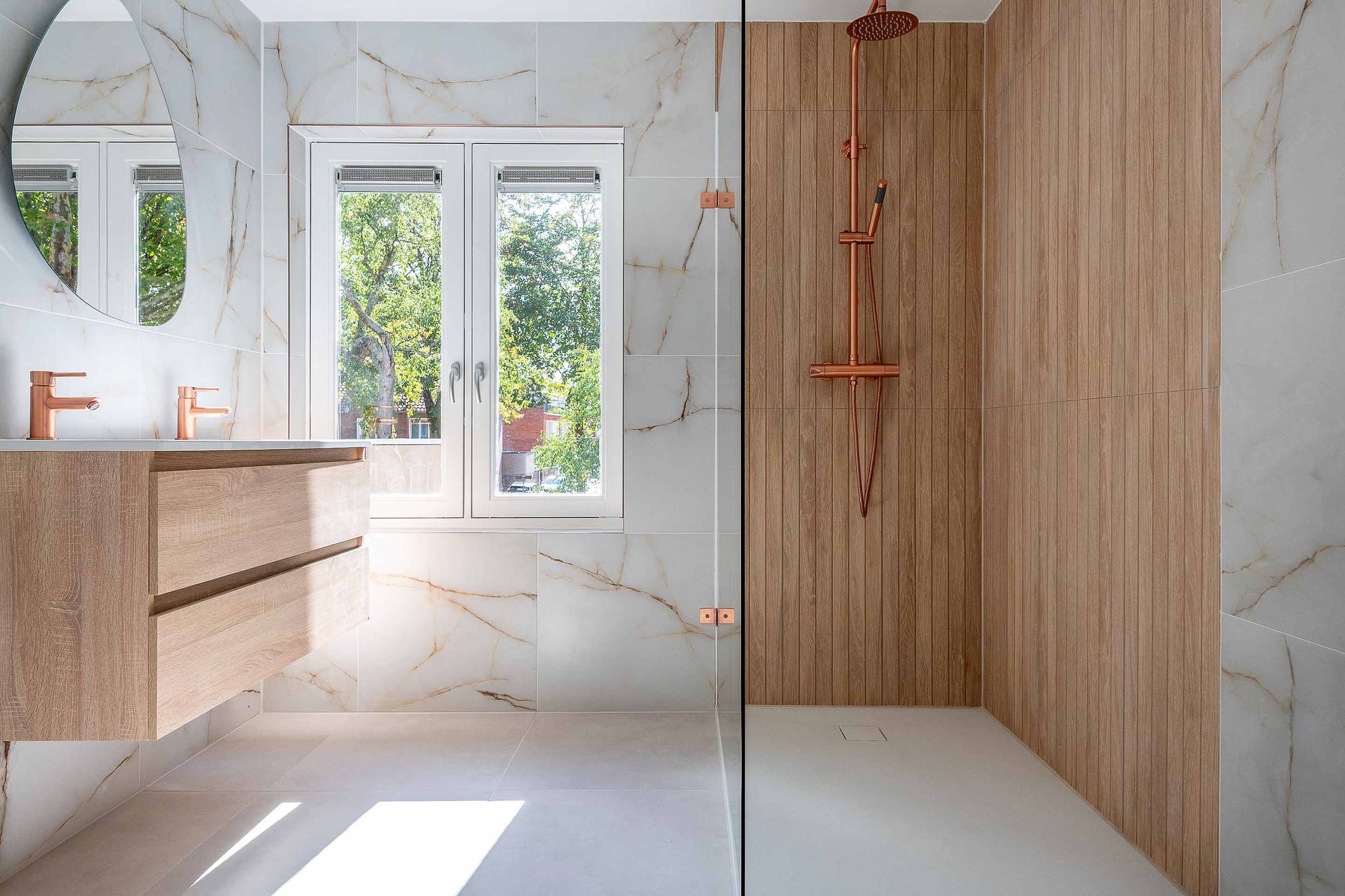 Badkamer (ca. 2.43 x 2.57m) geheel betegeld, met inloop douche, wastafel en 2e toilet;