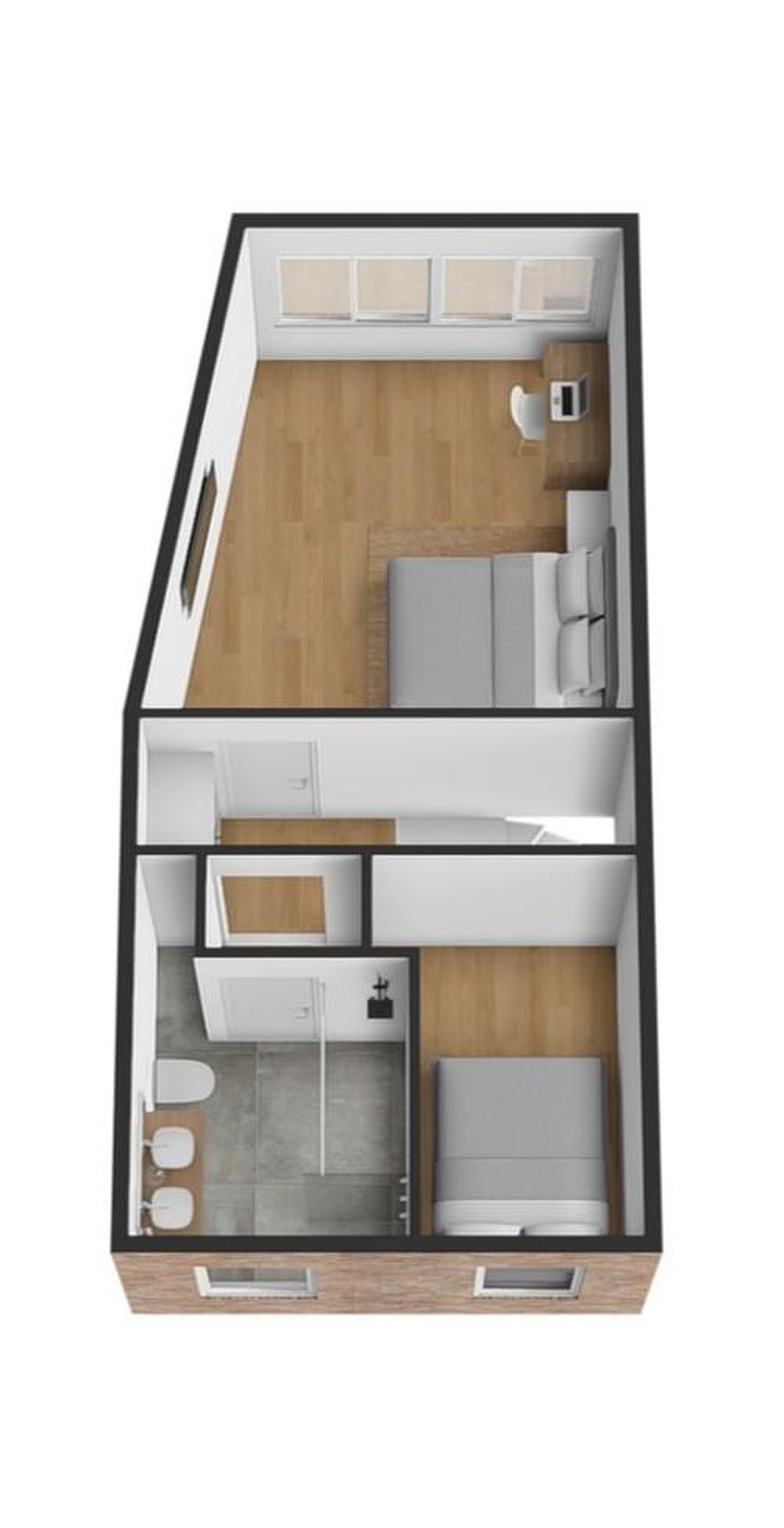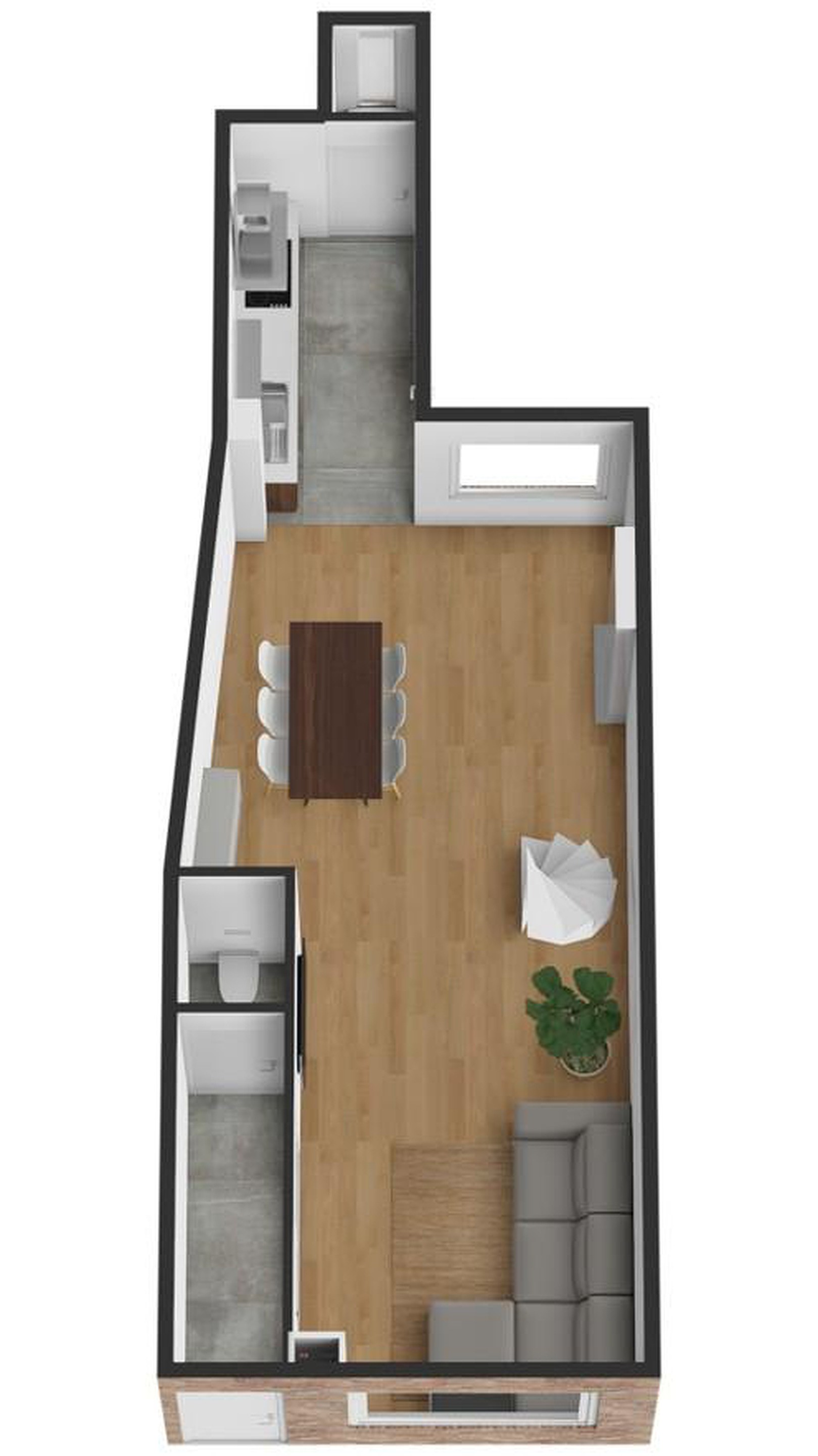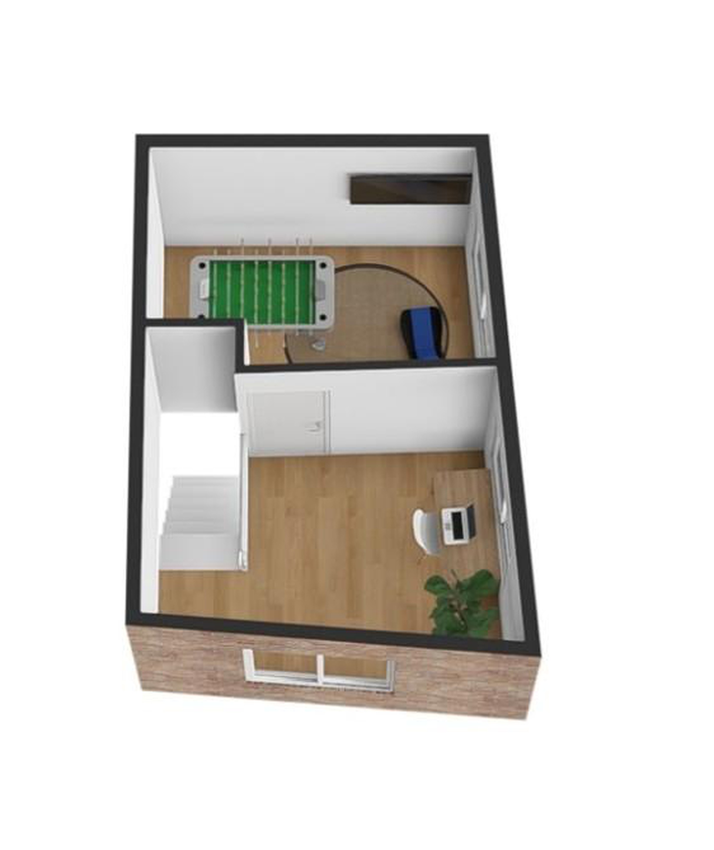 Multifunctionele ruimte voorzien van laminaatvloer, met elektra, verwarming, verdeeld in twee ruimtes.