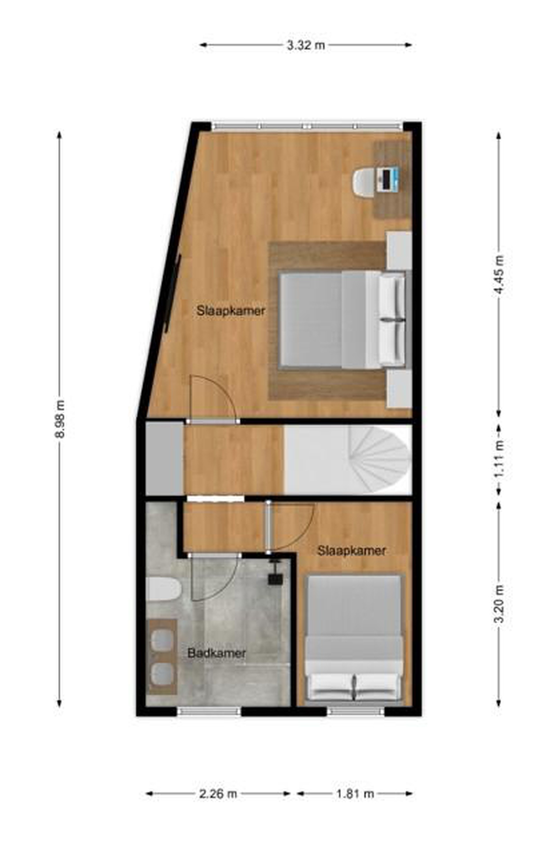 Slaapkamer I (ca. 3.32 x 4.45 m) achterzijde, voorzien van laminaatvloer;