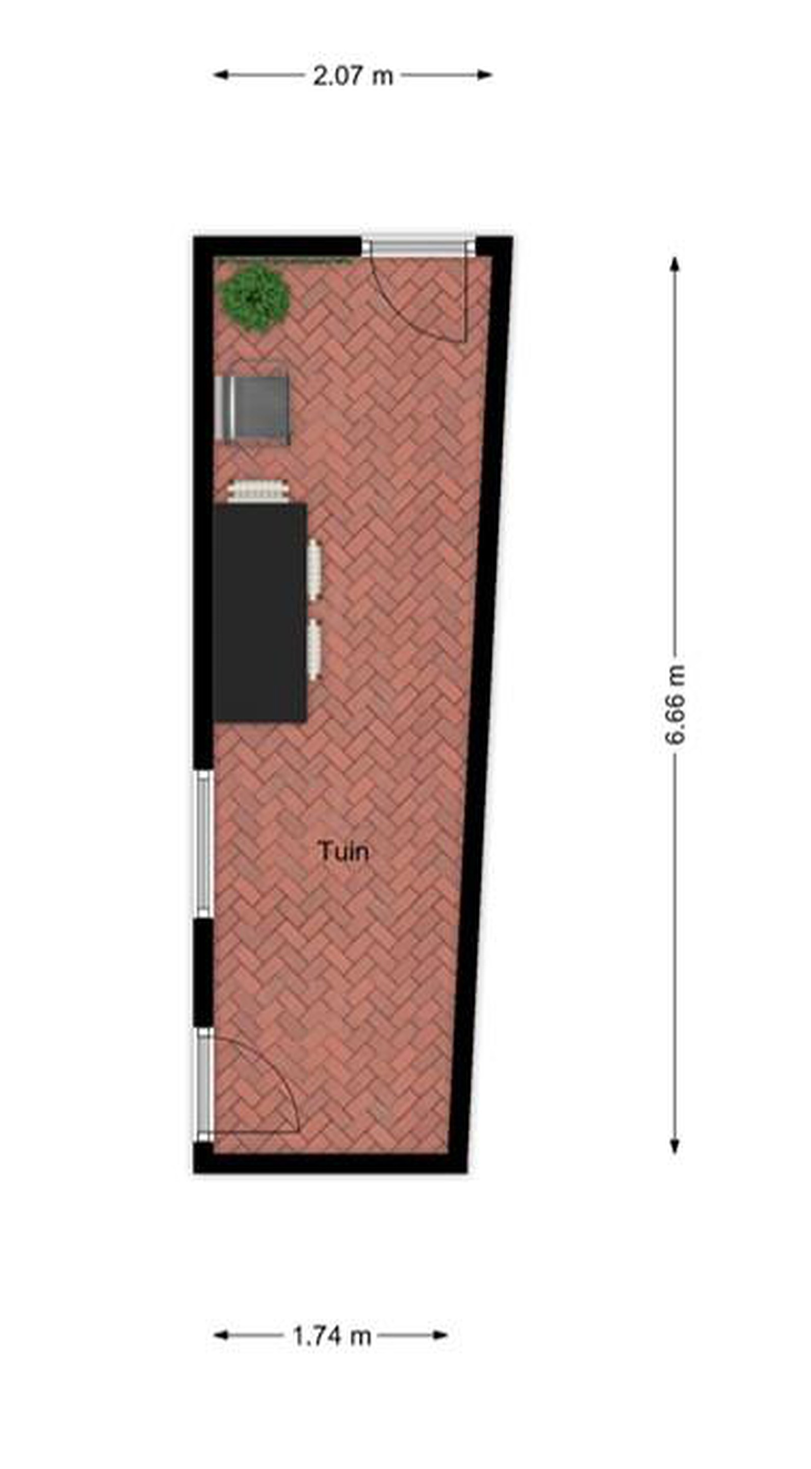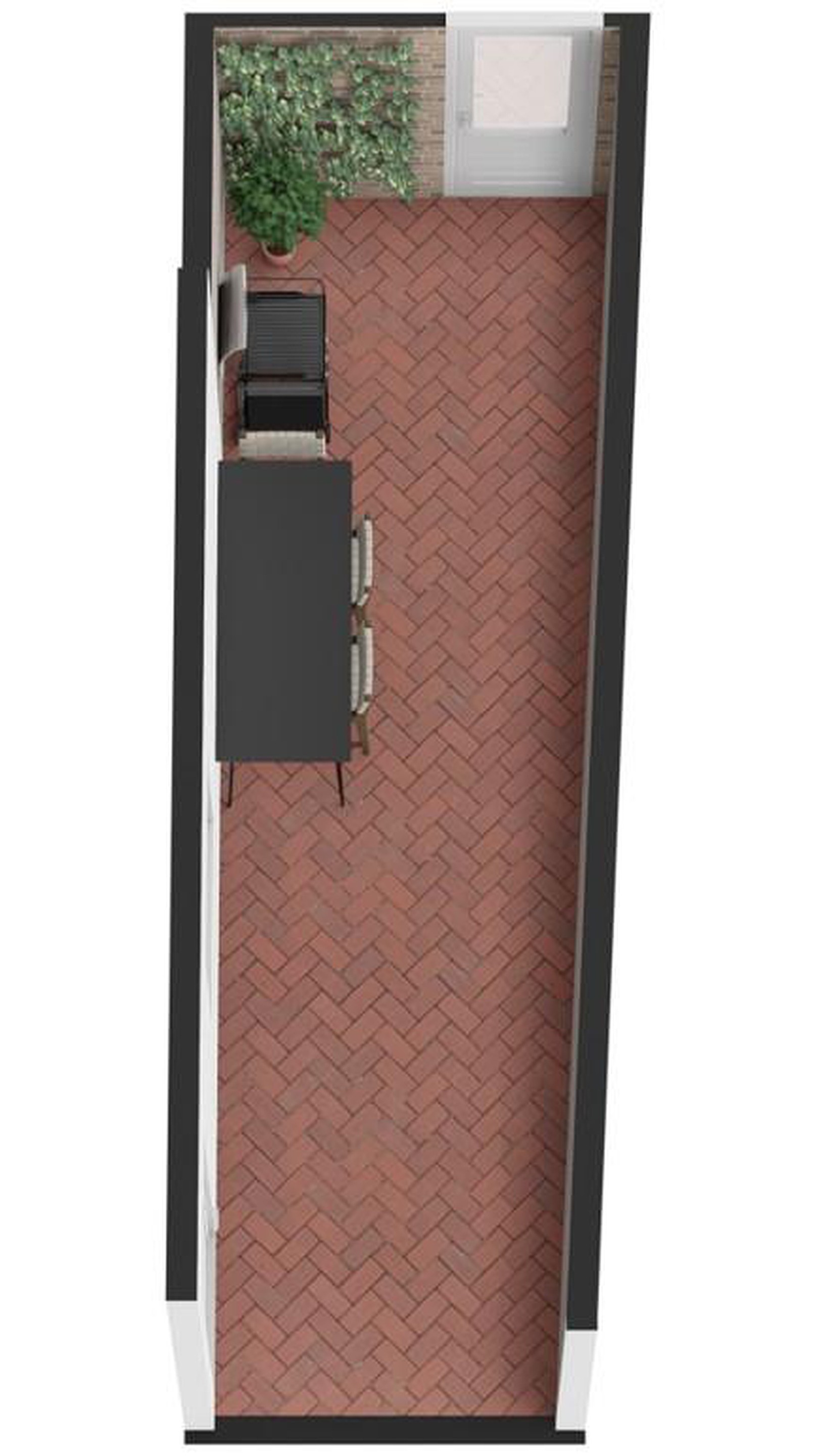 De zonnige binnentuin welke op het oosten gesitueerd is, is voorzien van sierbestrating, buitenverlichting en toegang tot de garage.