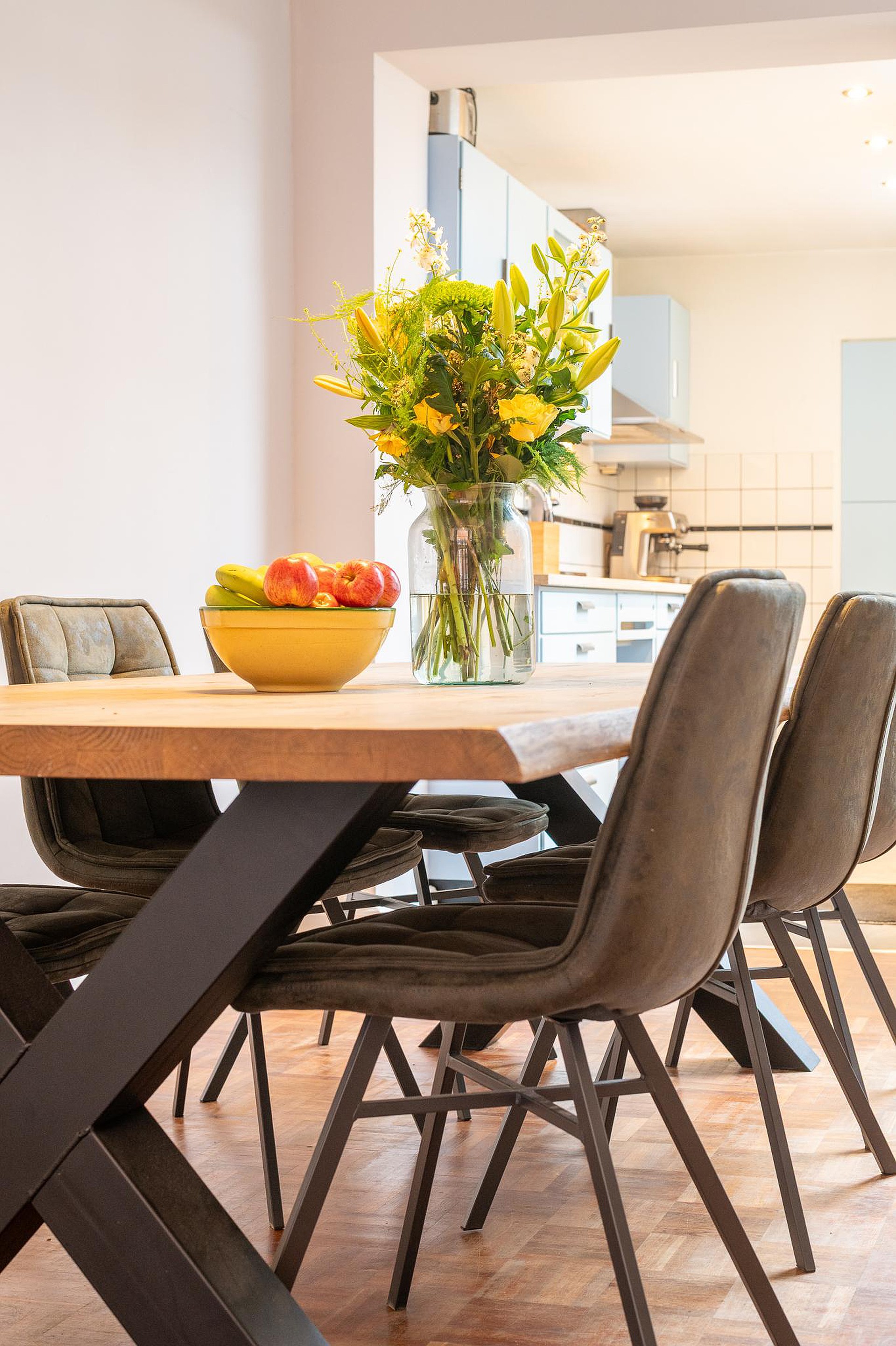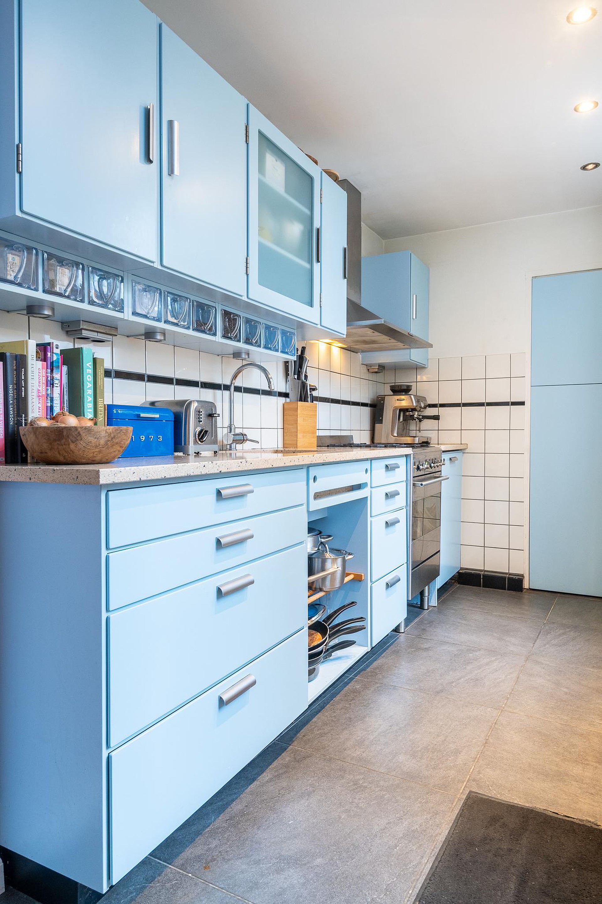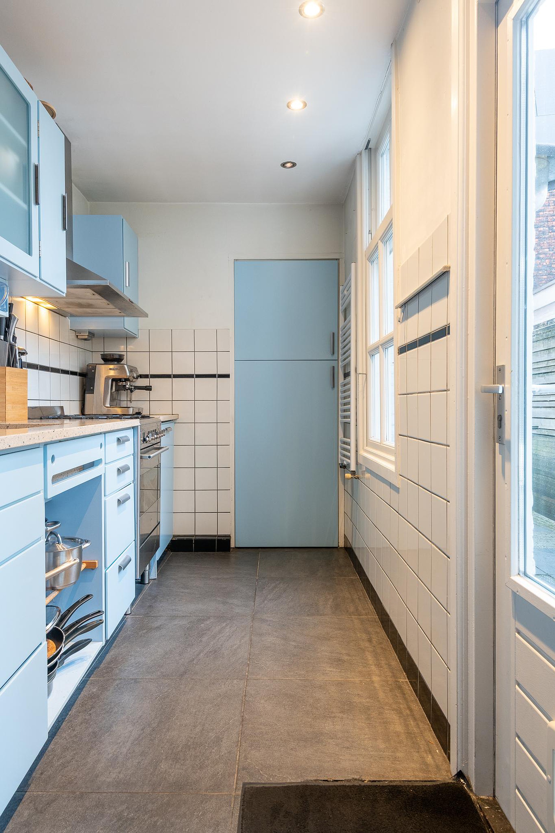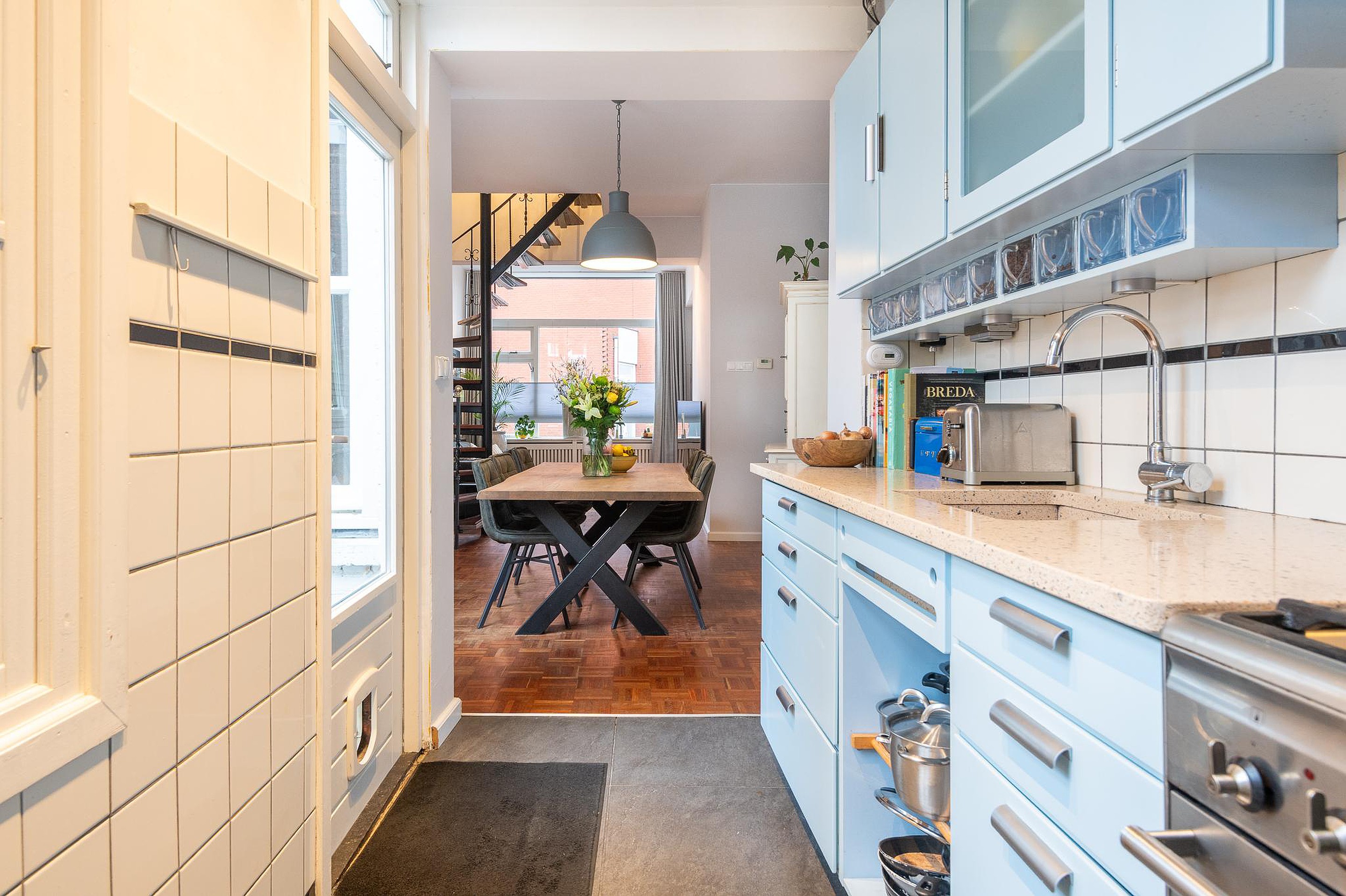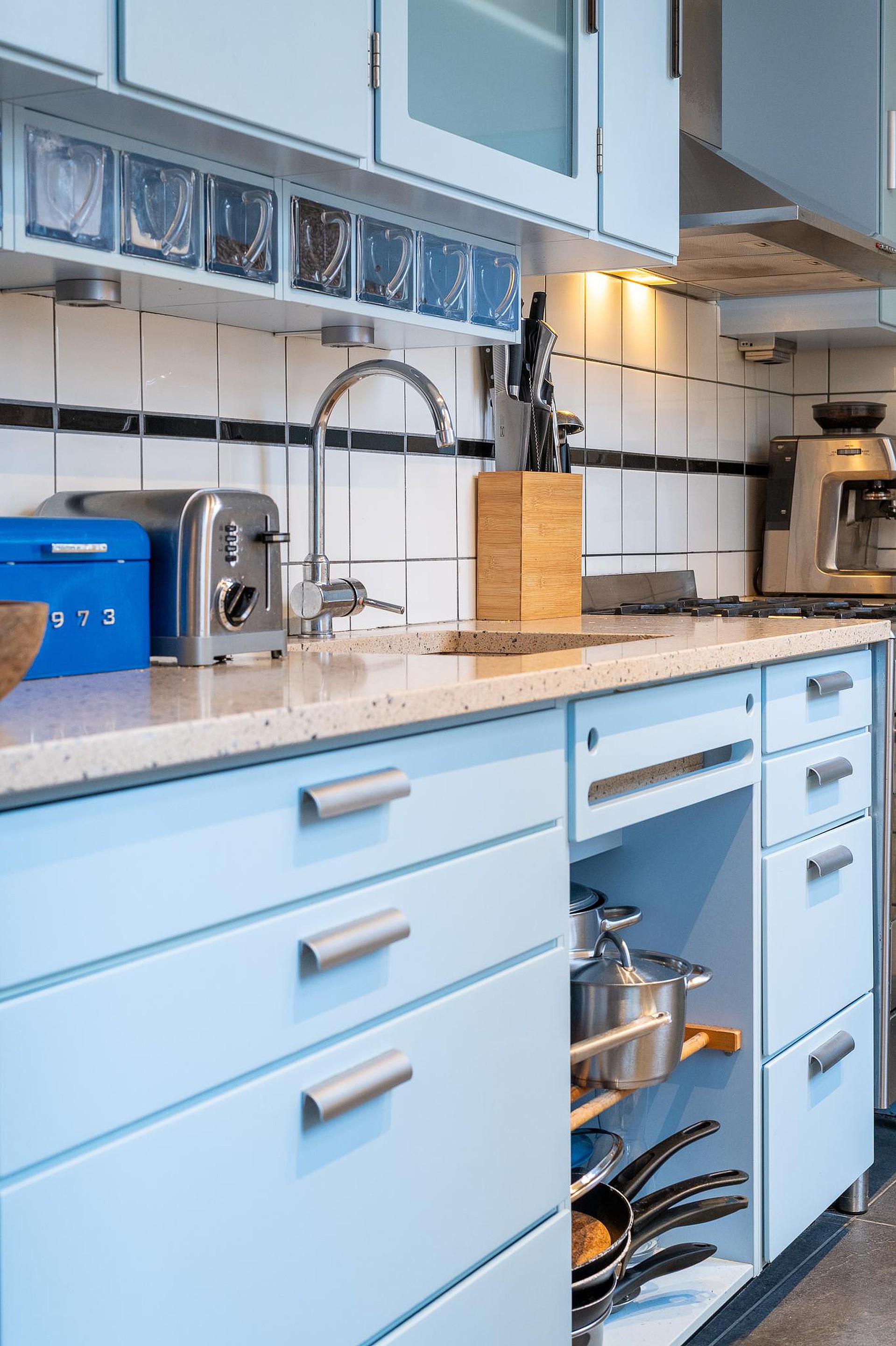 Semi open keuken voorzien van tegelvloer met voldoende werkruimte op het granieten werkblad, mengkraan, 4-pits RVS gaskookfornuis, afzuigkap, oven, koelkast (2023) en vaatwasser (2023). In de vaste kast de opstel plaats CV-combiketel (Remeha Tzerra 2015). Middels loopdeur toegang tot de tuin.