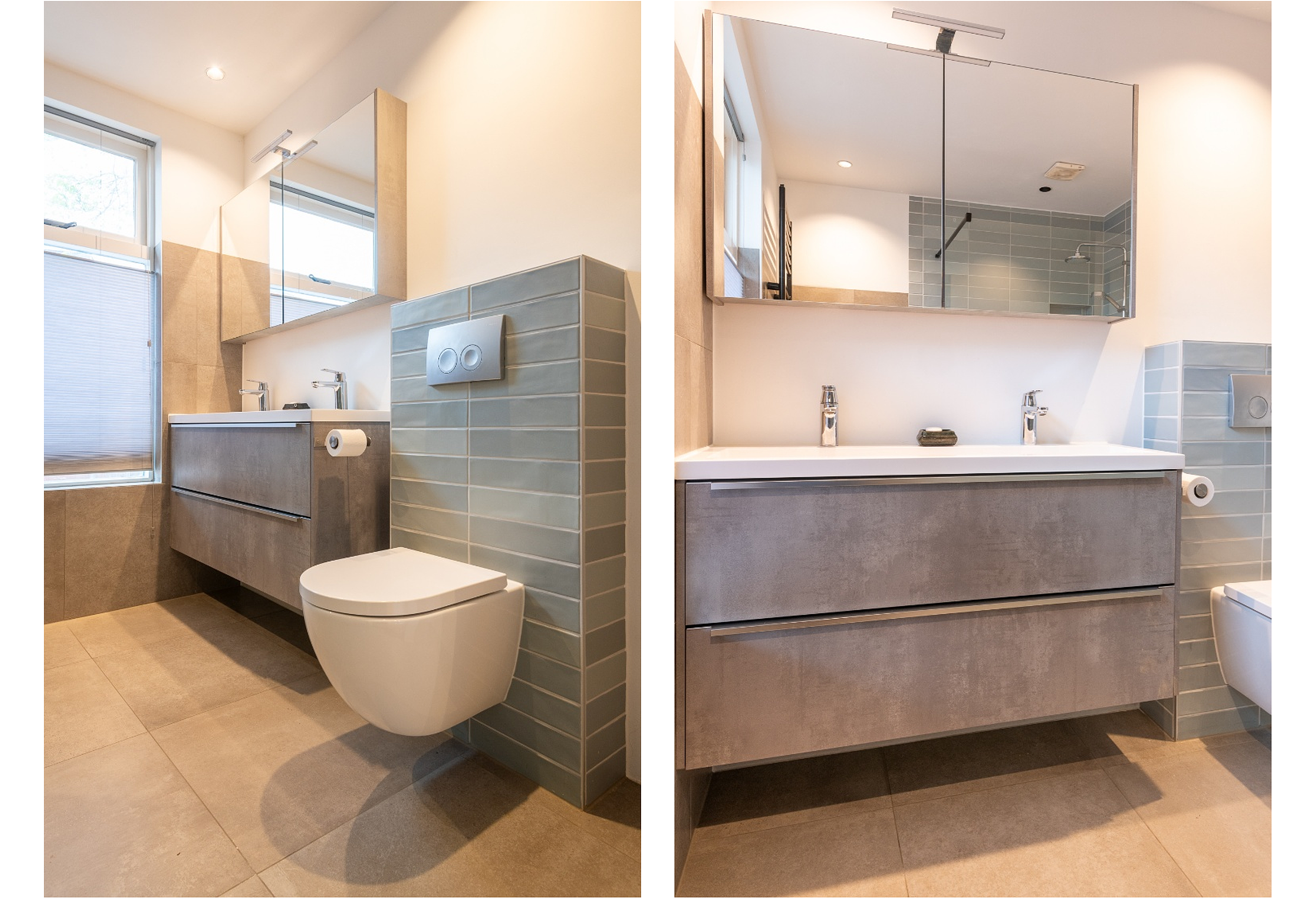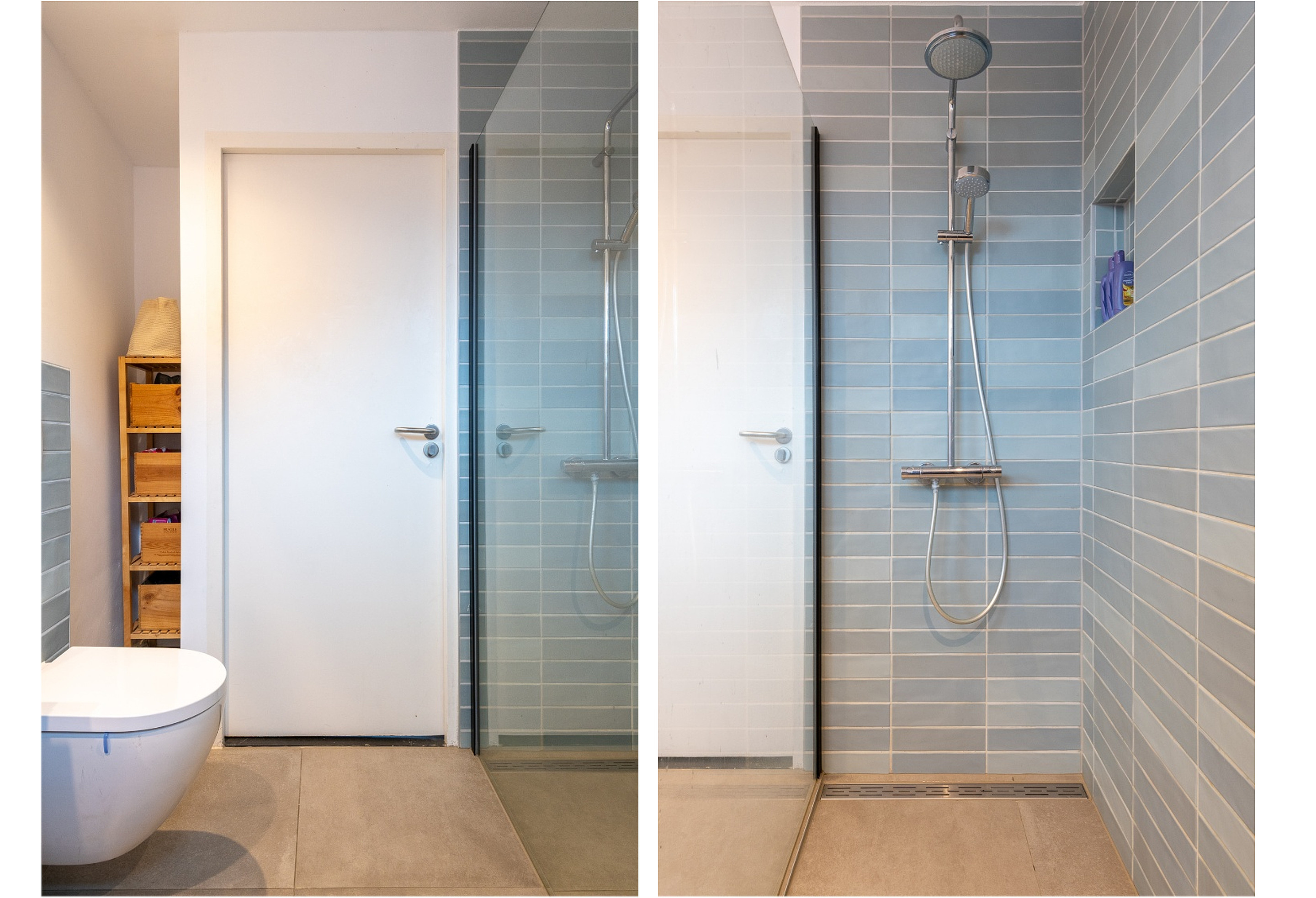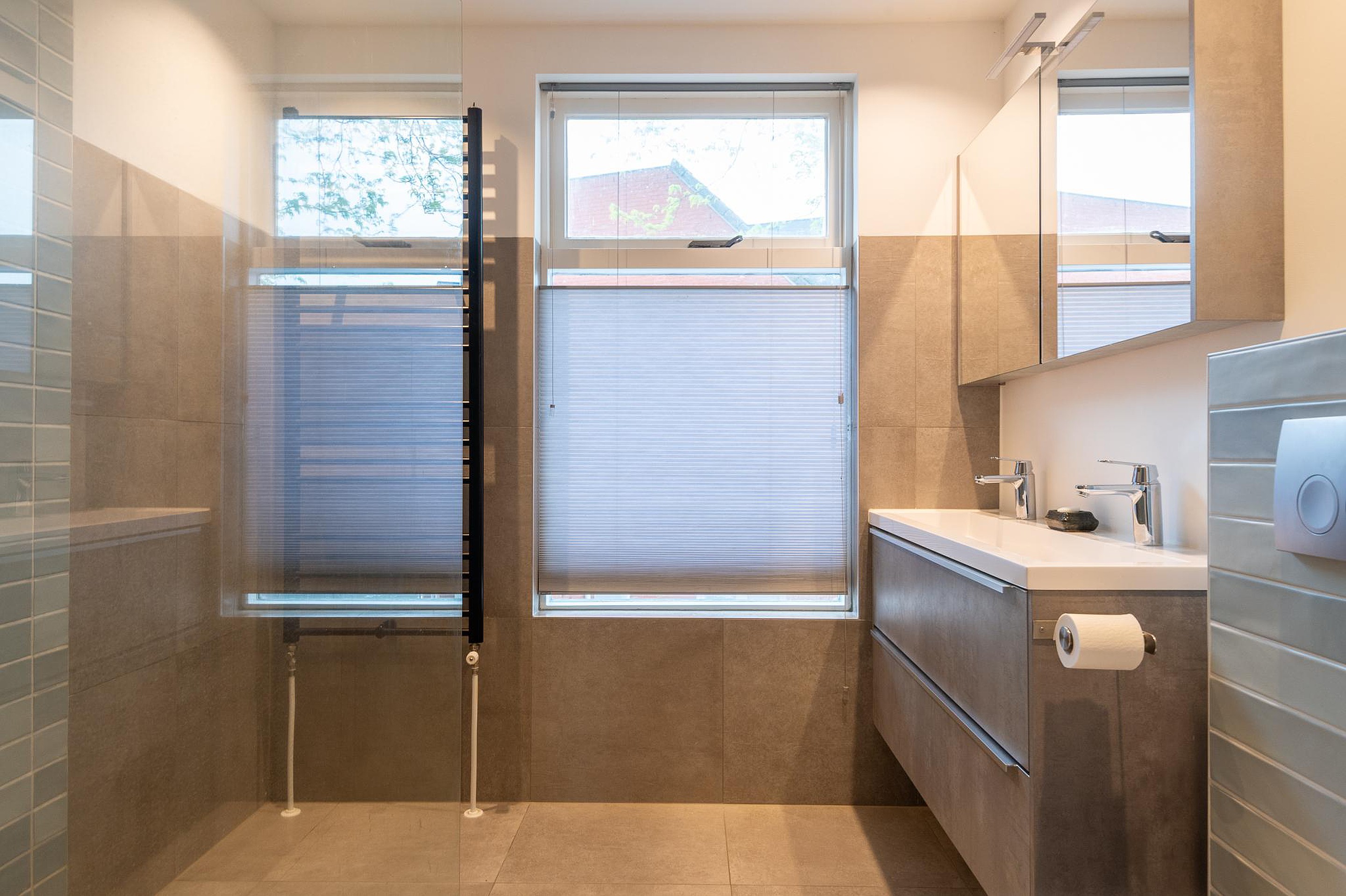 Badkamer (ca. 2.26 x 3.20 m) voorzijde, geheel betegeld, met inloop douche, wastafel en 2e toilet.