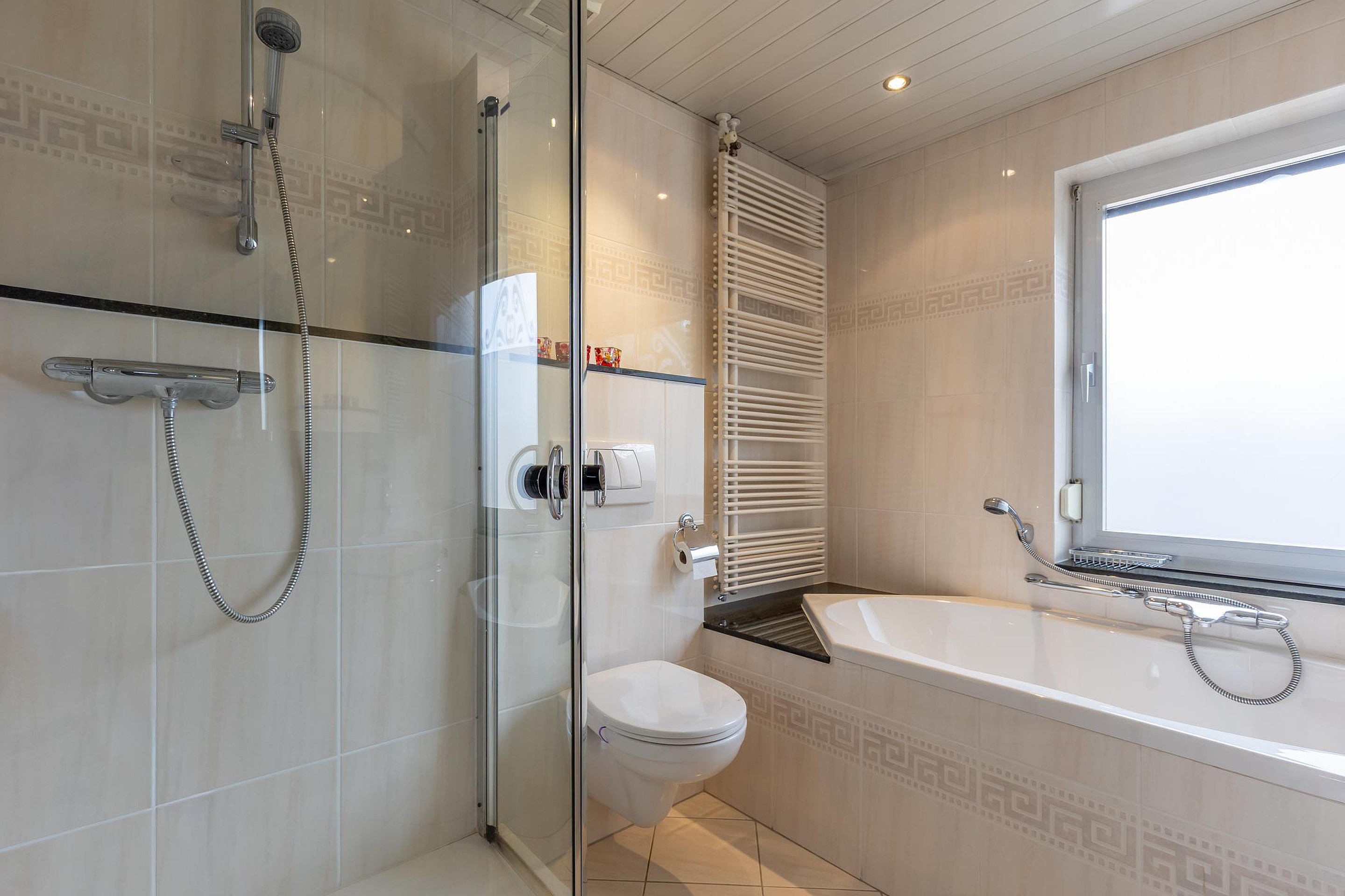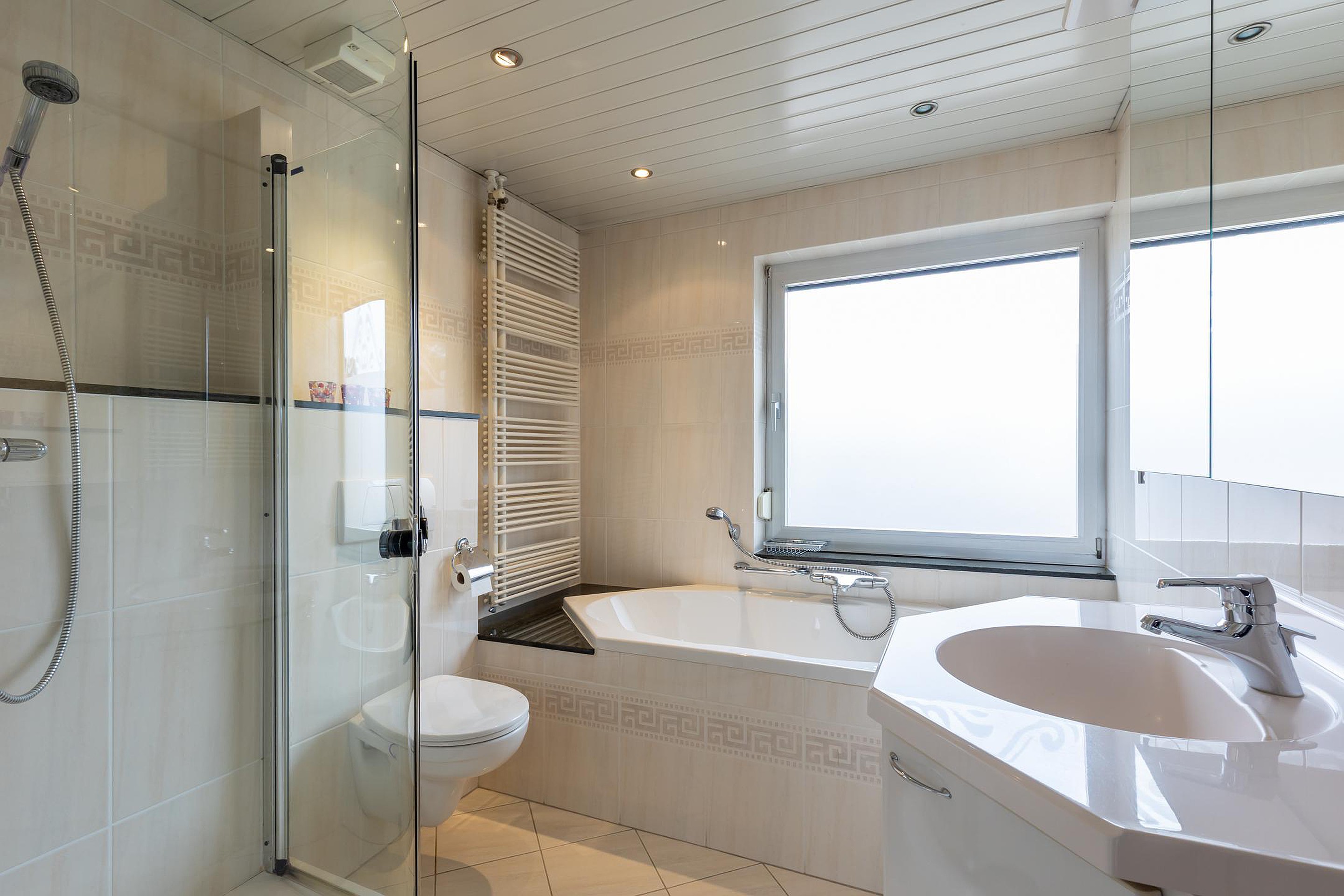 Eerste verdieping overloop, 3 slaapkamers (8.5, 14 en 10m2), alle voorzien van parketvloeren, moderne badkamer (6m2) met ligbad, douchecabine, 2e toilet en wastafel in badmeubel