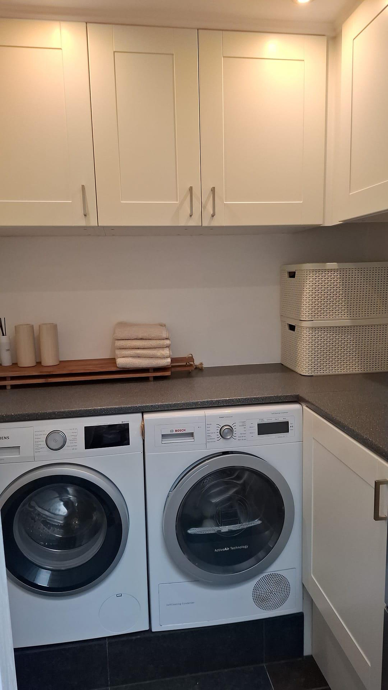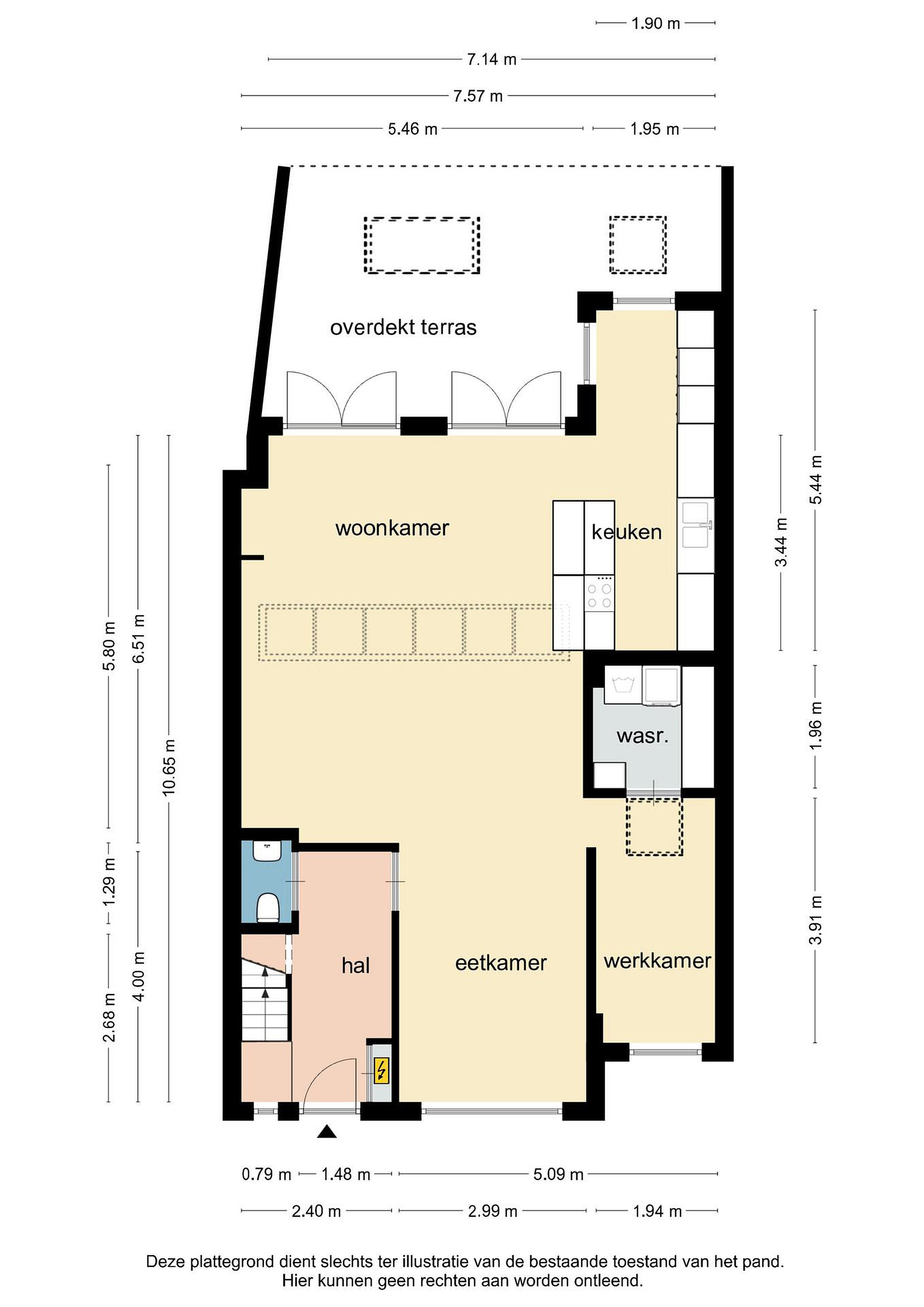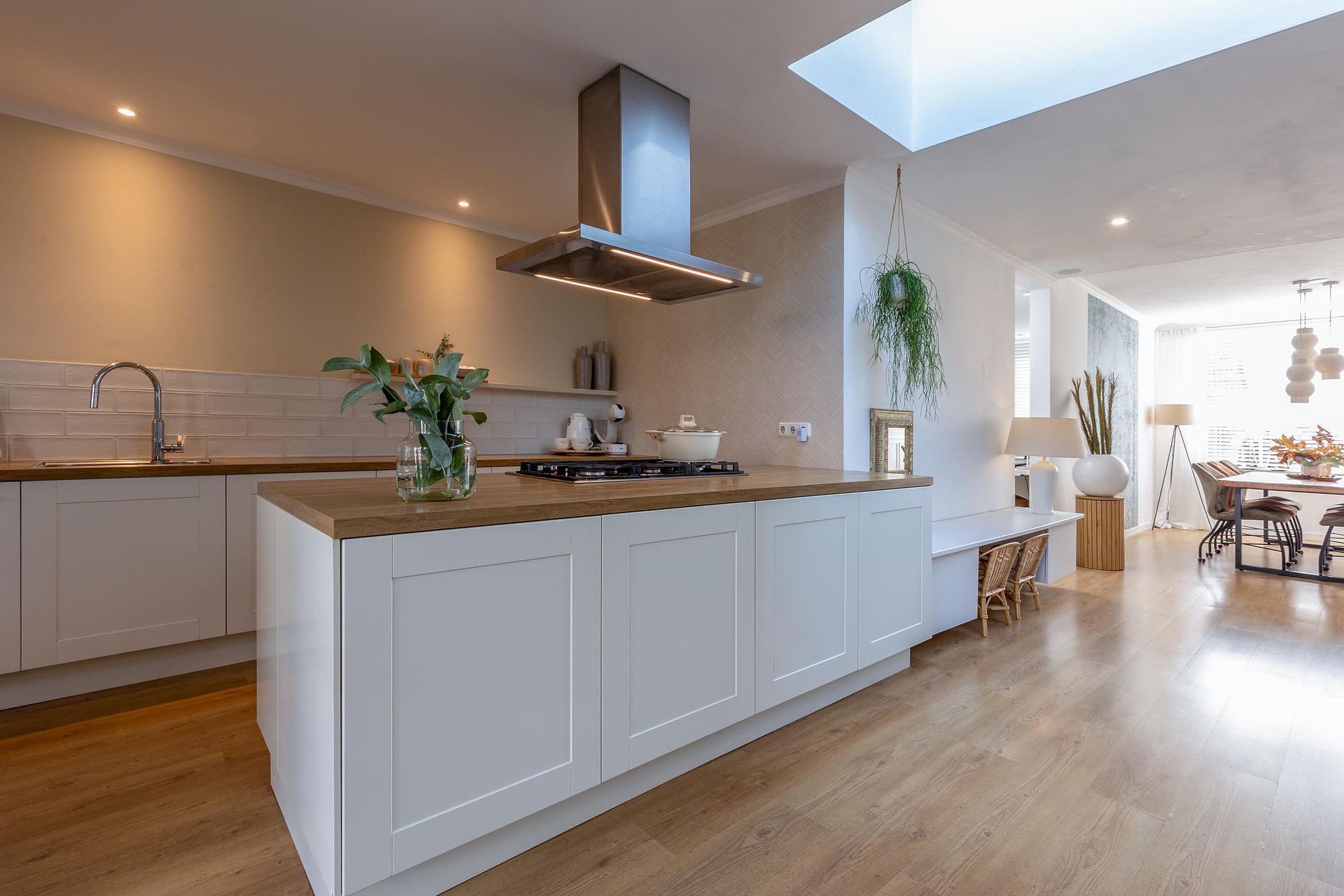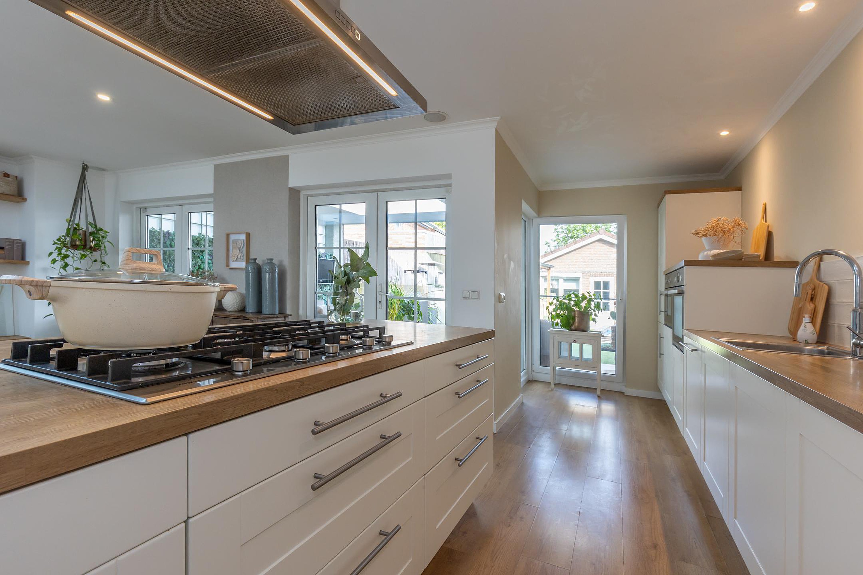 Begane grond entree, hal, meterkast met ruim voldoende groepen, lichte en ruime woonkamer (70 m2) met aanbouw met lichtstraat en openslaande tuindeuren naar de grote overkapping, werkkamer/kantoor (7,6 m2) met airco, bijkeuken met aansluitingen wasmachine en droger, open keuken (10,6 m2) met schiereiland en veel kastruimte, koelkast, vriezer, oven, combi-oven, afzuigkap, vaatwasser en 5-pits gaskookplaat. Woonkamer en keuken zijn voorzien van vloerverwarming.