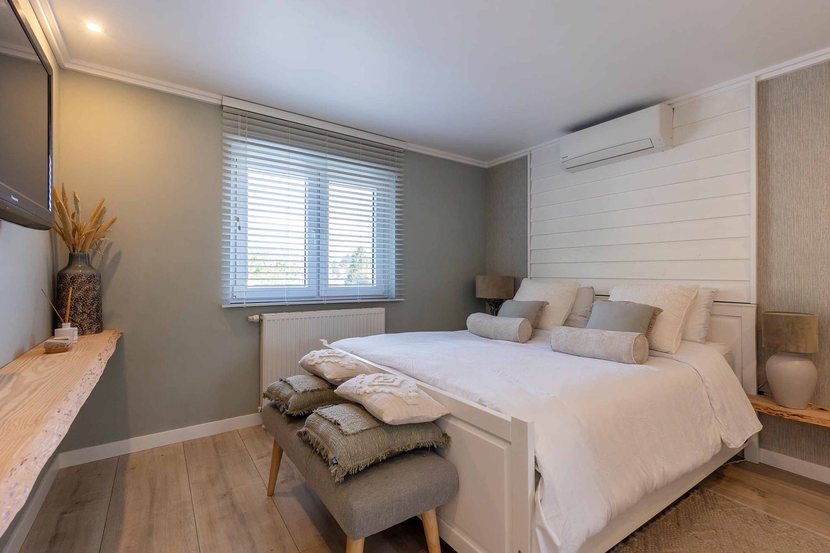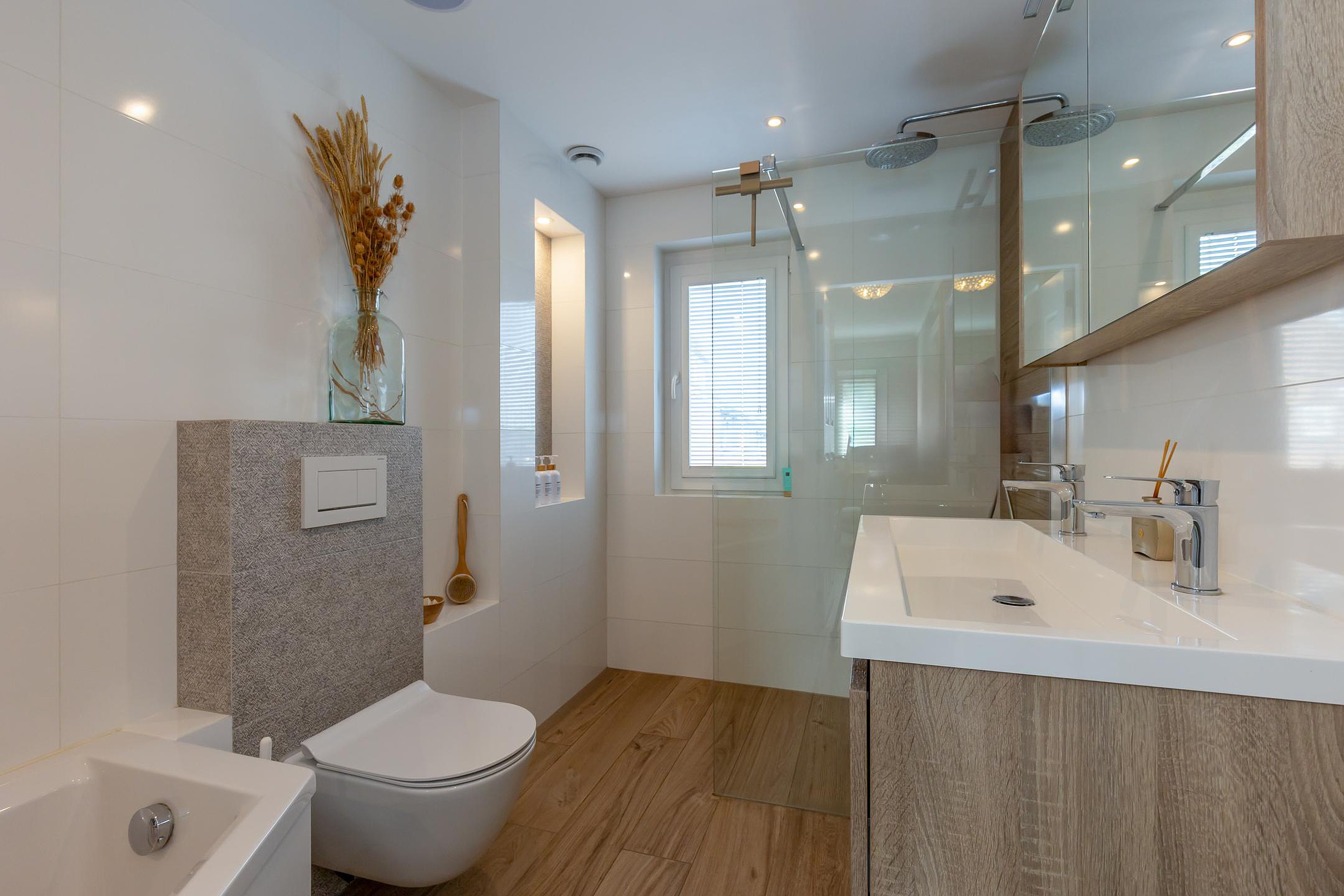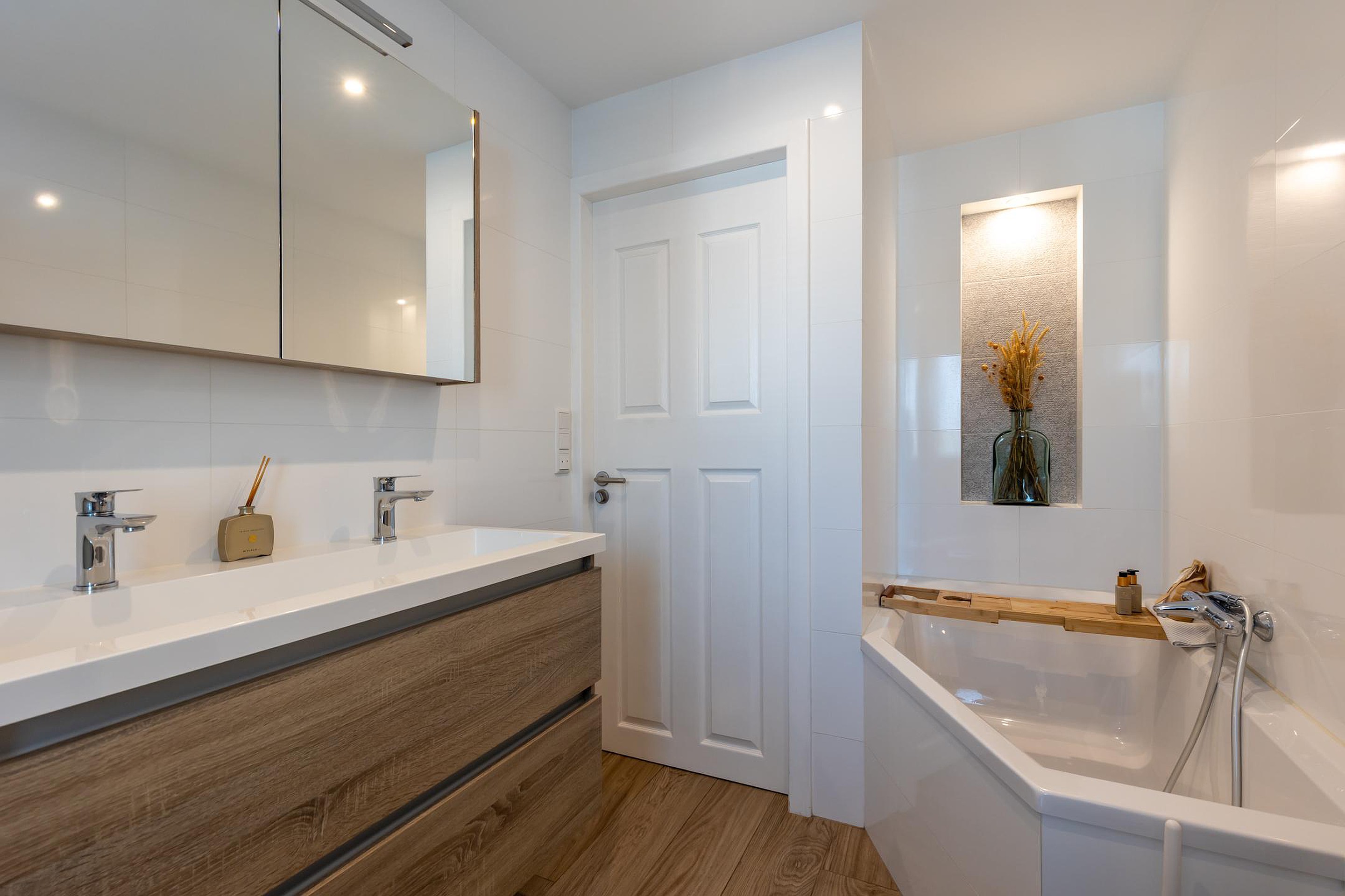 Eerste verdieping overloop, 2 slaapkamers (10.5 en 12.5m2), 1 met airco en moderne badkamer (6m2) met vloerverwarming, inloopdouche, ligbad, toilet en dubbele wastafel in