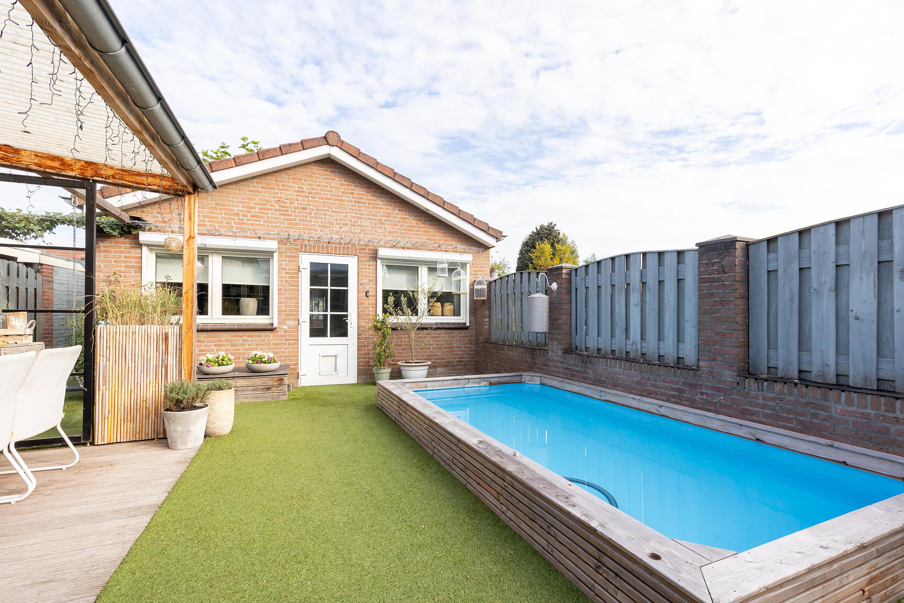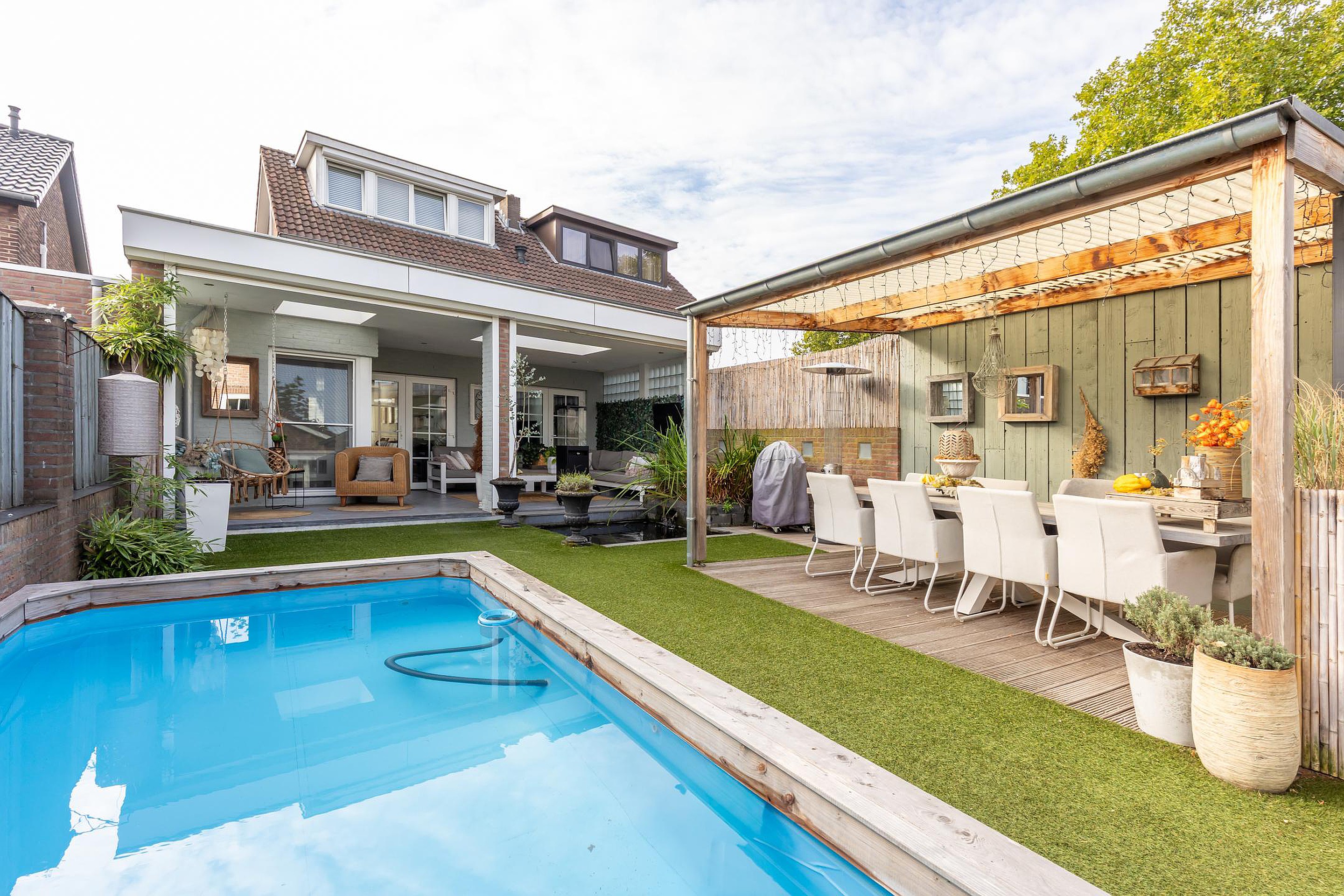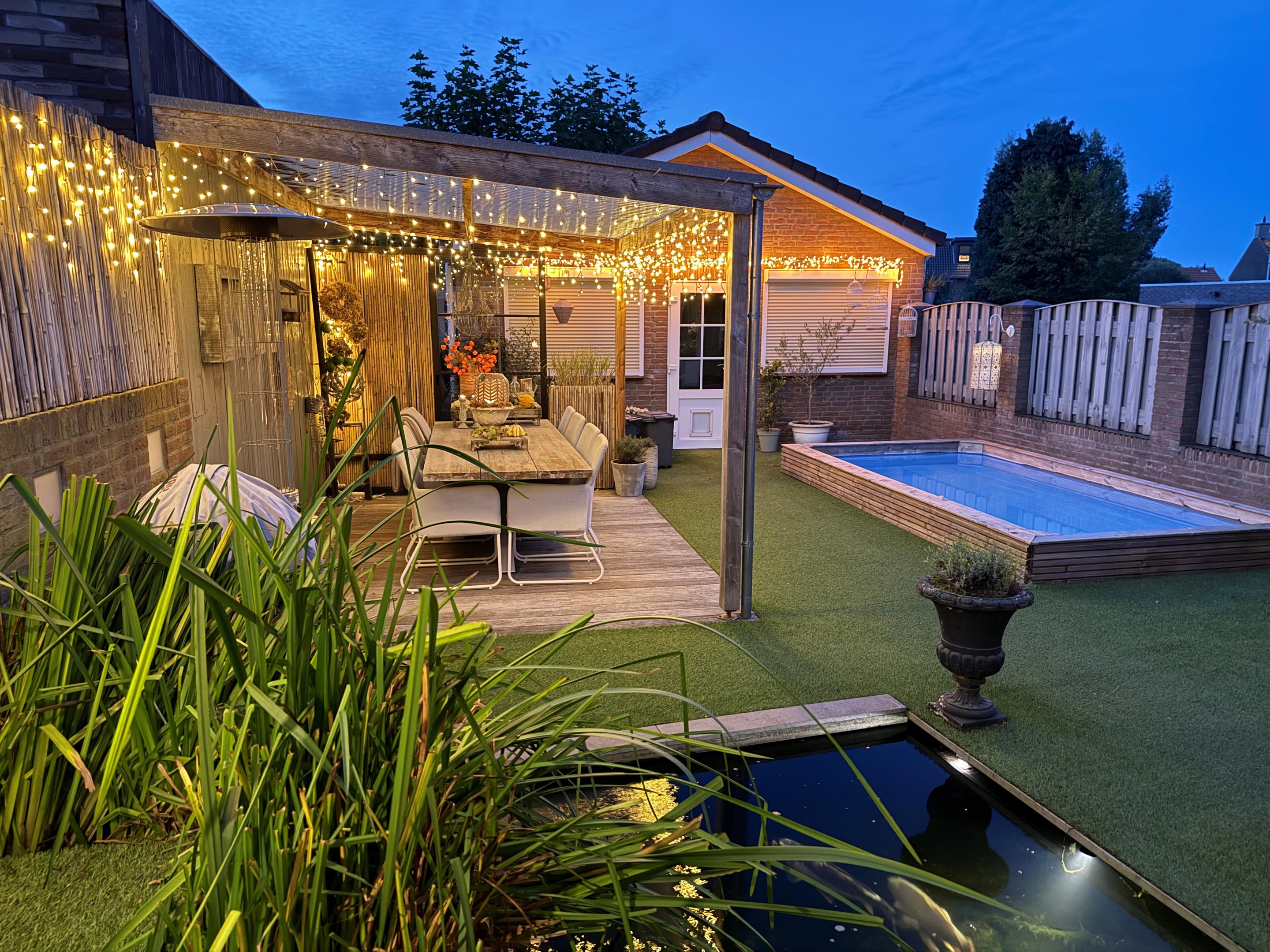 Tuin voortuin, gezellige achtertuin met diverse zitgelegenheden waardoor je altijd van de zon of schaduw kunt genieten en met grote aangebouwde overkapping (23m2), vrijstaande overkapping (12m2), koivijver, zwembad, grote garage (36m2) met kap/zolder, elektrische sectionaalpoort en toilet, ruime oprit voor 3 auto’s. Toegang tot perceel via oprit aan achterzijde.
