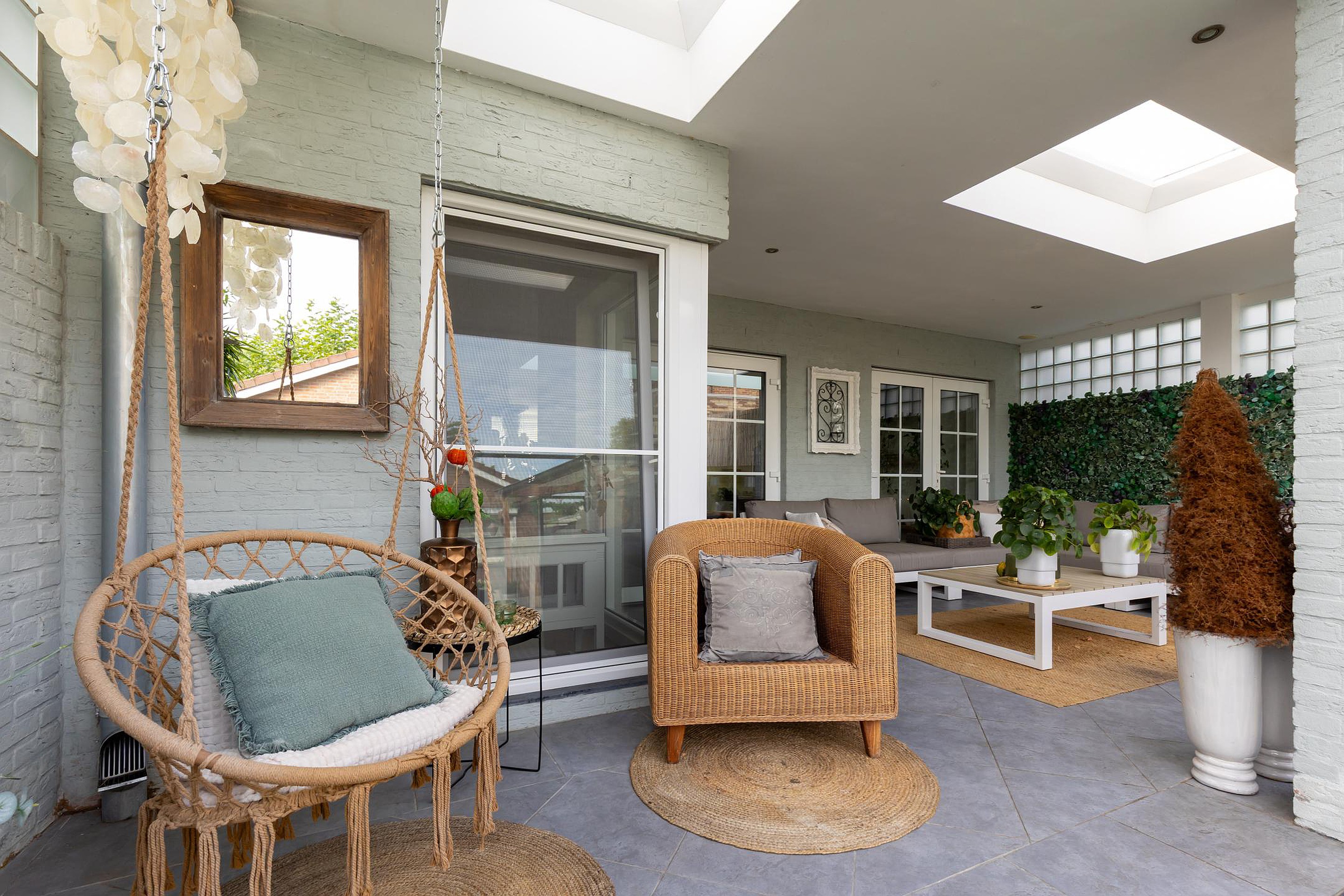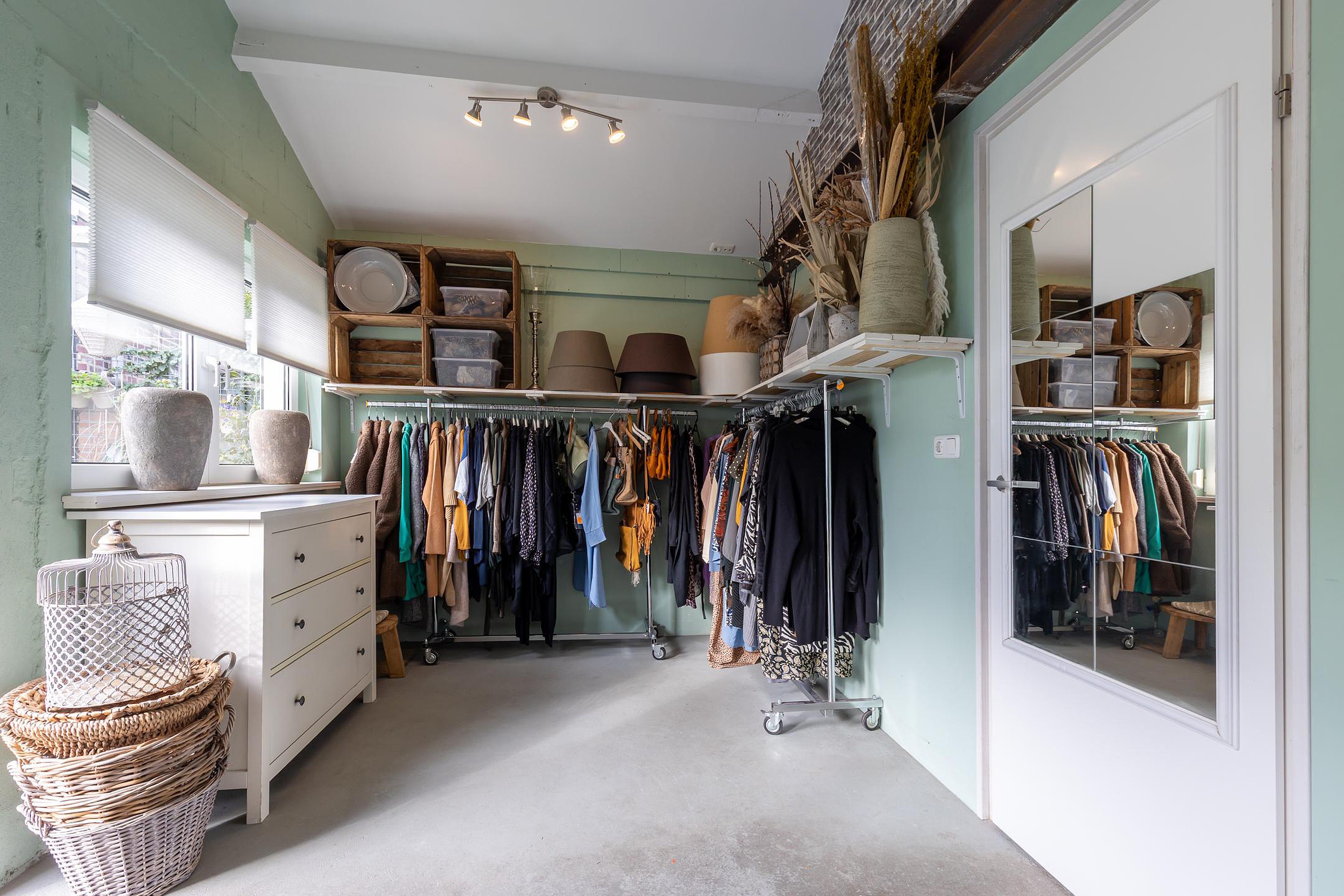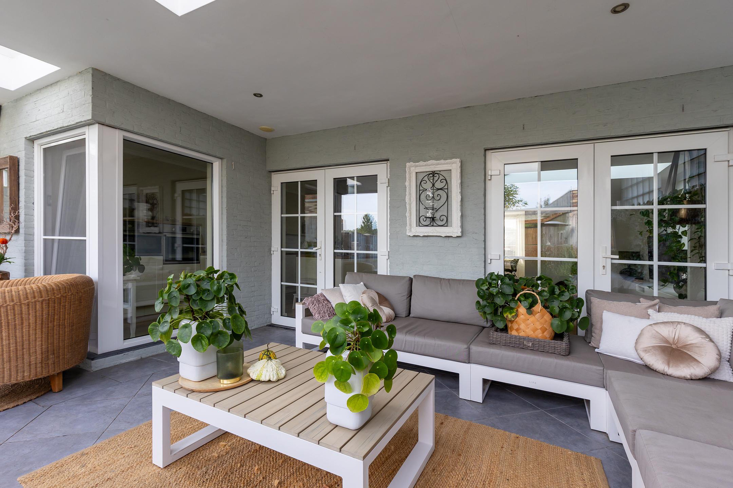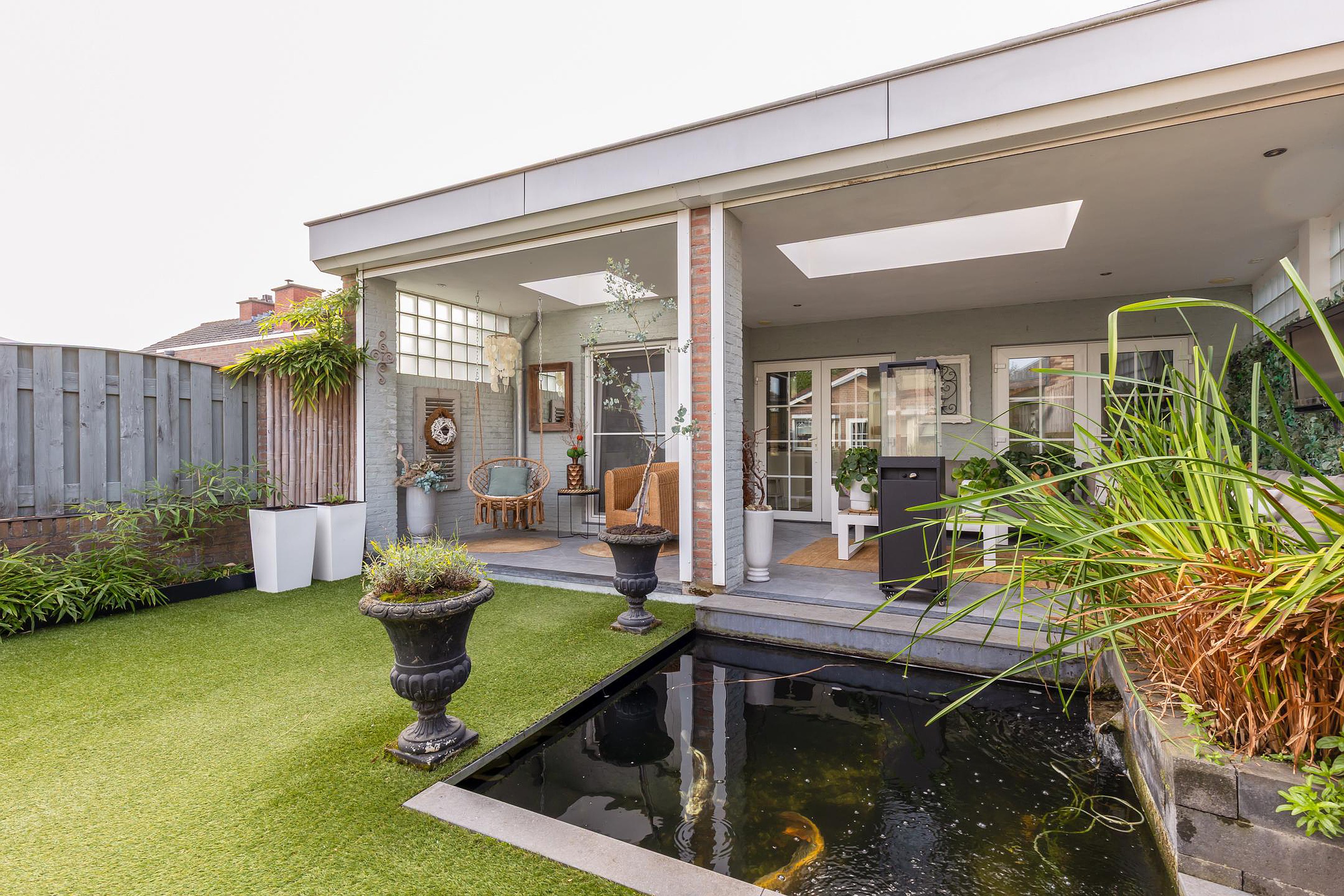 Tuin voortuin, gezellige achtertuin met diverse zitgelegenheden waardoor je altijd van de zon of schaduw kunt genieten en met grote aangebouwde overkapping (23m2), vrijstaande overkapping (12m2), koivijver, zwembad, grote garage (36m2) met kap/zolder, elektrische sectionaalpoort en toilet, ruime oprit voor 3 auto’s. Toegang tot perceel via oprit aan achterzijde.