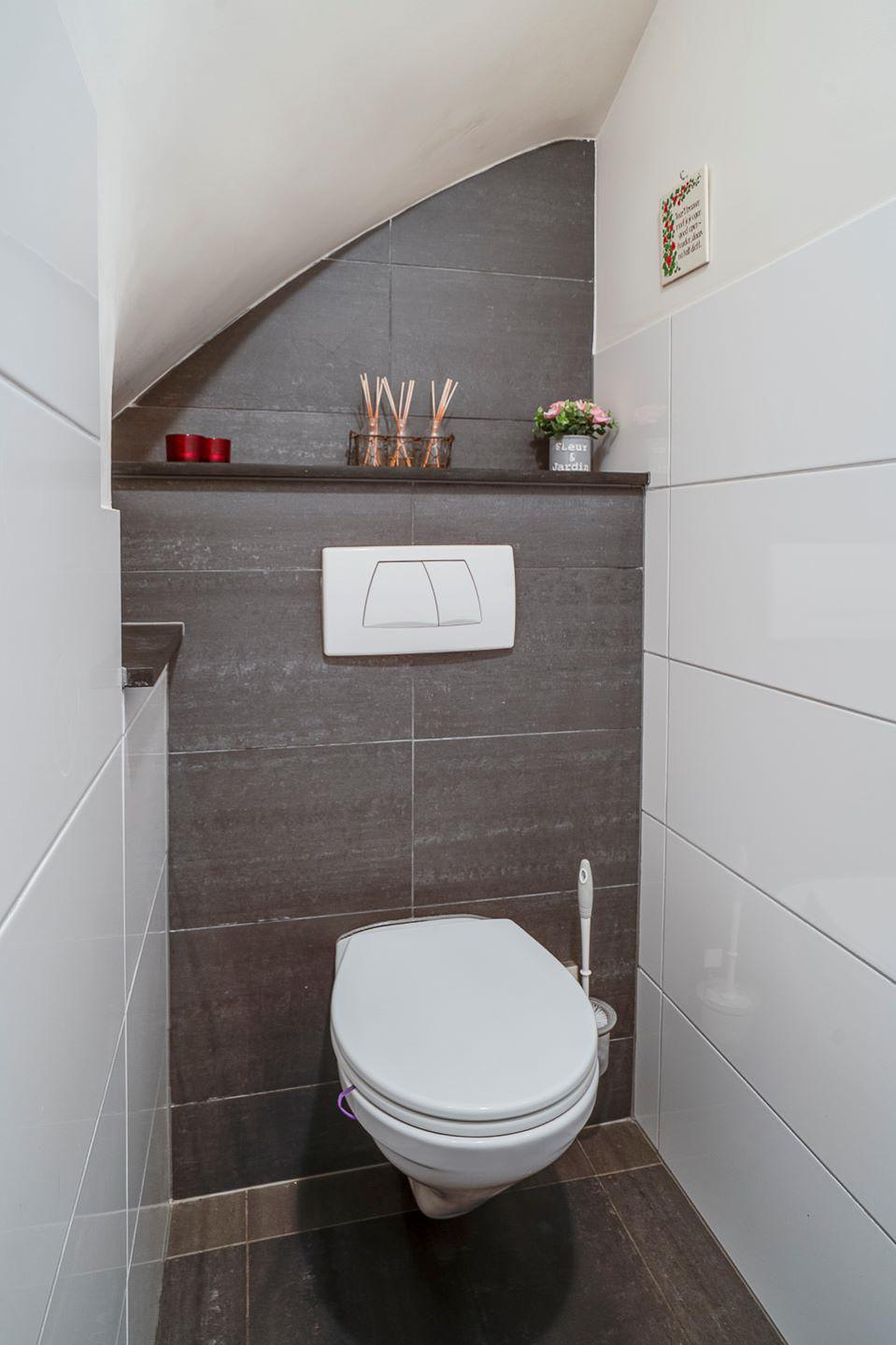 In het midden van de living bevindt zich, achter een stijlvolle deur, de opgang naar de eerste verdieping alsmede het moderne en ruim opgezette gastentoilet.